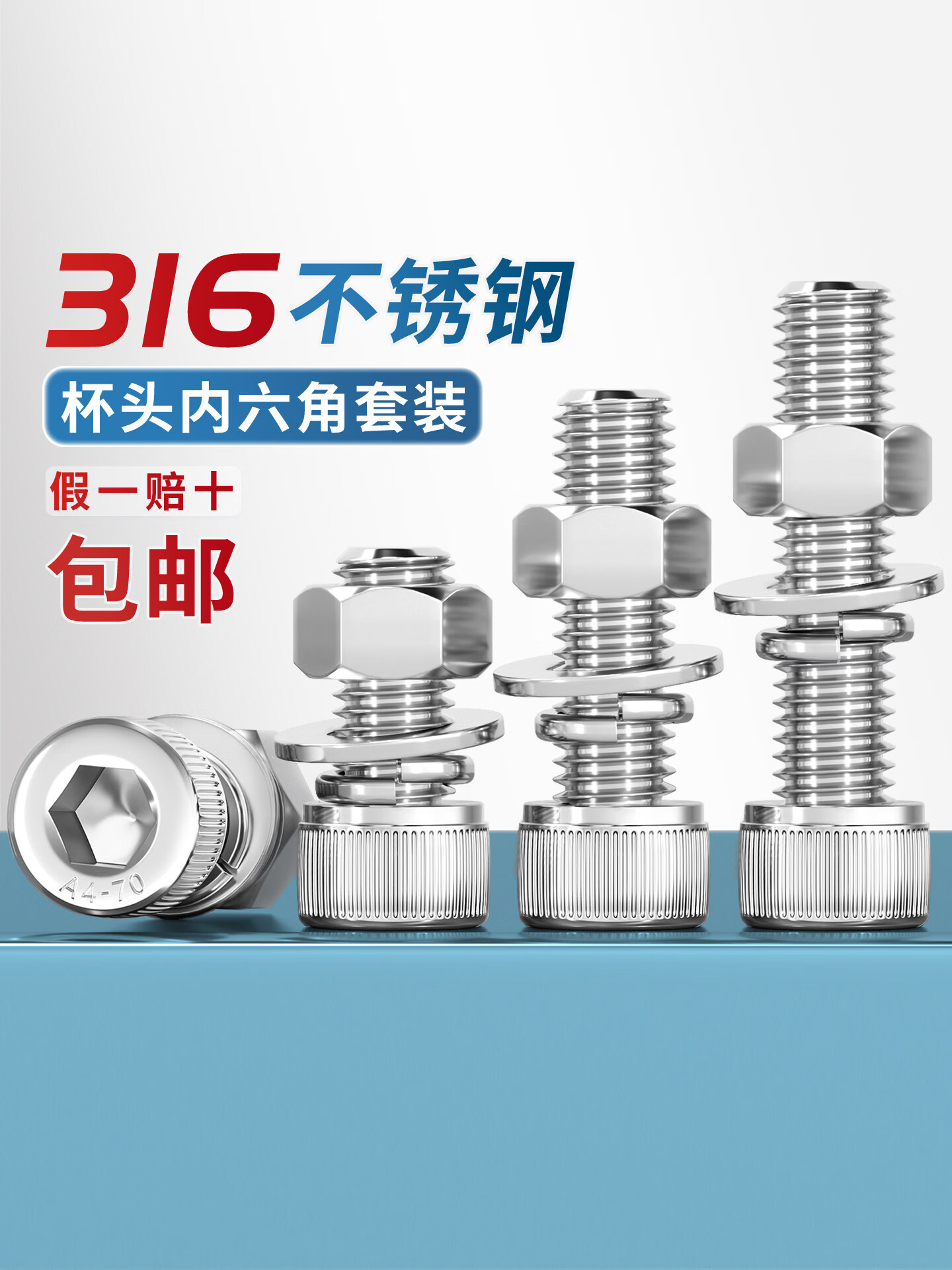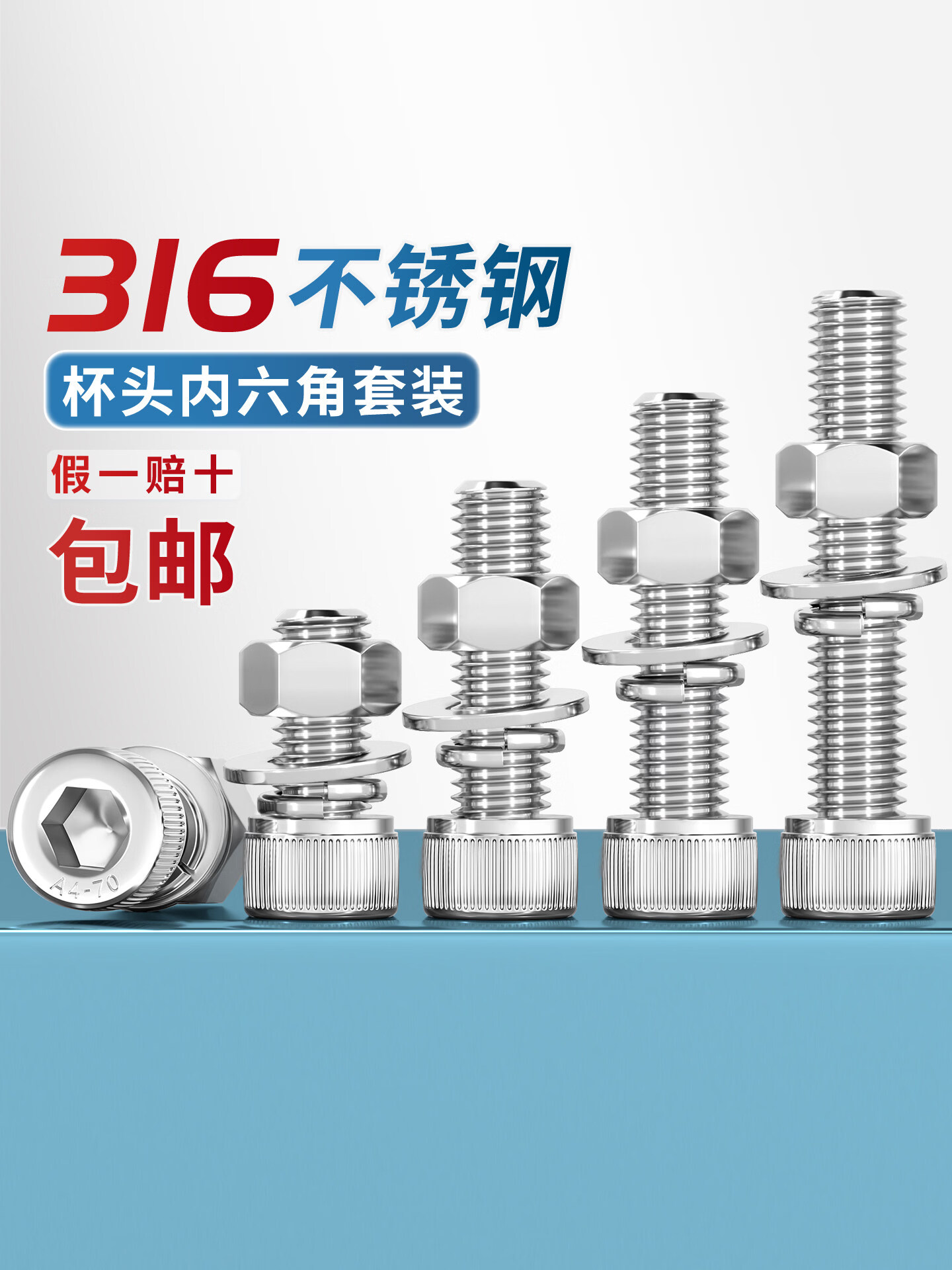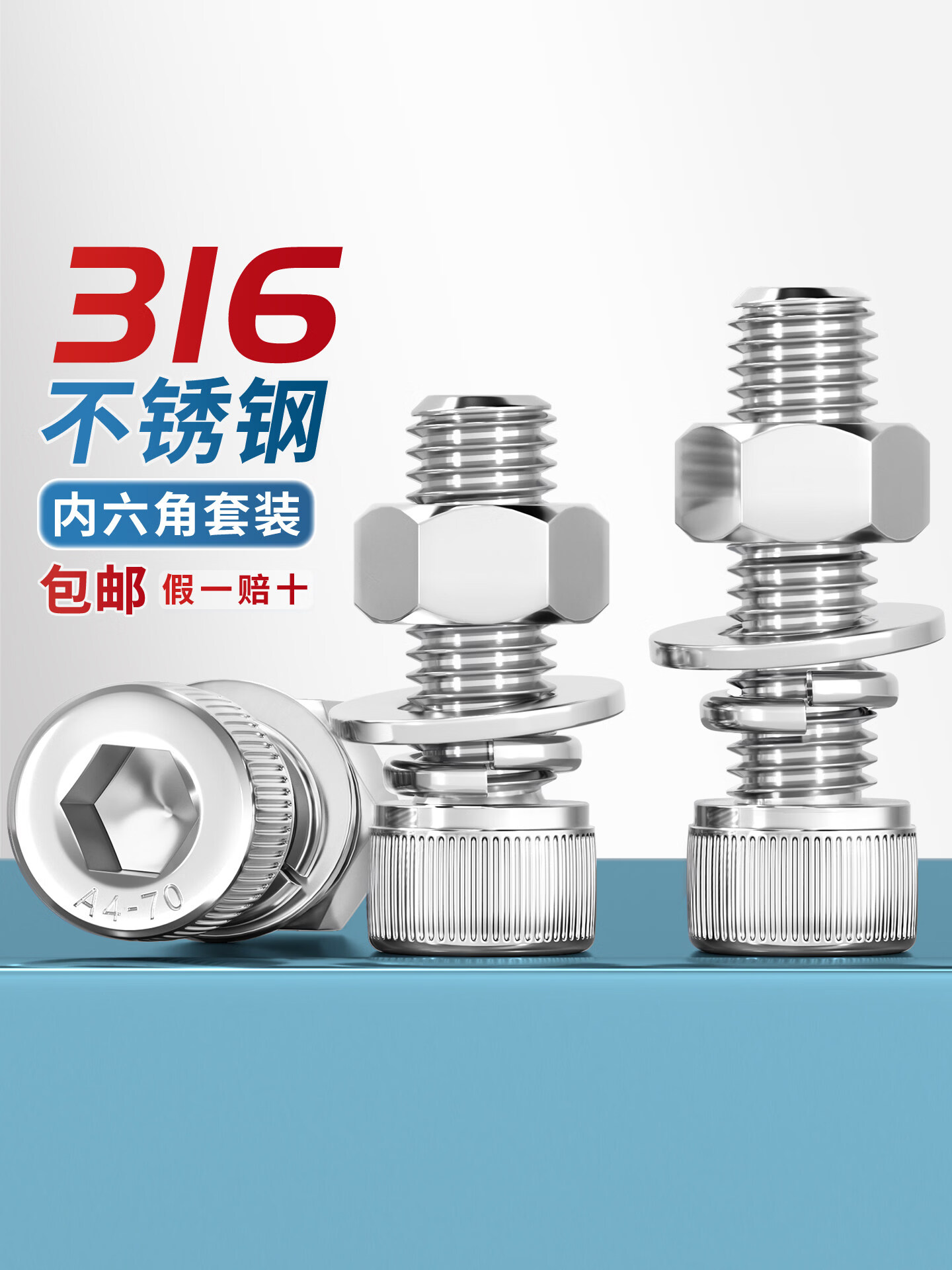 天卓五金316不锈钢内六角螺丝螺母套装配件大全垫片弹垫螺帽M2M3M4M5-M24 M2*4-50套