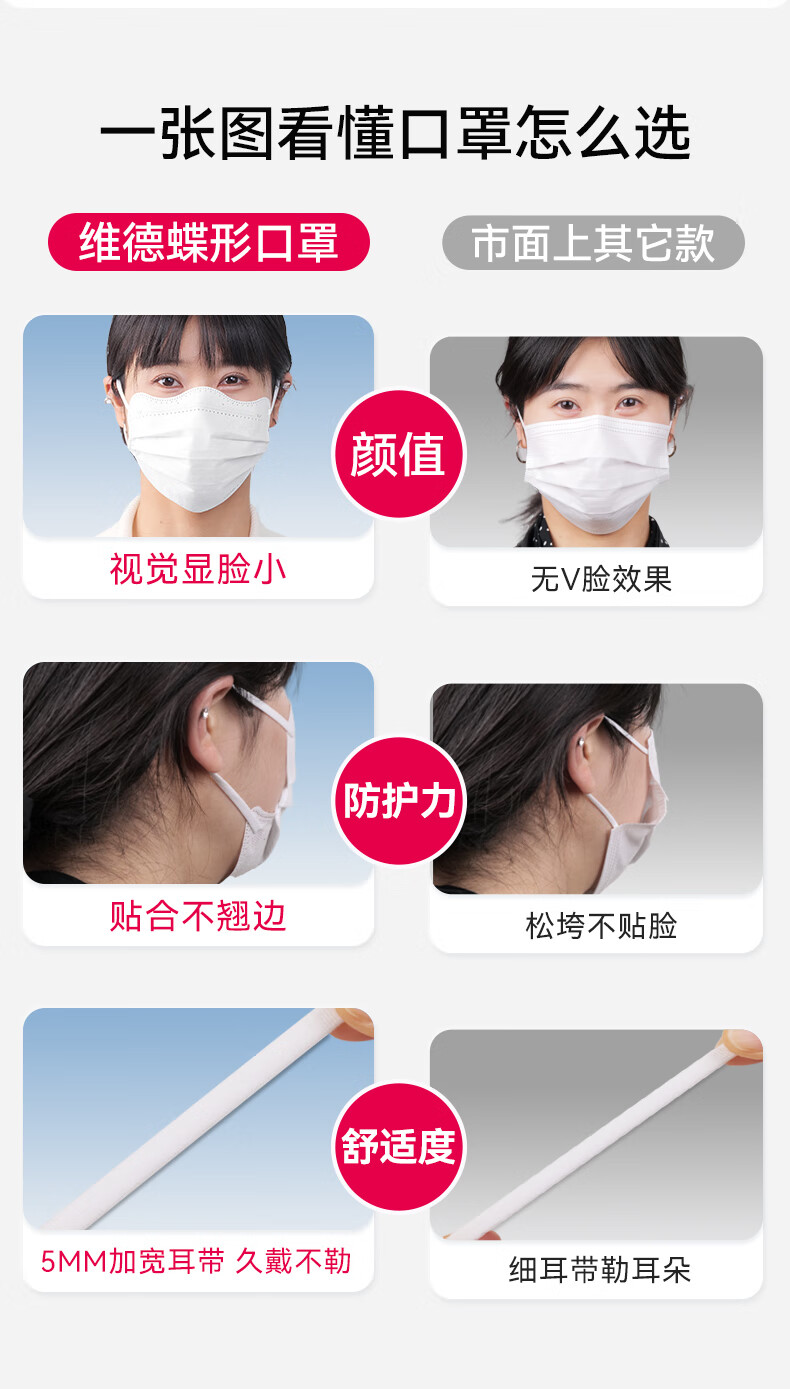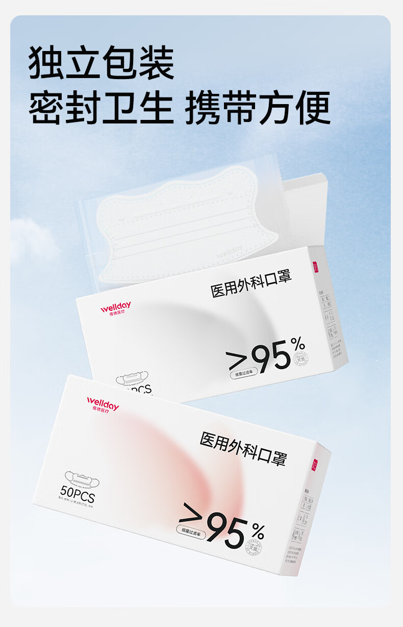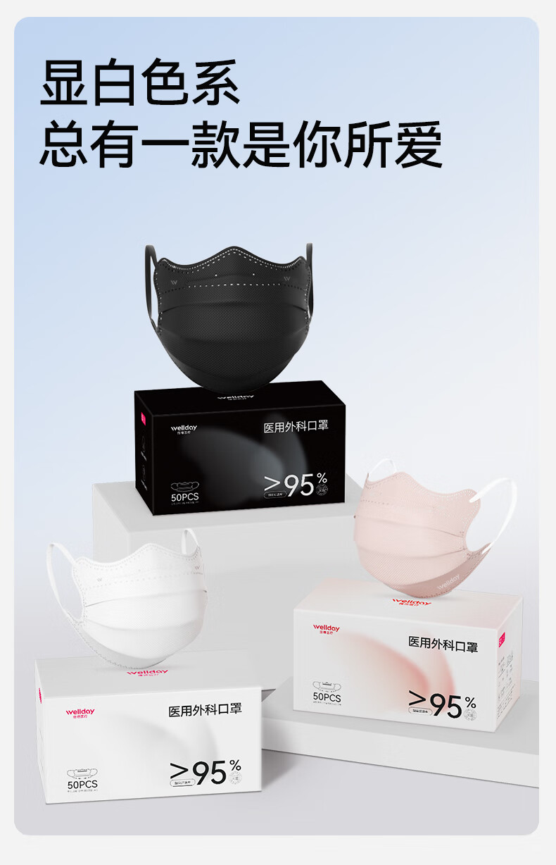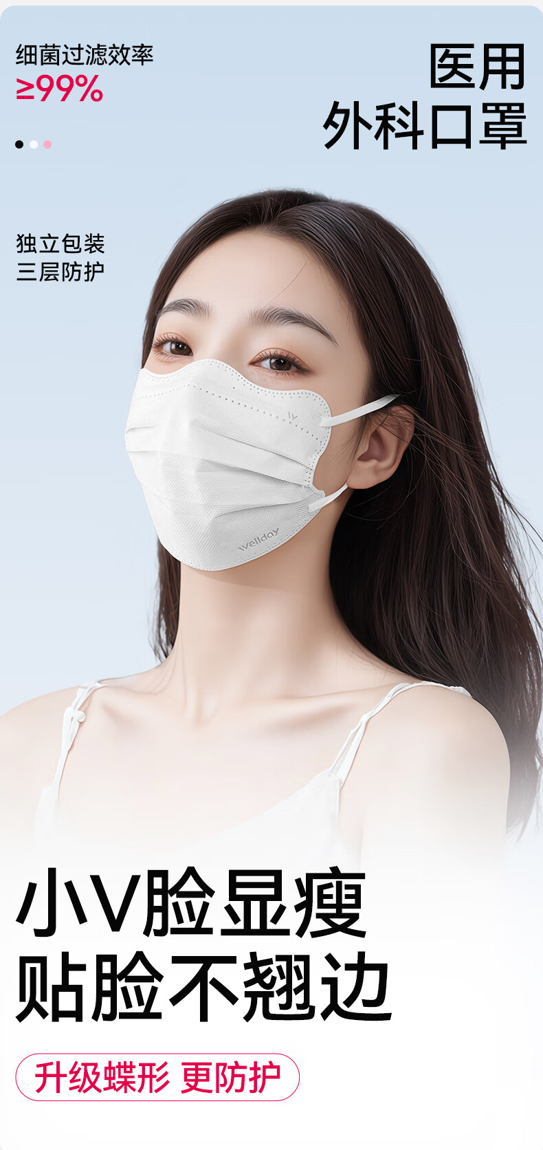 维德(WELLDAY)医用外科口罩一次性口罩独立包装修饰脸型防花粉尘雾霾透气 【蝶型白色】50只/盒 【1盒】50只