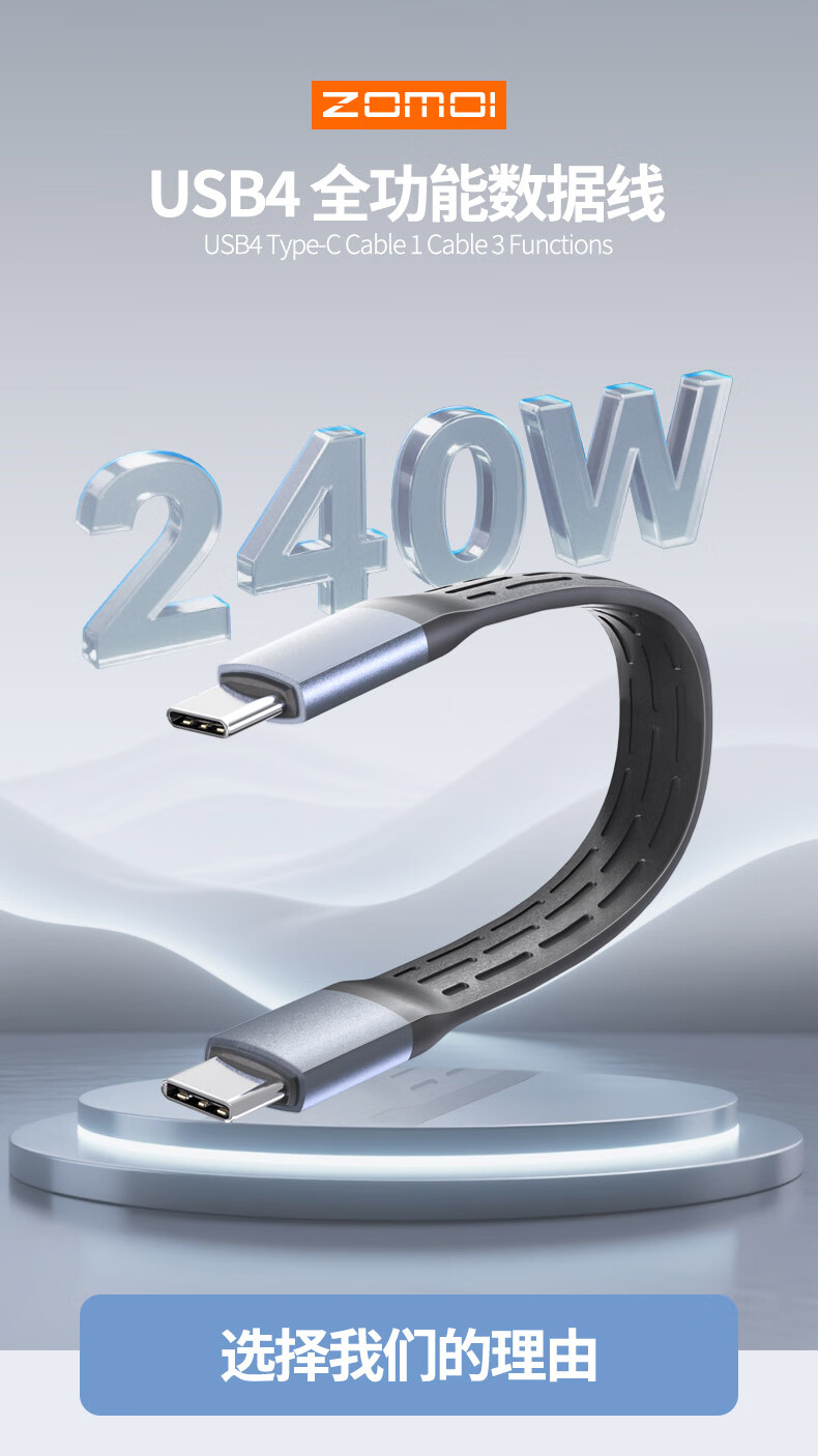 ZOMOI短线USB4数据线Type-C全功能ctoc兼容雷电4双头240W快充40Gbps高速传输PD3.1适用手机电脑移动硬盘 USB4 40G【兼容雷电3/4】 灰色