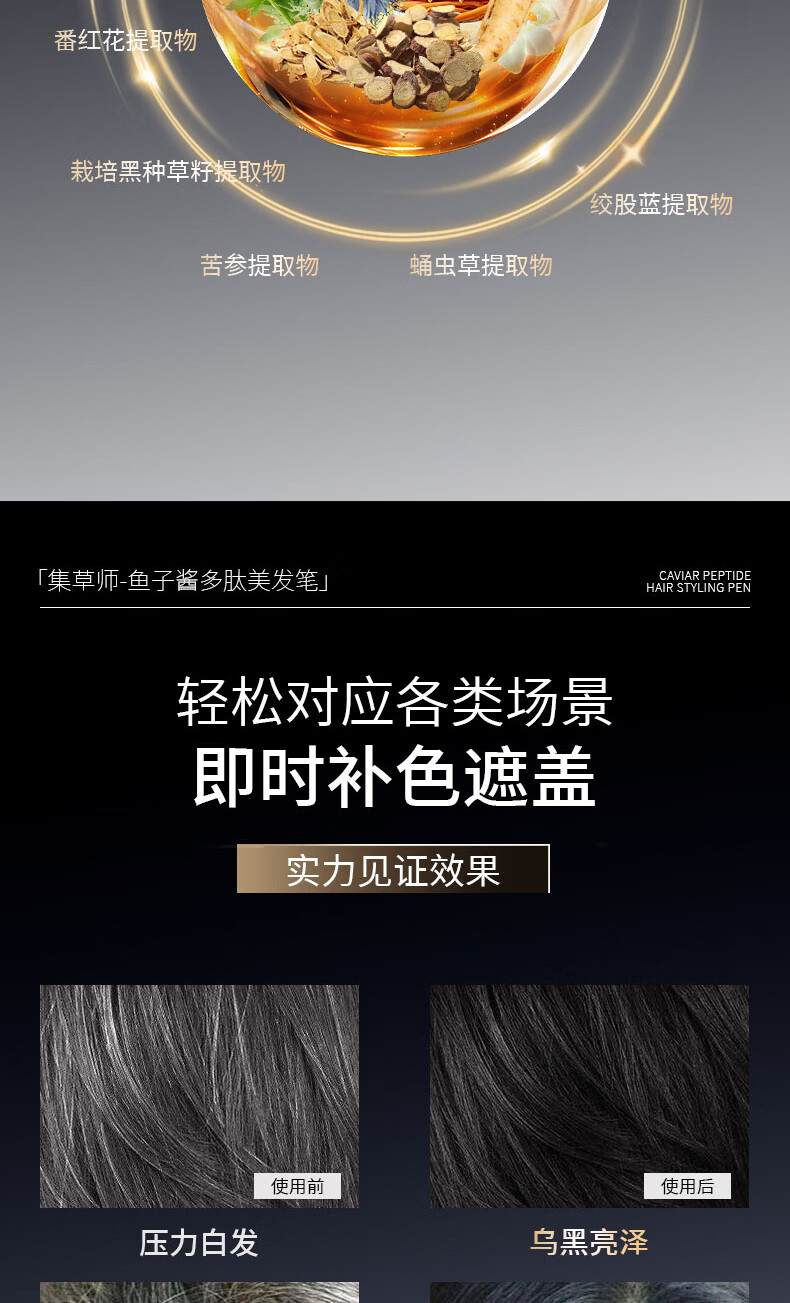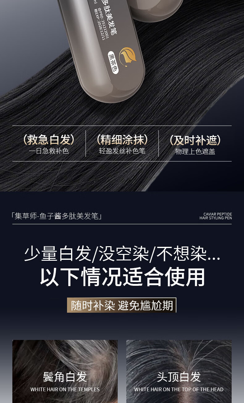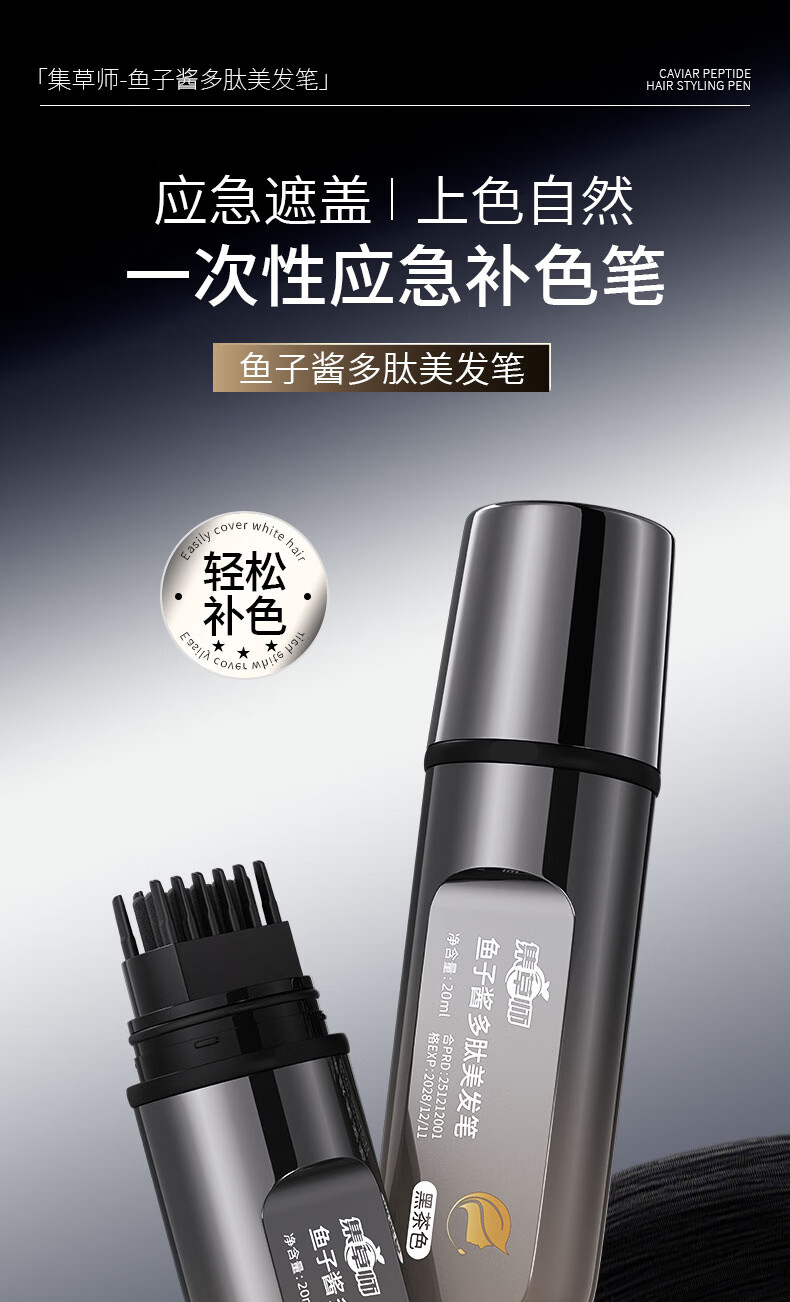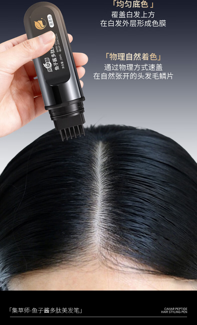 集草师新款鱼子酱美发棒植物遮盖白发神器一次性染发棒不掉色染发笔补染 自然黑*1+黑茶色*1【一梳盖白】黑金版