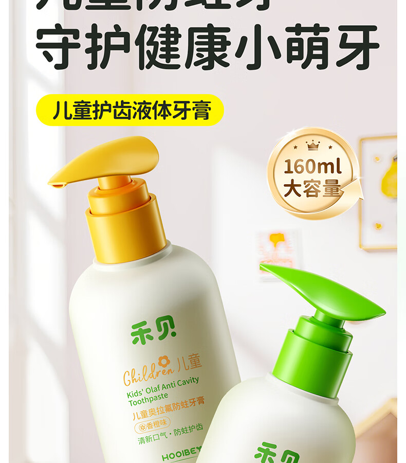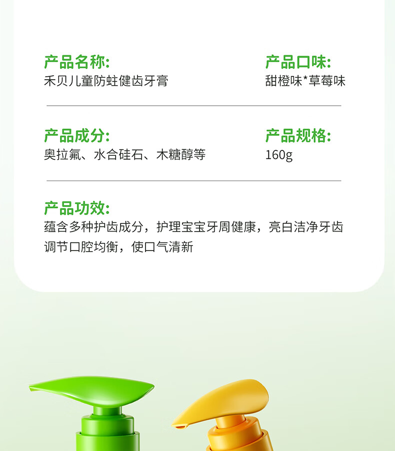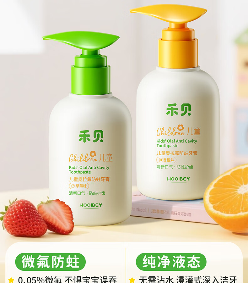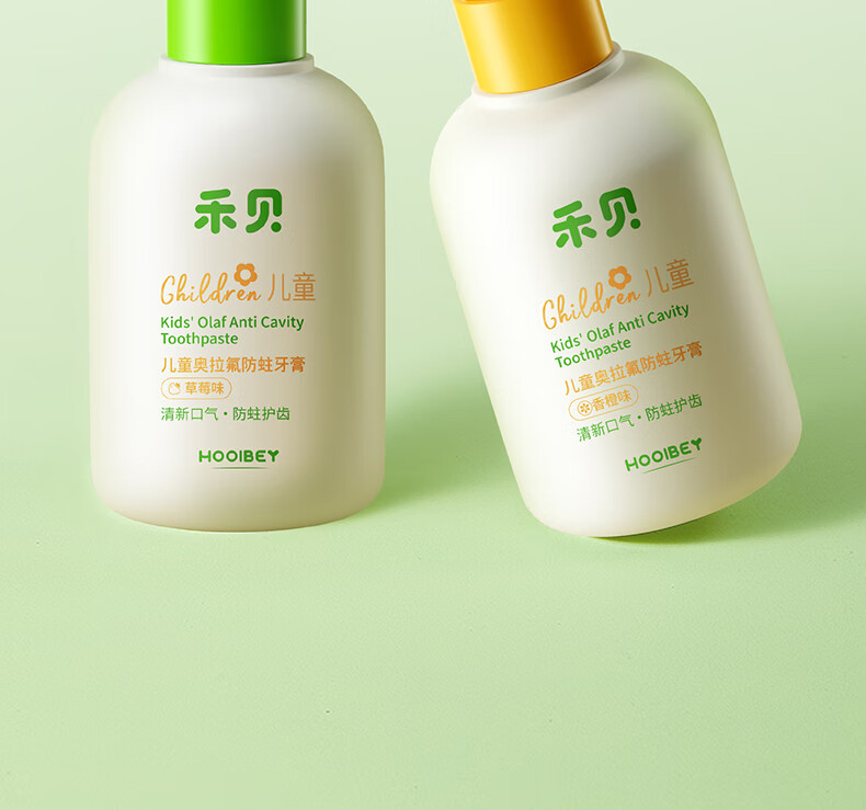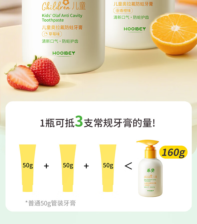 禾贝奥拉氟儿童牙膏防蛀防龋固齿1-12岁换牙期果味不辣口160g大容量 【拍1发2】香橙味*1+草莓味*1