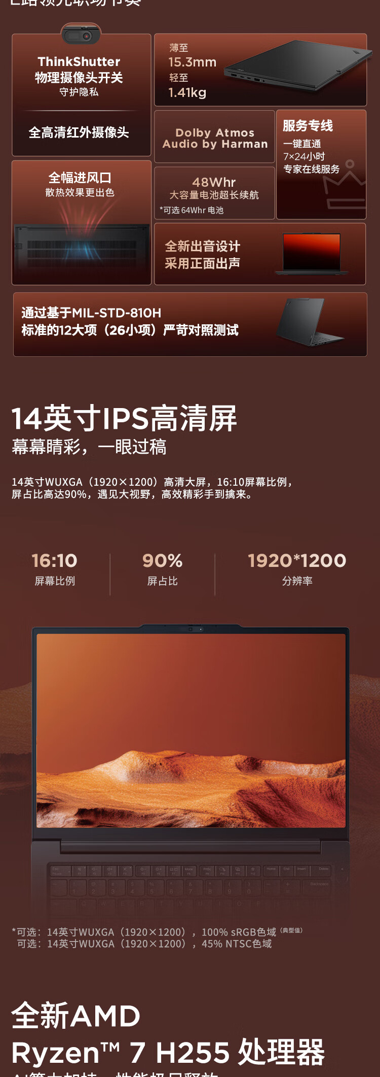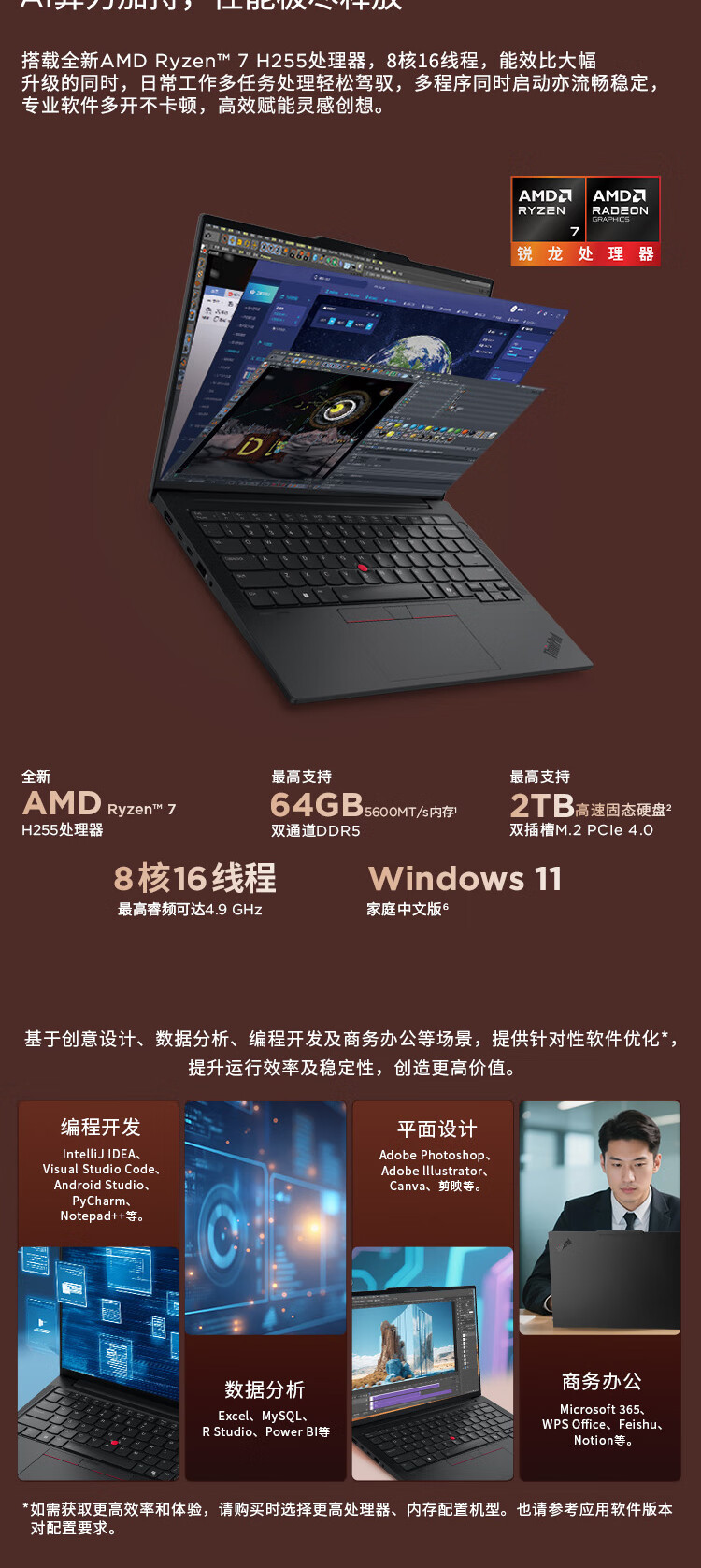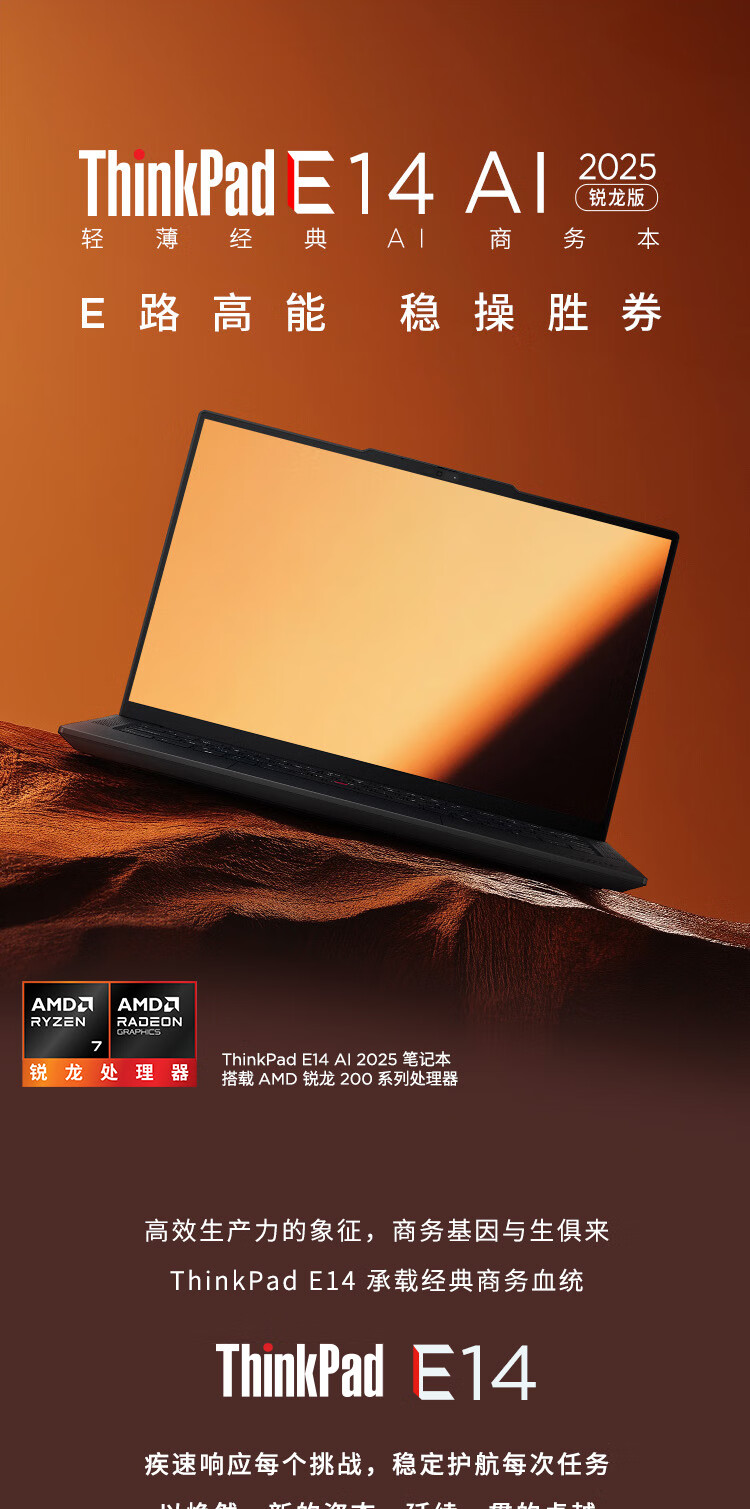 ThinkPad【国家补贴20%】E14 联想轻薄便携笔记本电脑 锐龙R7-H255 32G 1TB 黑 高效办公AI PC