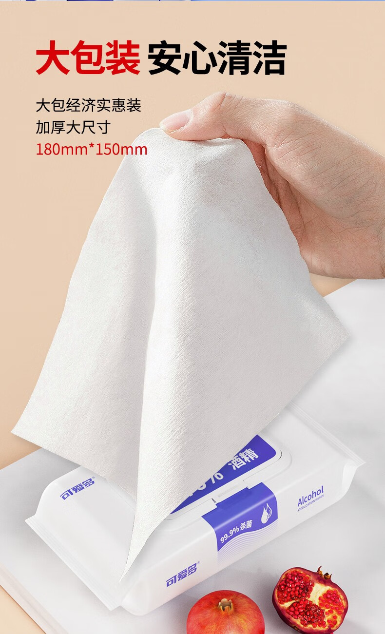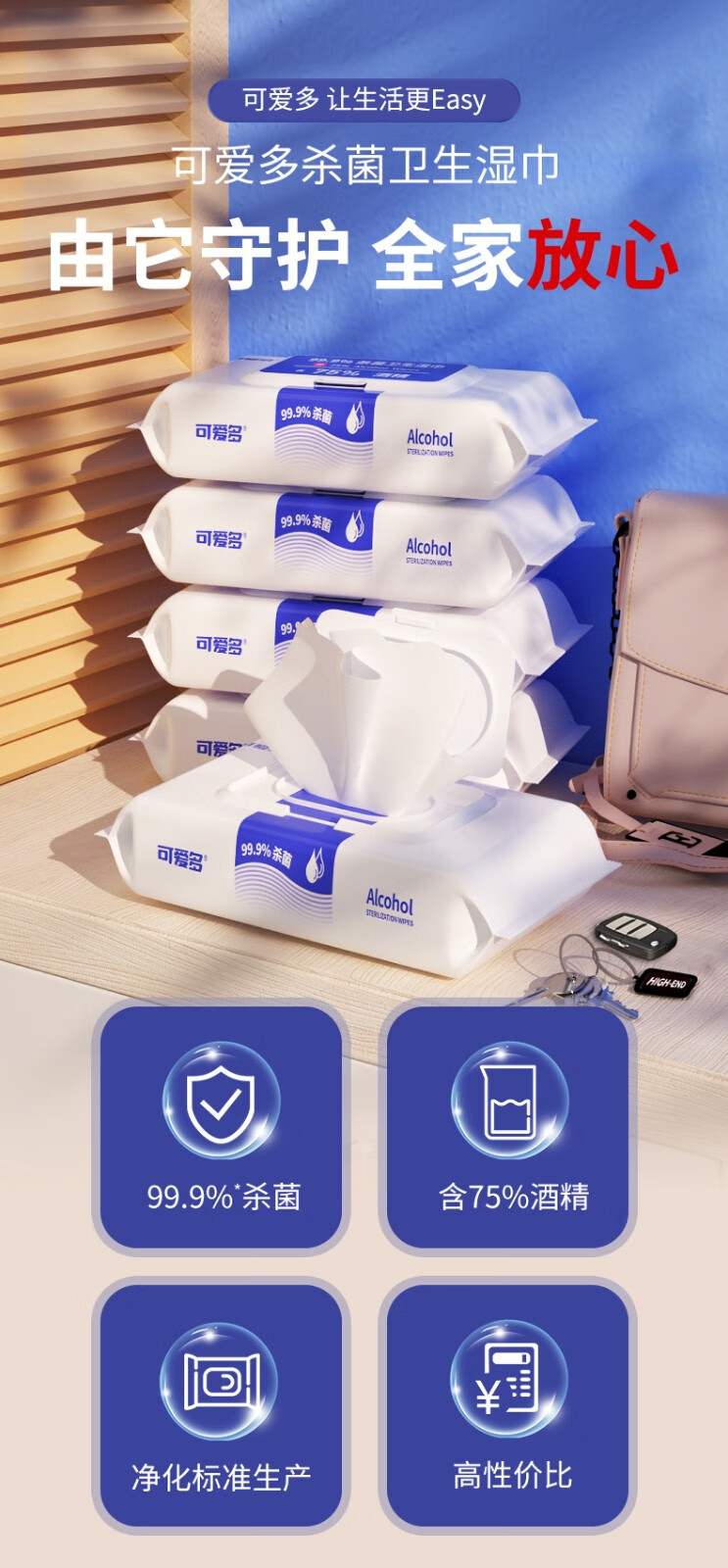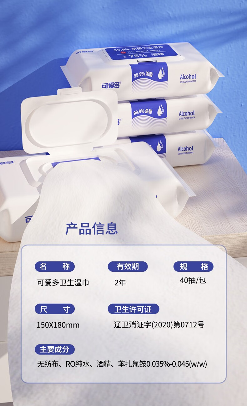 可爱多含75度酒精湿巾纸巾清洁消毒杀菌大包实惠学生办公家用卫生 40抽*4包