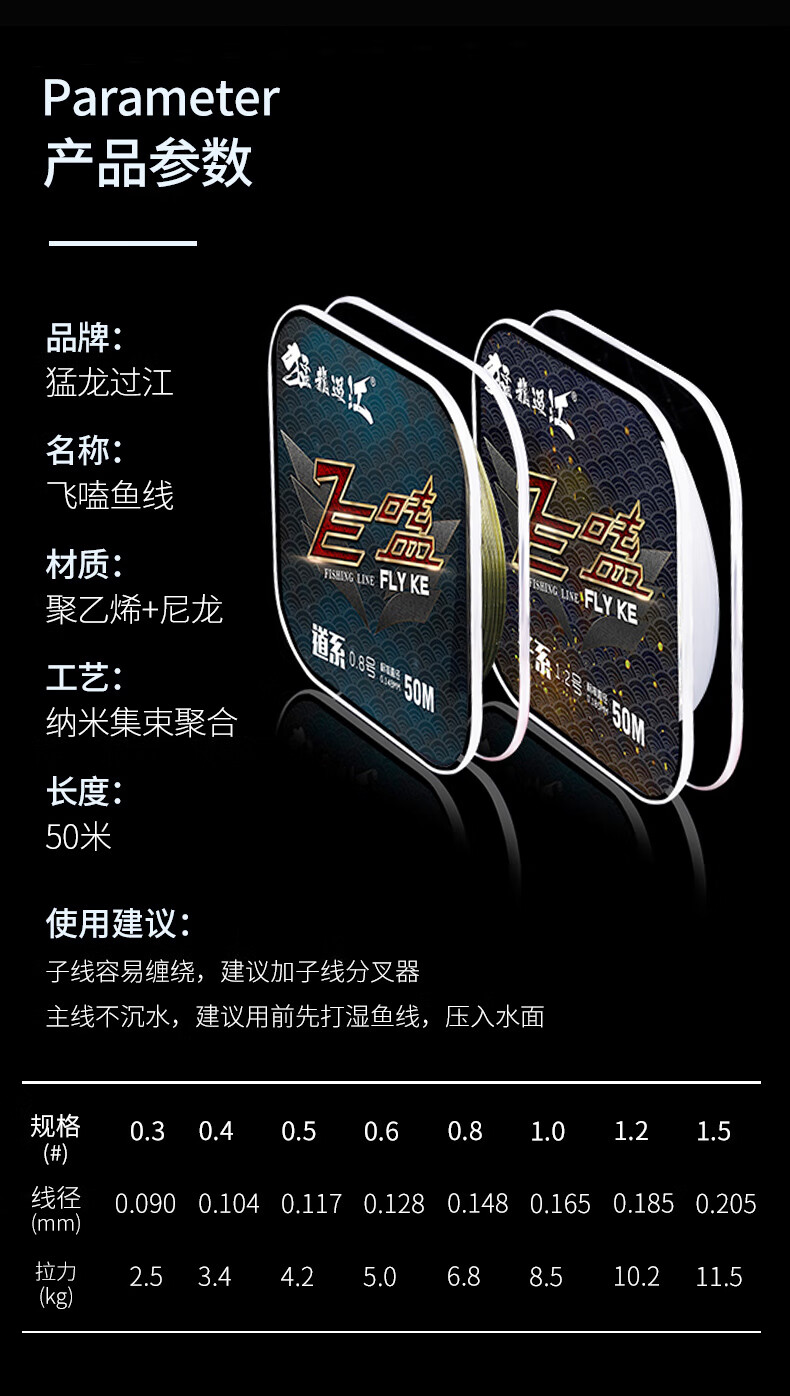 宰搂碳芯飞磕大力马钓鱼线pe主线强拉力柔软子线罗非黑坑防咬 子线50米半透明 0点3号