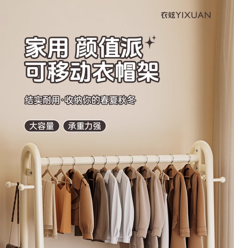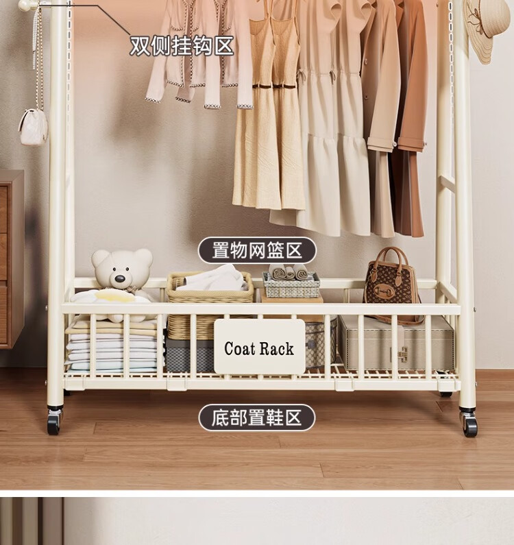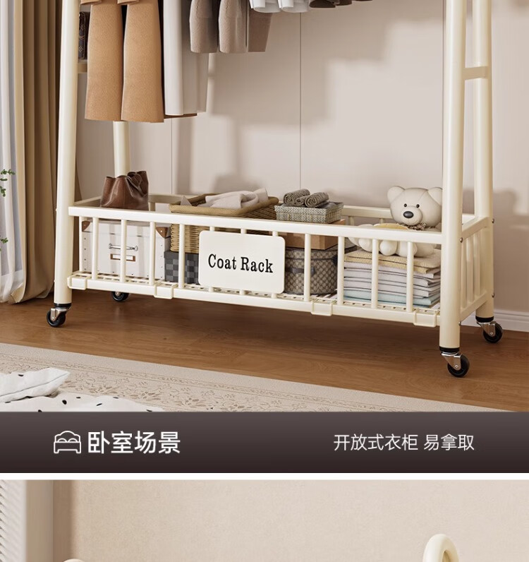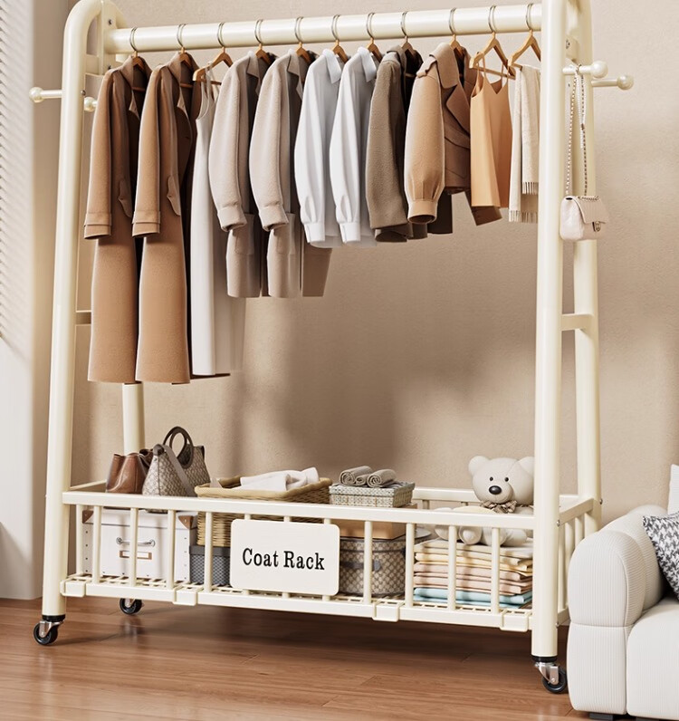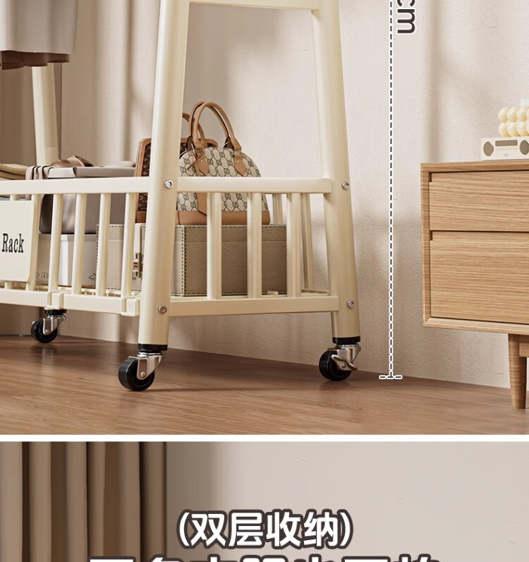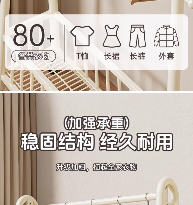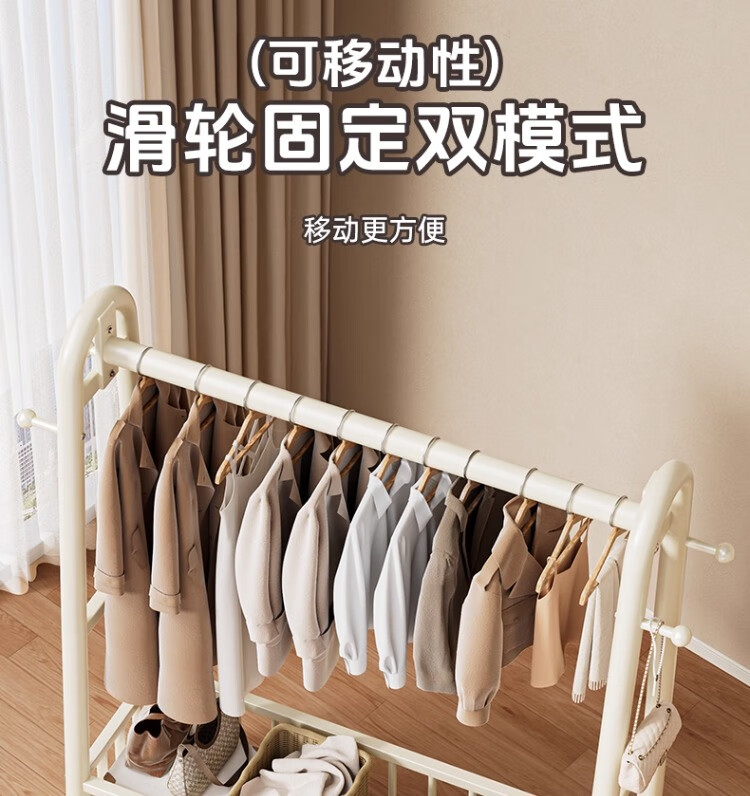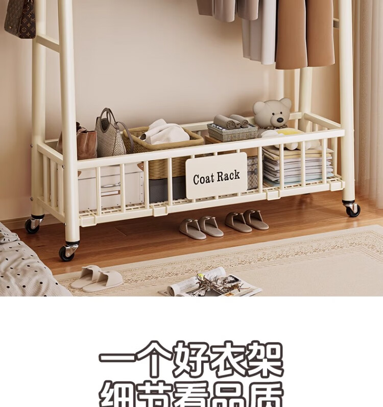 衣炫简易衣帽架落地卧室阳台家用室内挂衣架可移动晾衣架衣服收纳架子 【特粗25管】奶油白长80 加深网篮+金属轮