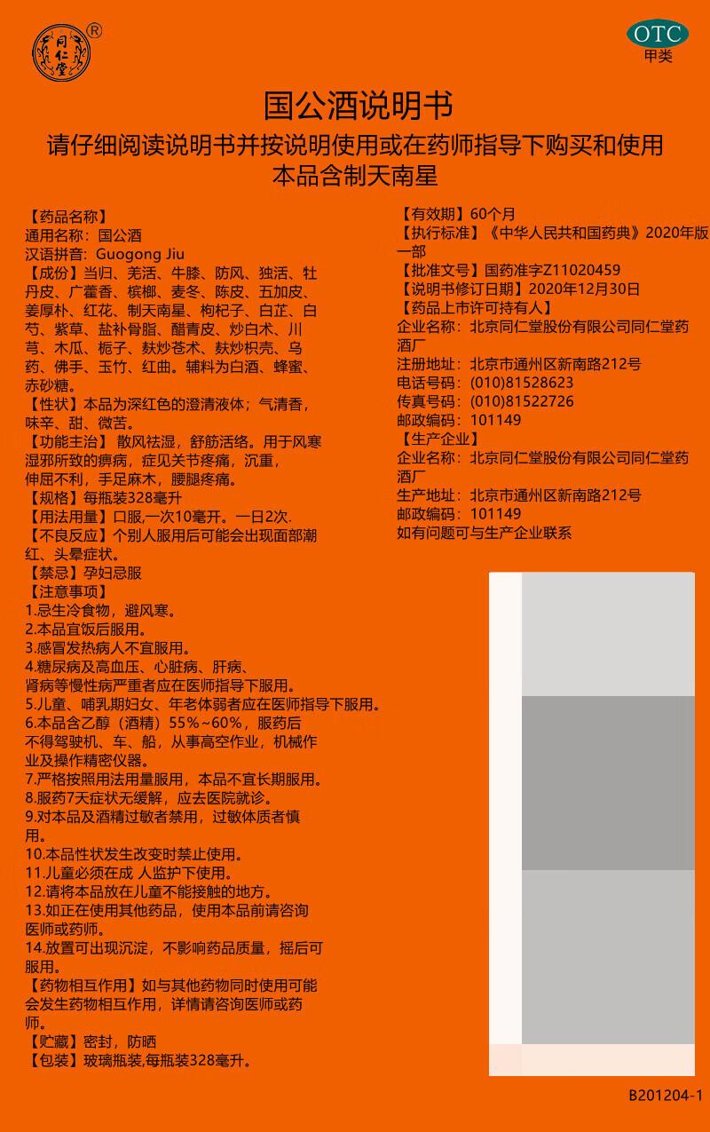 同仁堂 国公酒 328ml 散风祛湿 舒筋活络 症见关节疼痛 屈伸不利 手足麻木 腰腿疼痛