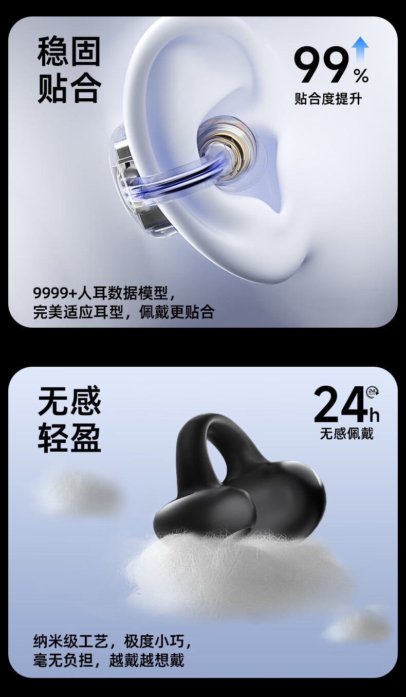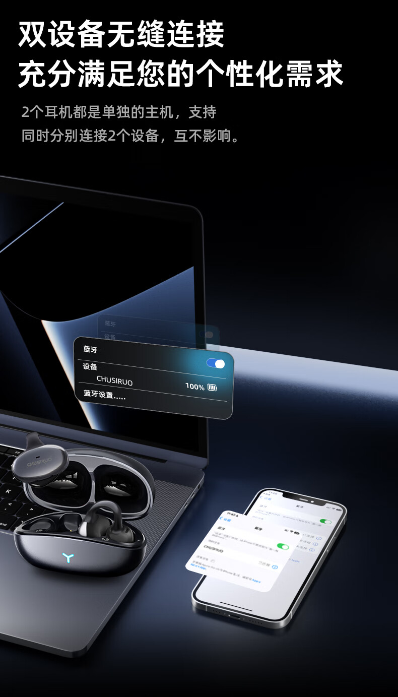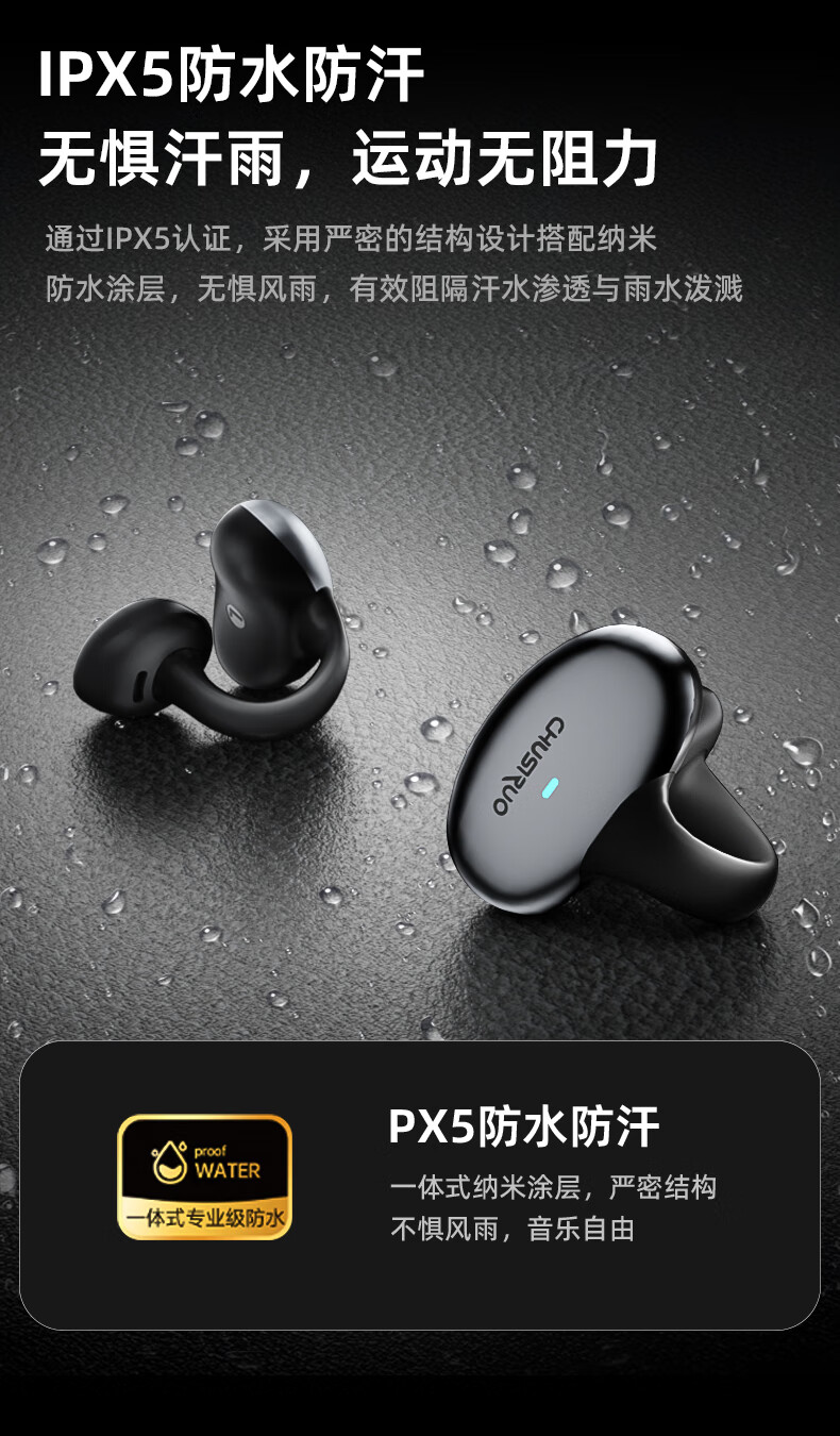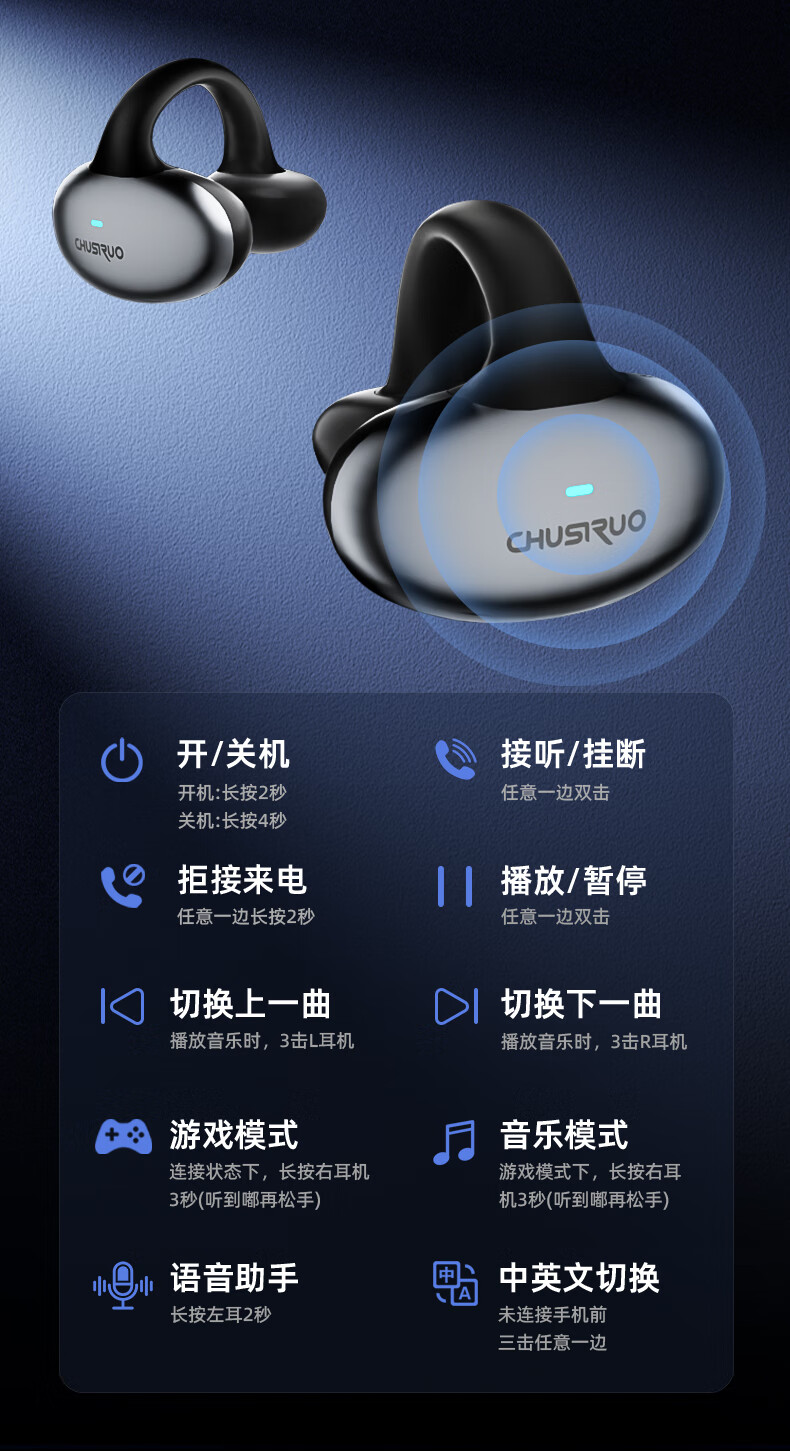 CHUSIRUO【柏林之声丨全景音效】2025新款无线蓝牙耳机耳夹式不入耳通话降噪超长续航音乐耳机适配华为苹果 冠军版-曜夜黑