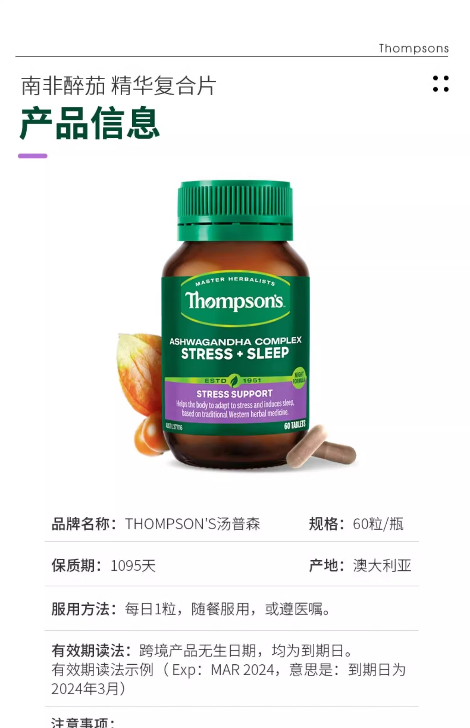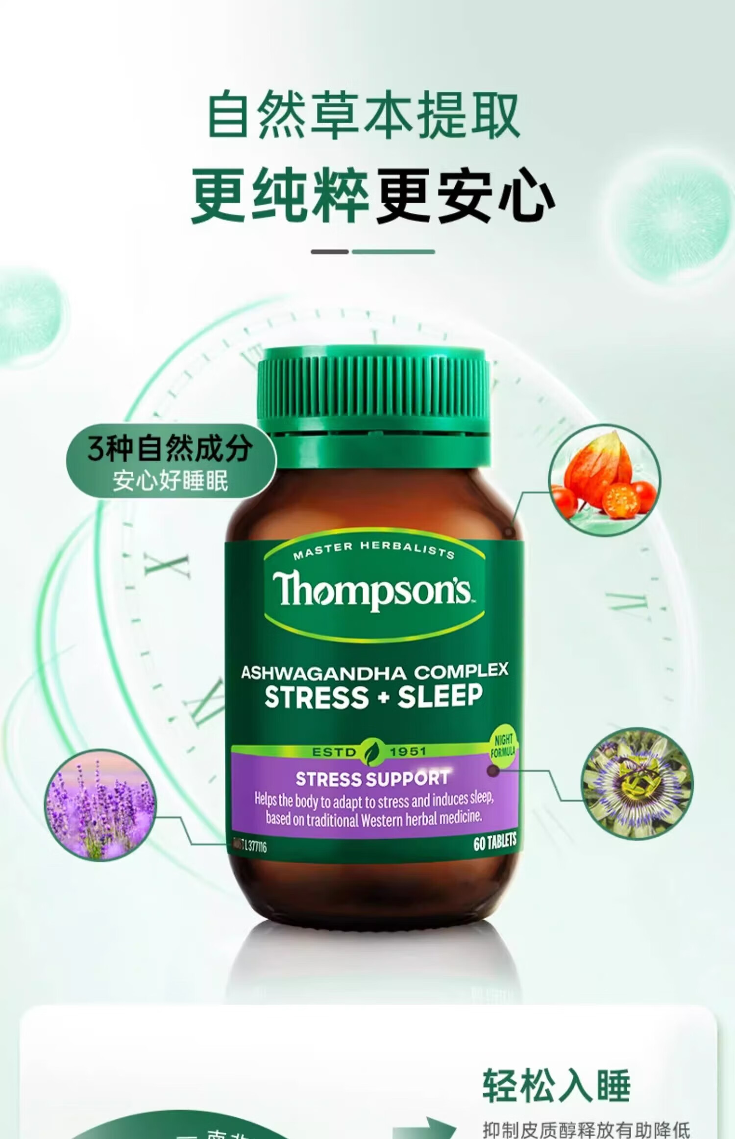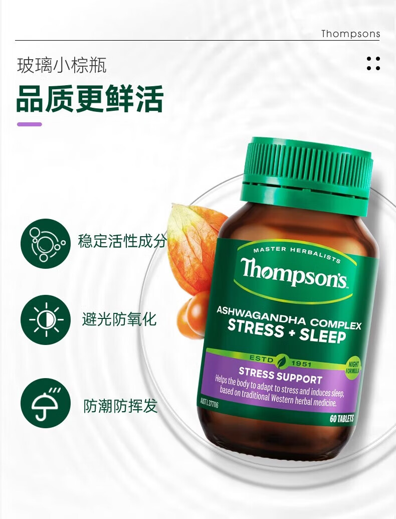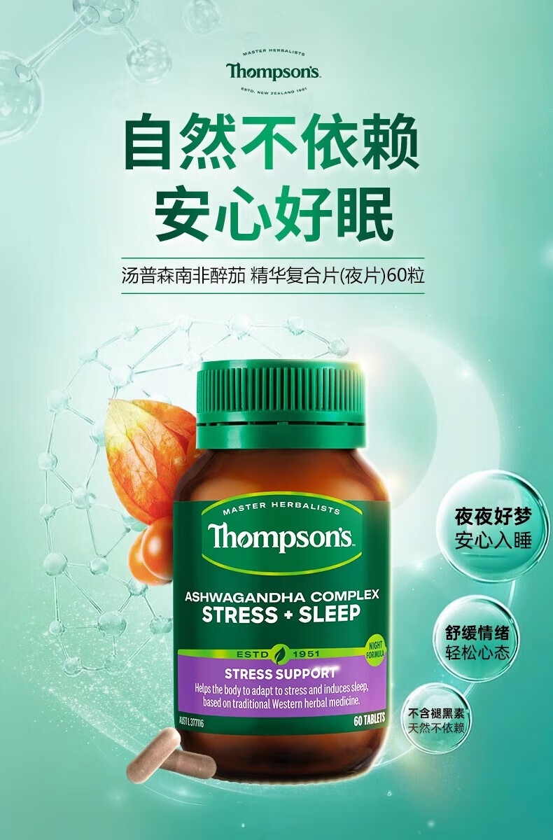THOMPSON'S汤普森 Thompson's 南非醉茄夜片60片/瓶 缓解压力 促进健康睡眠 醉茄夜片60片/瓶
