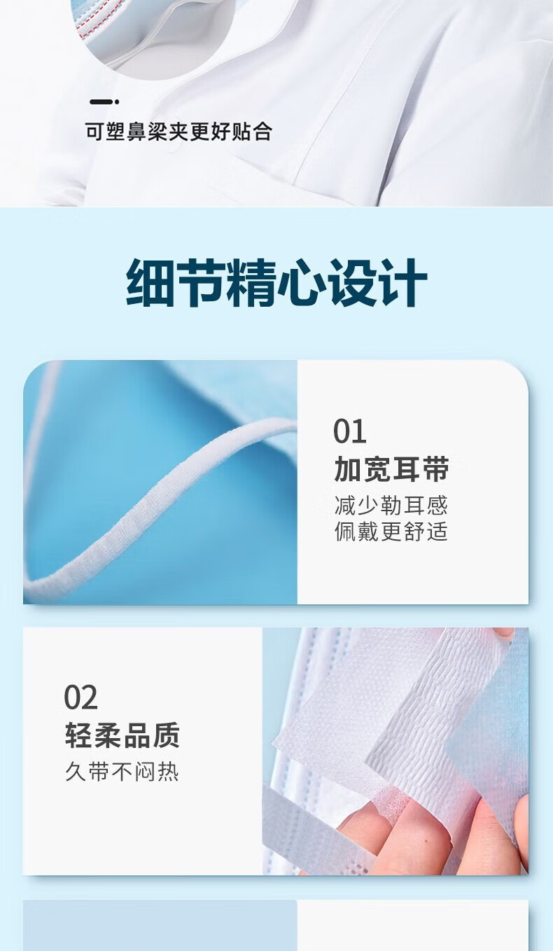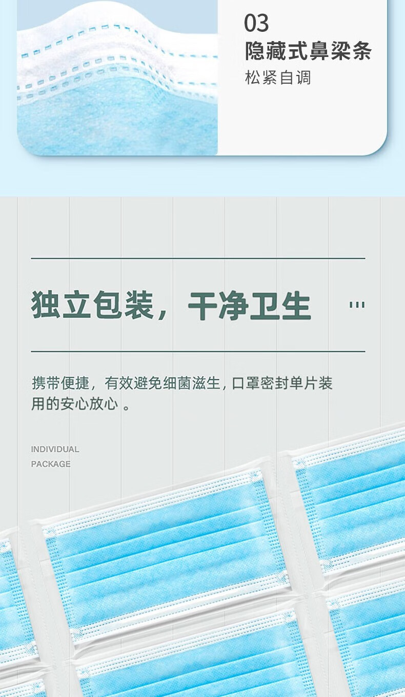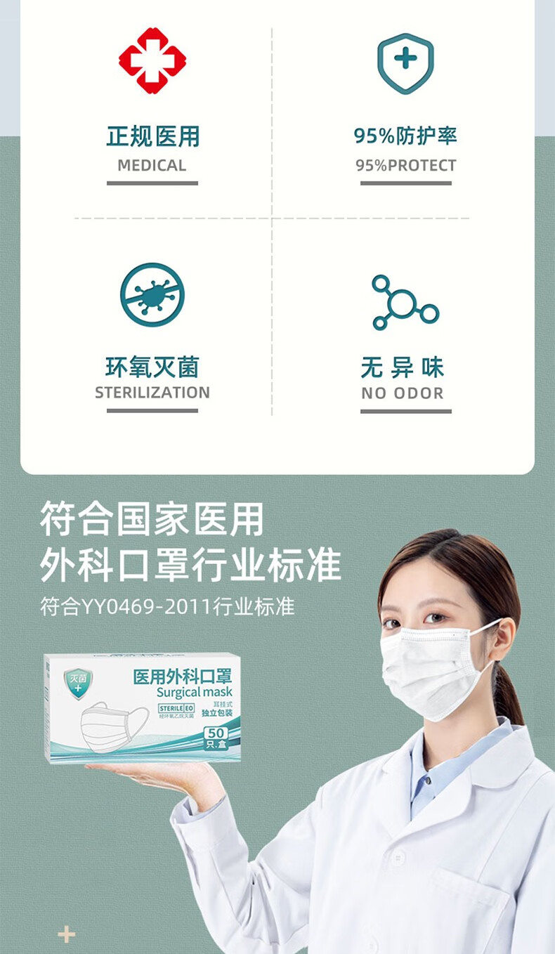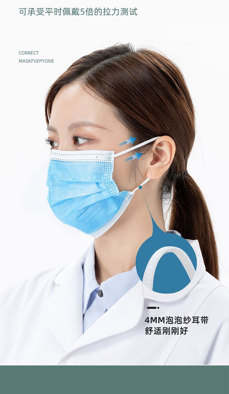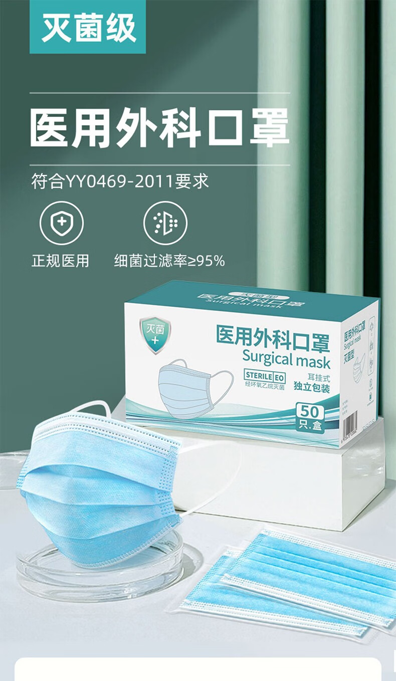 顶格一次性医用外科口罩独立装无菌级成人医用口罩三层透气亲肤不勒耳 蓝色 成人款【灭菌级100只】袋装