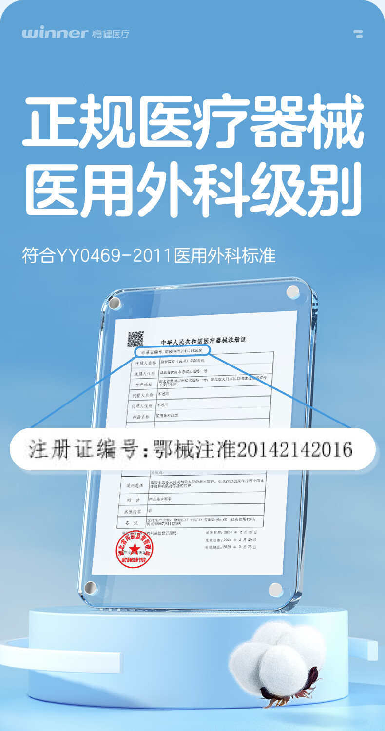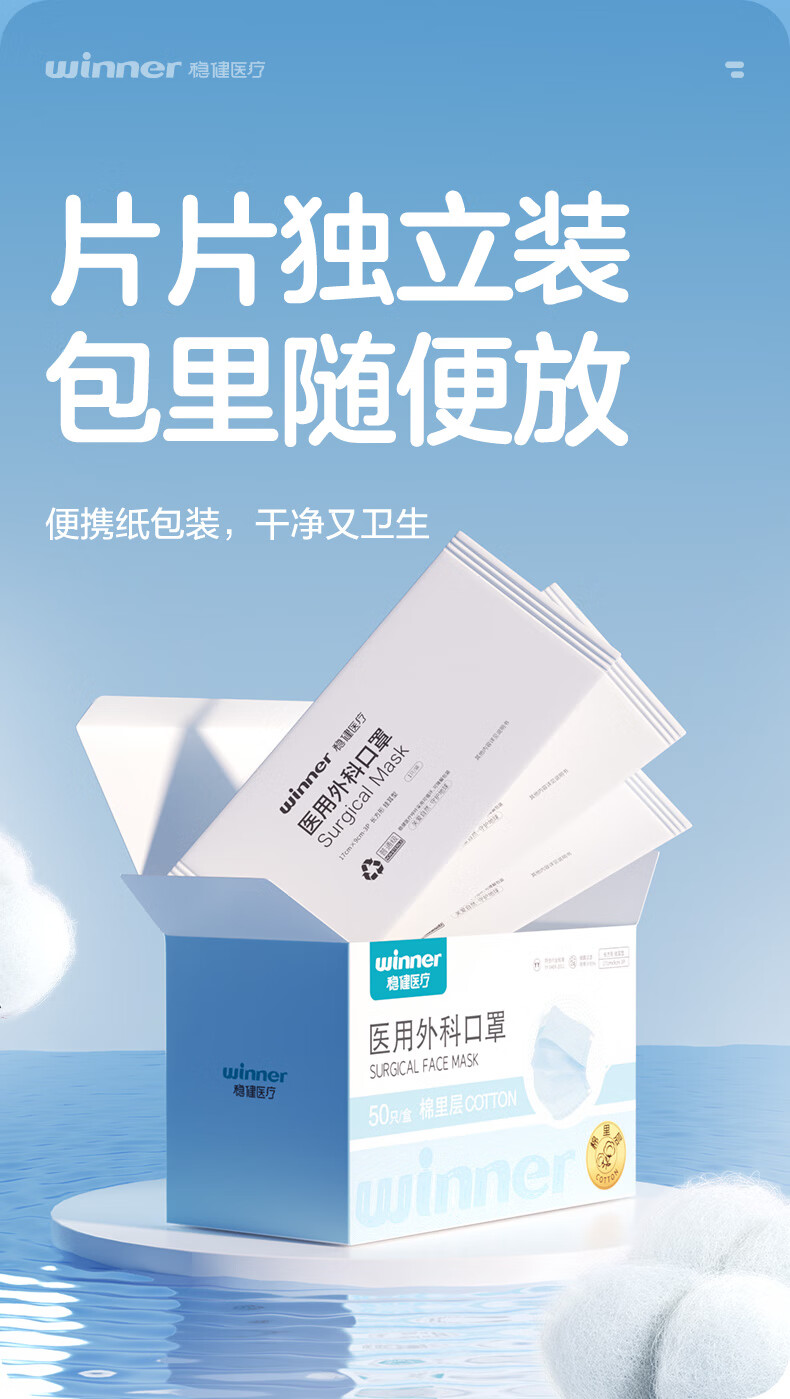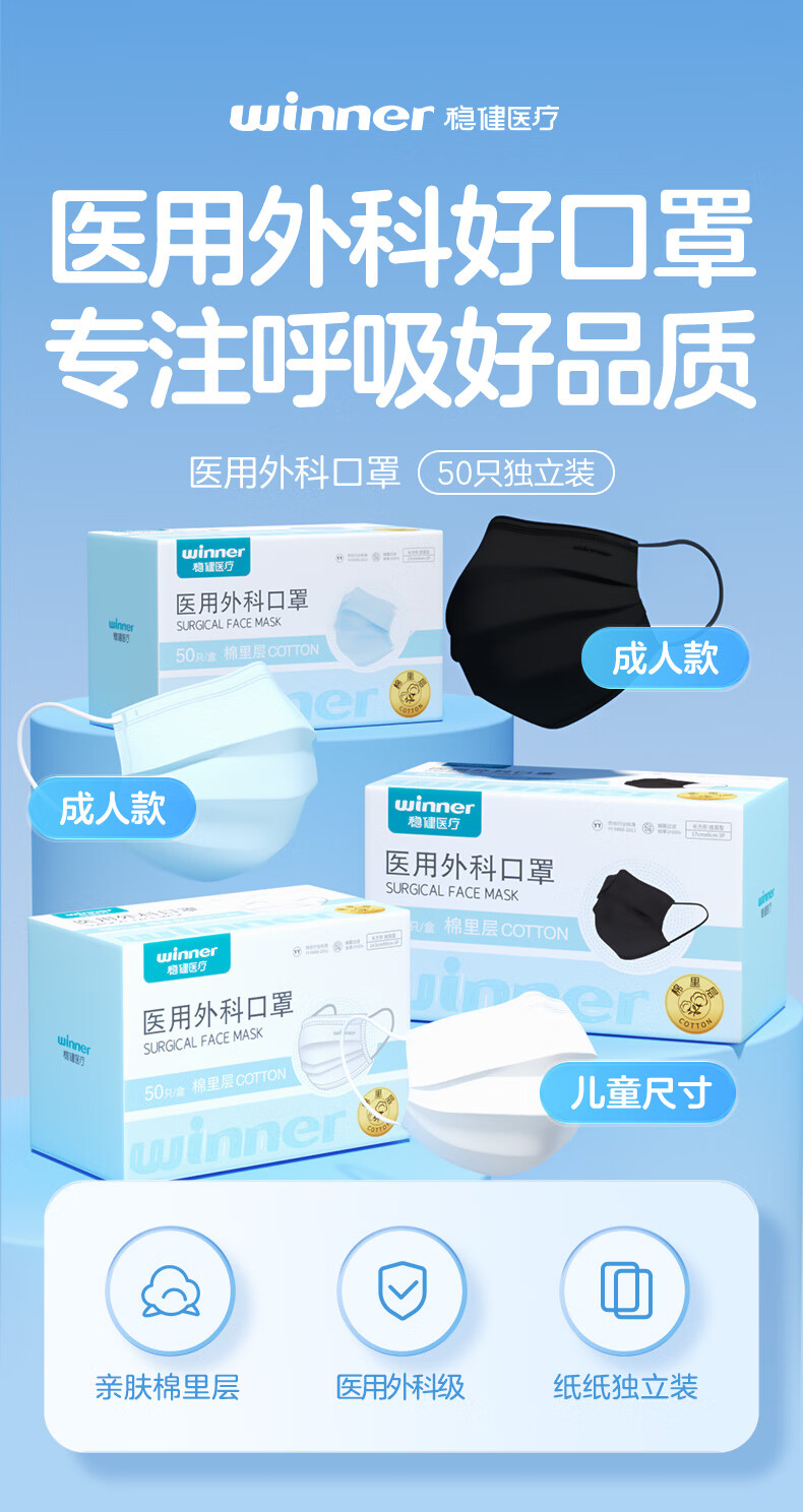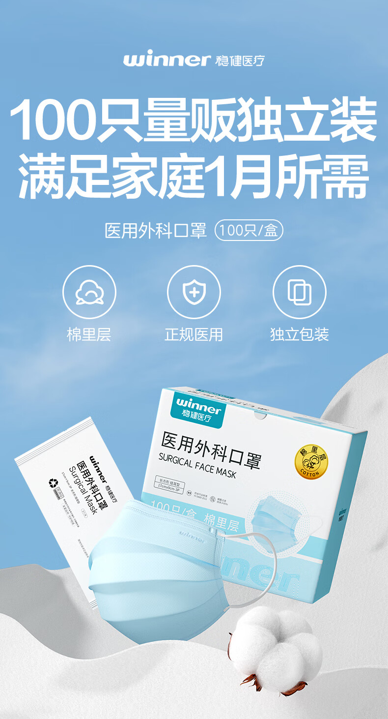 稳健口罩医用外科口罩一次性医用口罩防细菌冬季防流感独立干净卫生 【升级棉里层】50只/盒 成人蓝色 独立包装 1只/袋