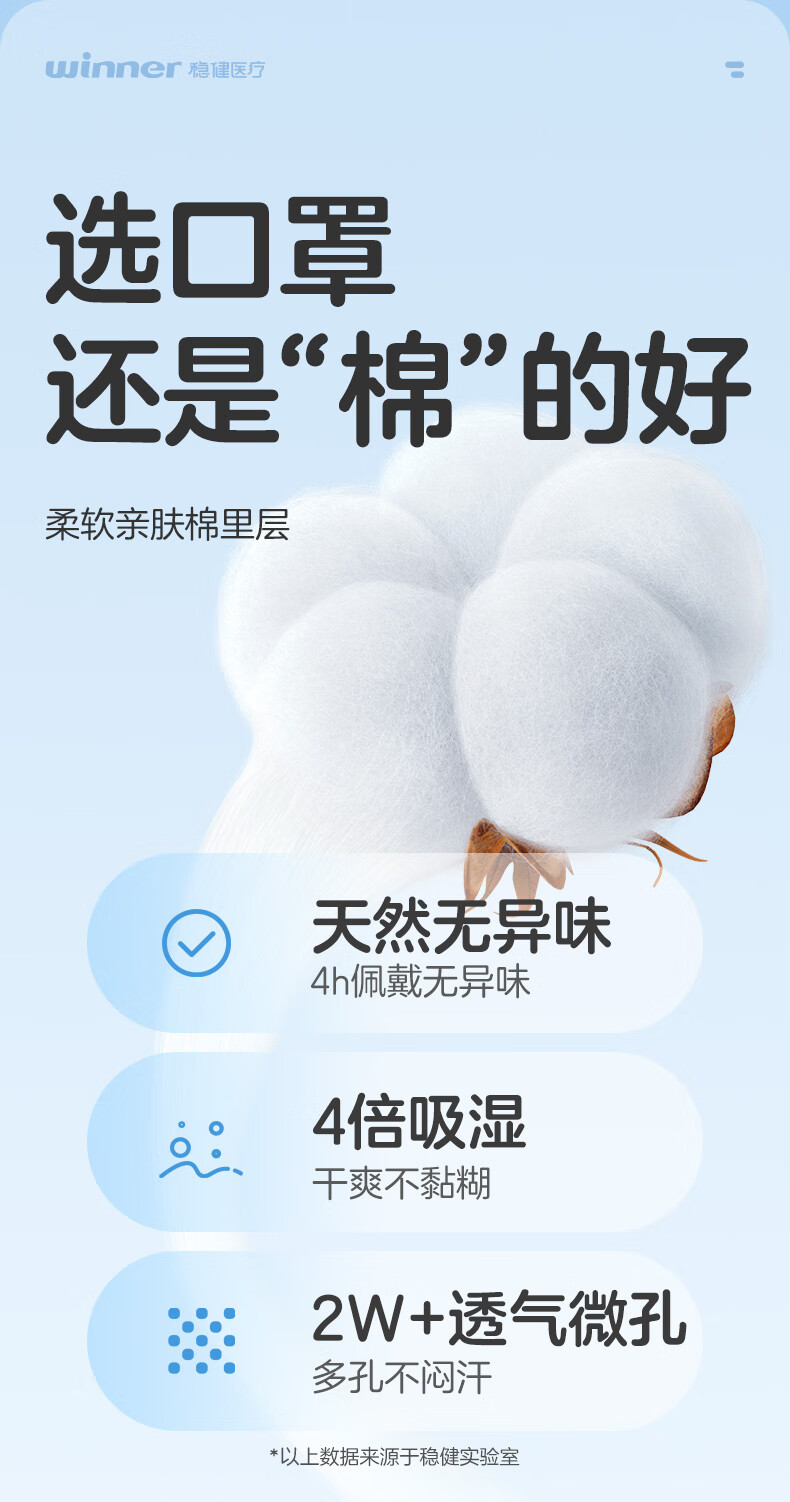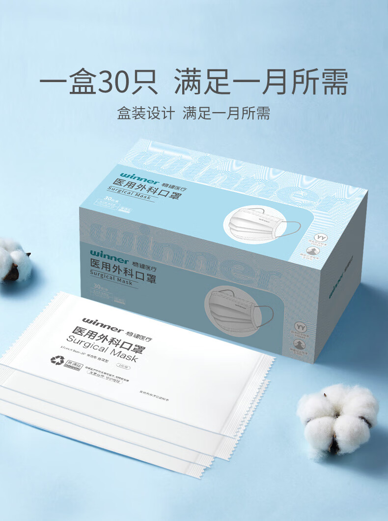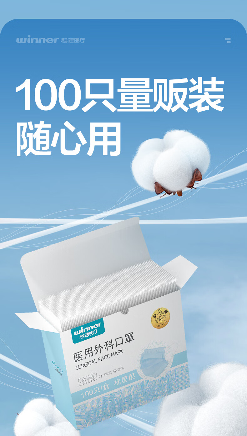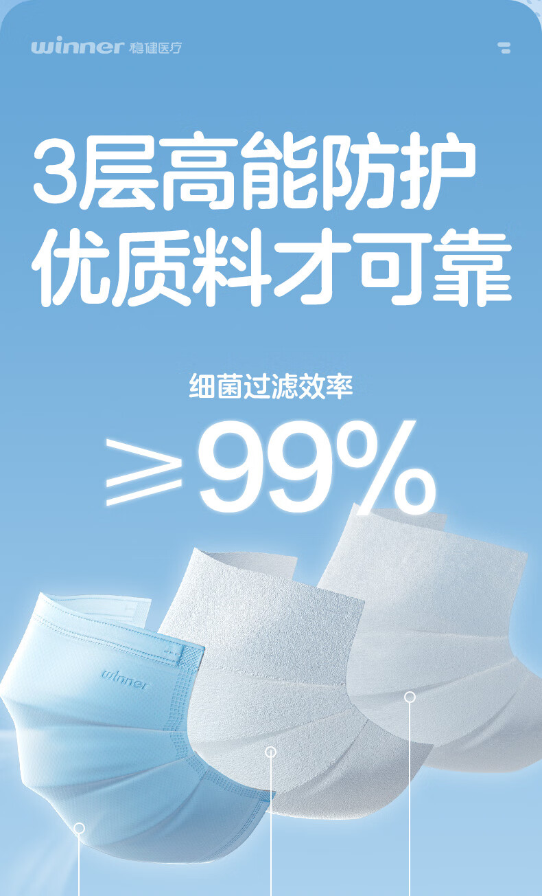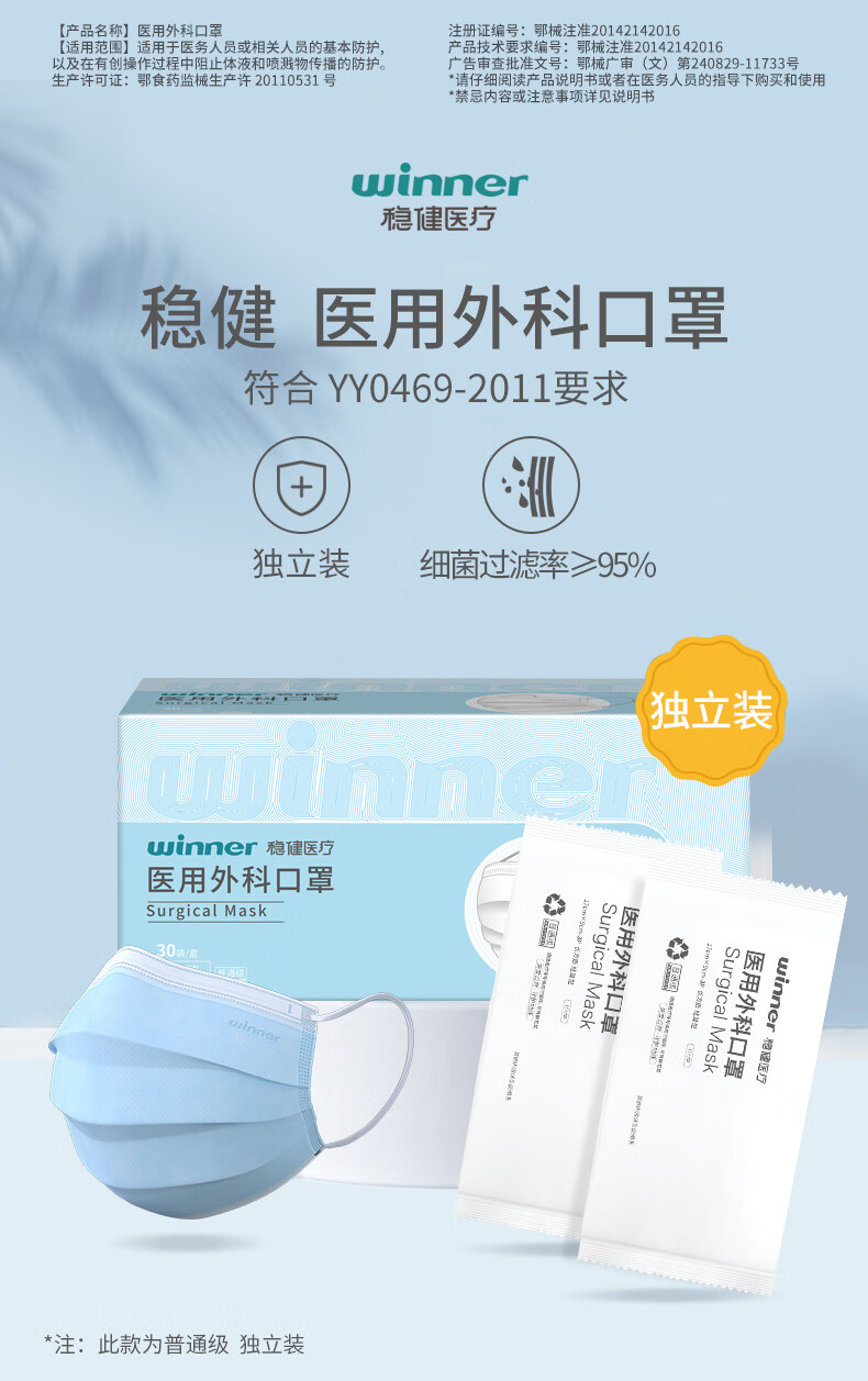 稳健口罩医用外科口罩一次性医用口罩防细菌冬季防流感独立干净卫生 【升级棉里层】50只/盒 成人蓝色 独立包装 1只/袋