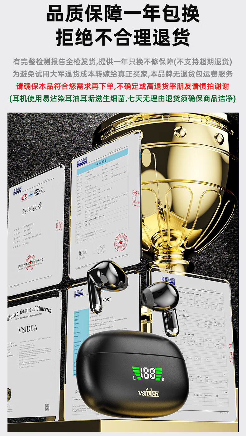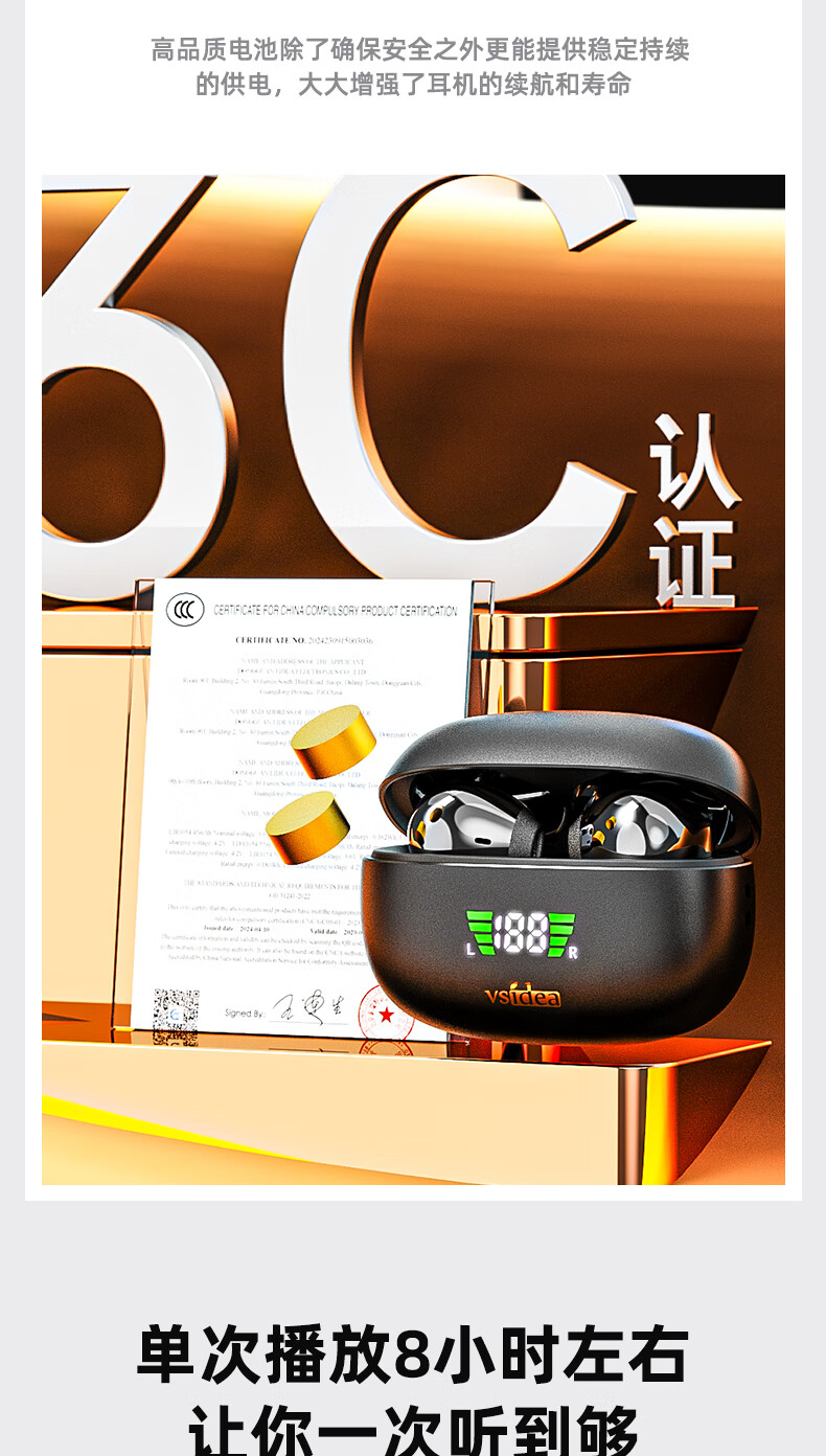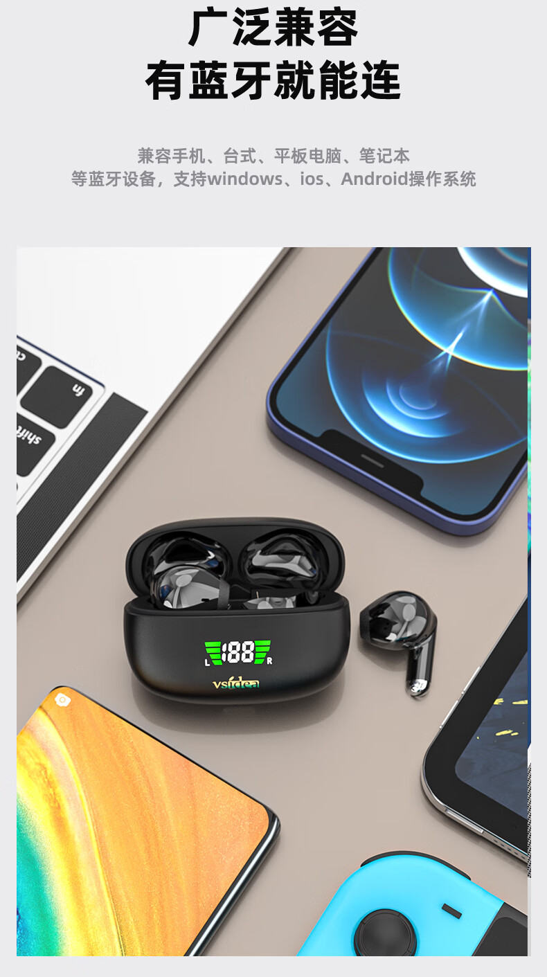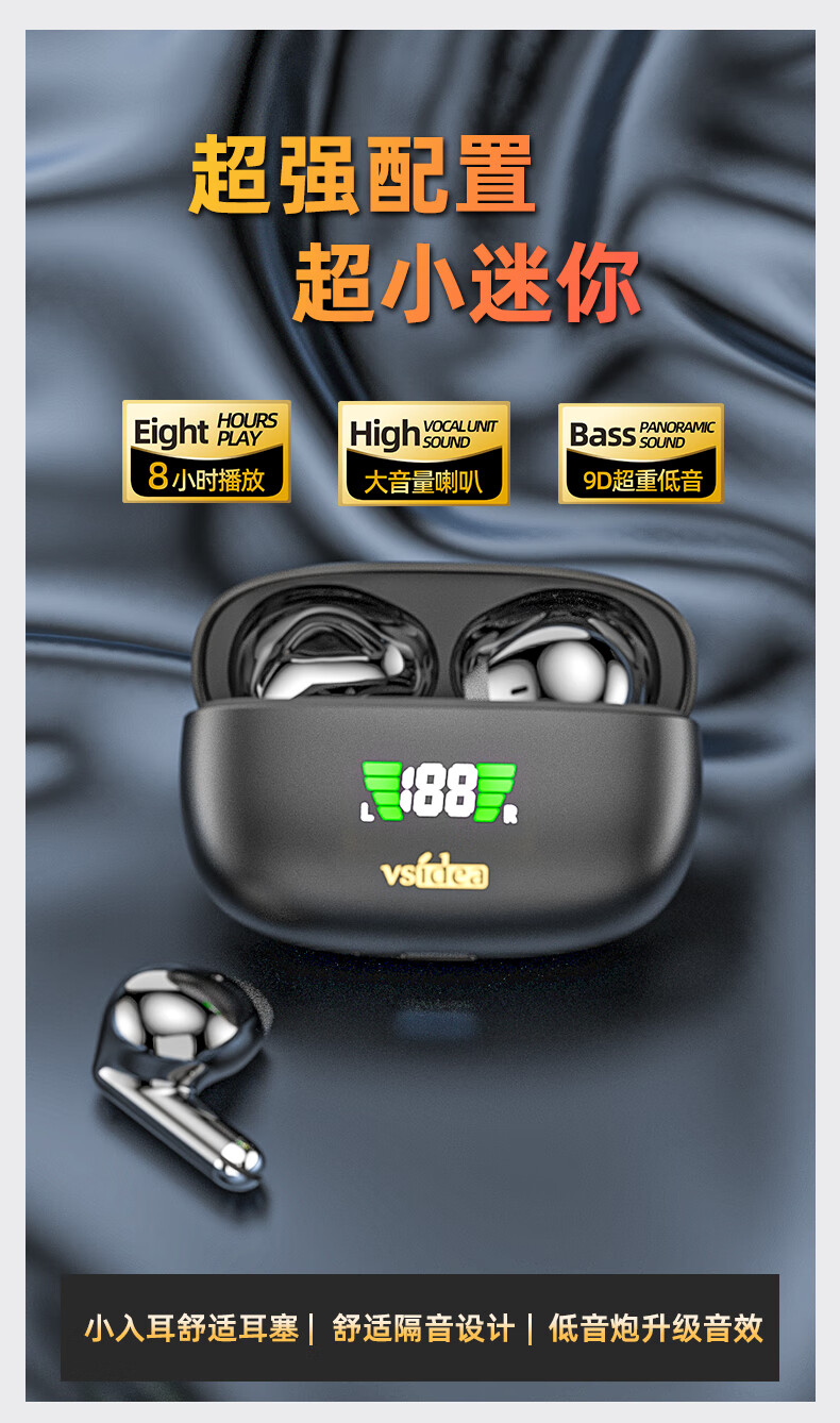 vsidea超重低音炮无线耳机蓝牙迷你半入耳式HIFI立体声环绕大音量长续航超小可爱定制版 黑色(有数显) 超大音量重低音