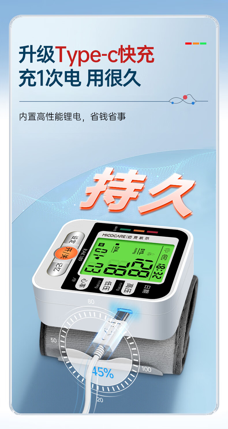 迈克凯尔手腕式电子血压计家用血压测量仪器医用高精准医院专用便携免脱衣 【医用正品】 充电续航120天+三色彩屏+语音播报