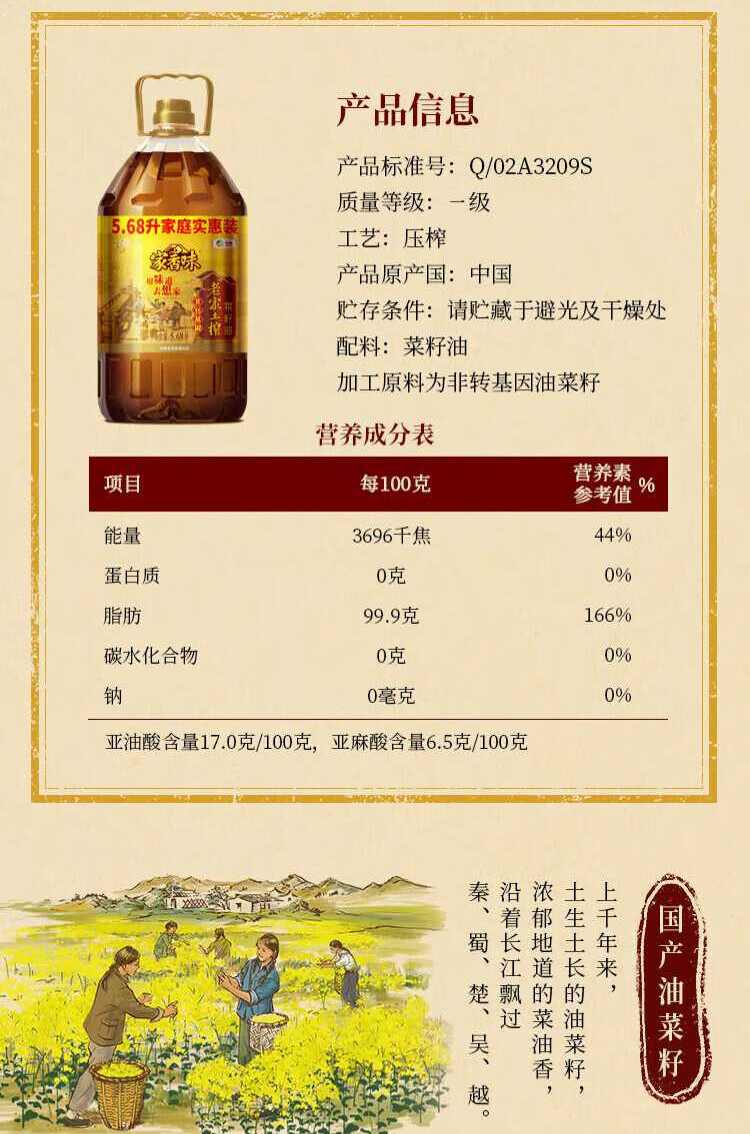 福临门【保真菜籽油】食用油菜籽油 家香味老家土榨菜籽油5.68L 中粮