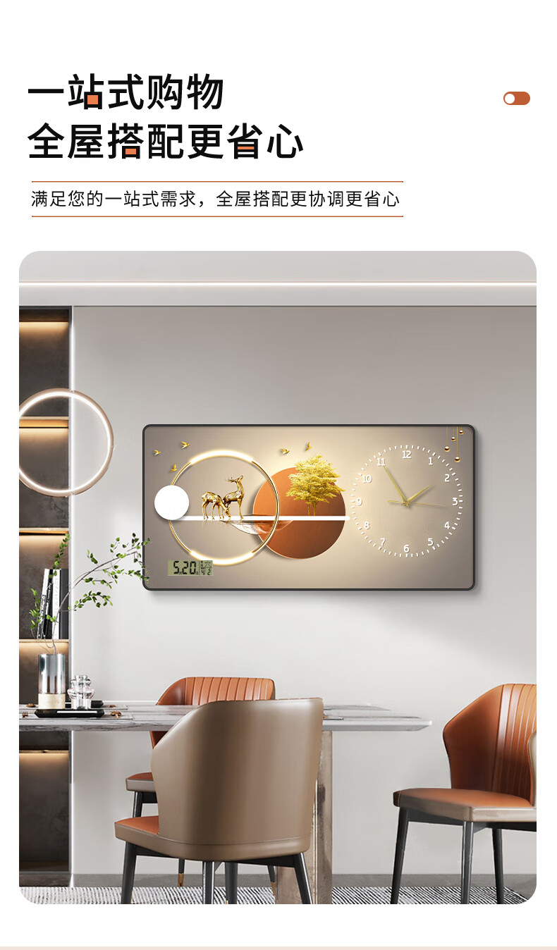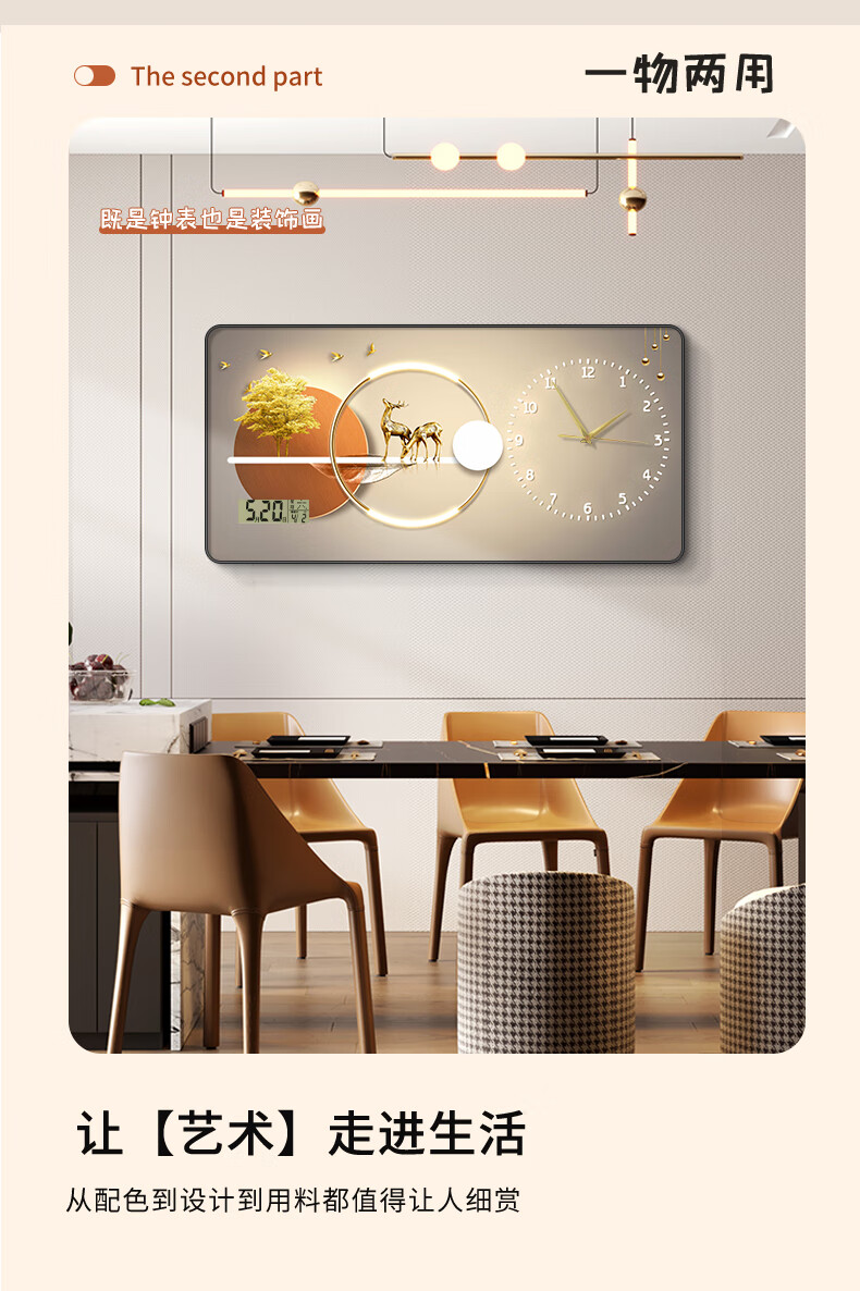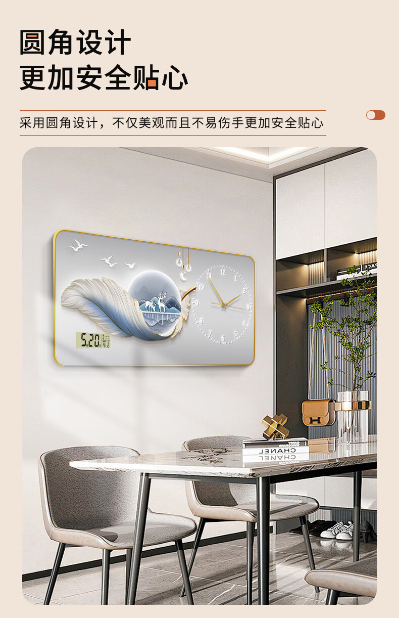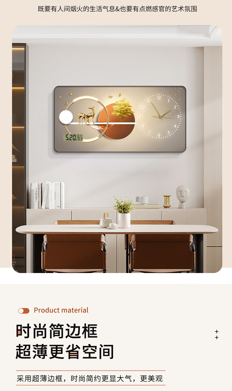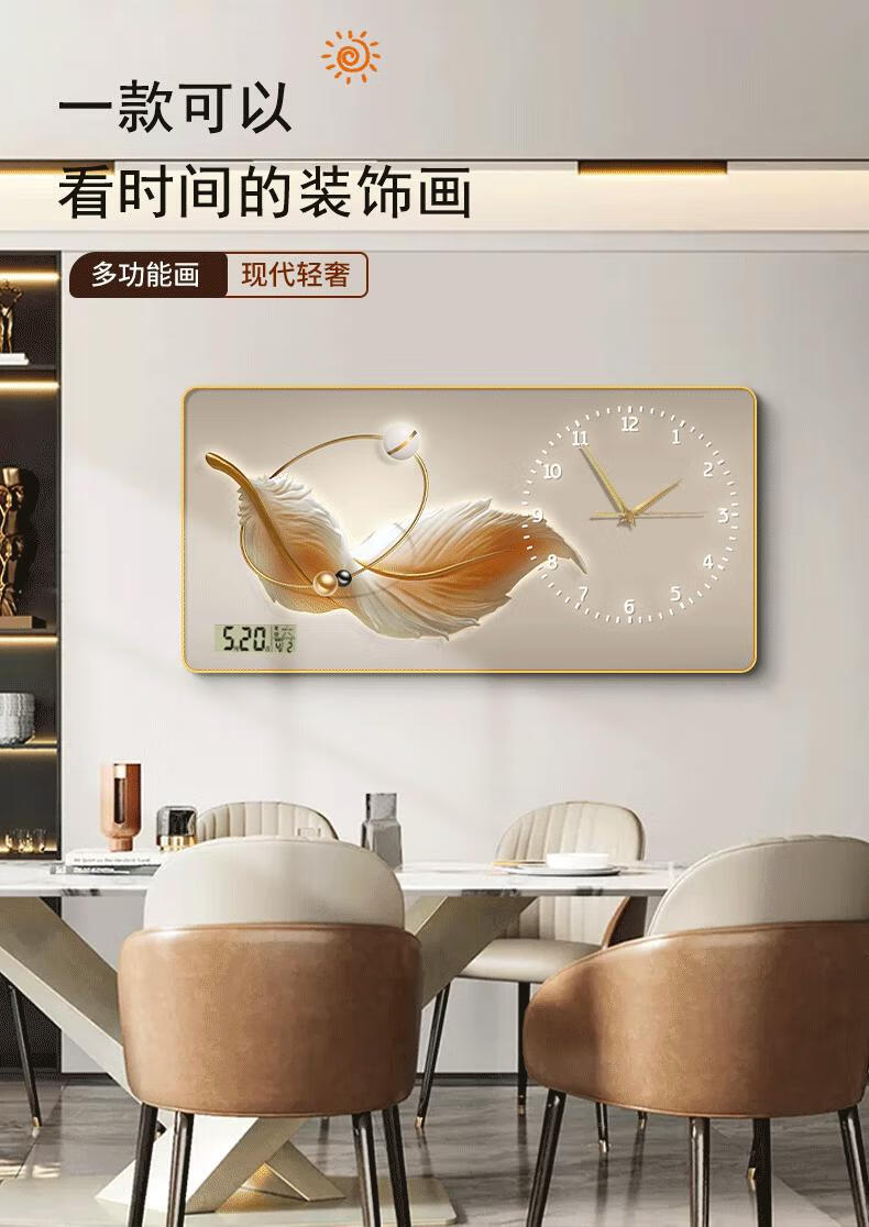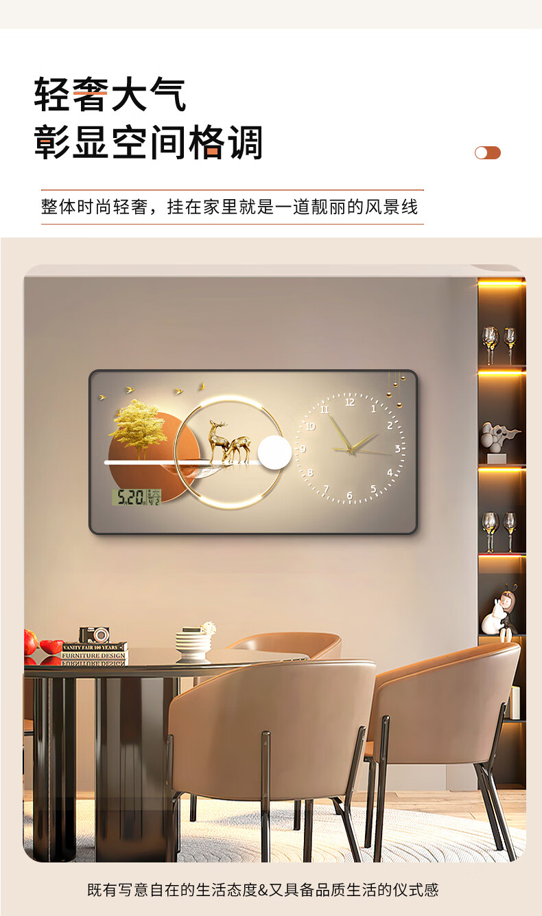 立始2025新款轻奢挂钟感挂表餐厅装饰画钟表挂墙饭厅静音创意时钟 福禄安康小号 日历+温度 黑框 水晶画面+电子屏