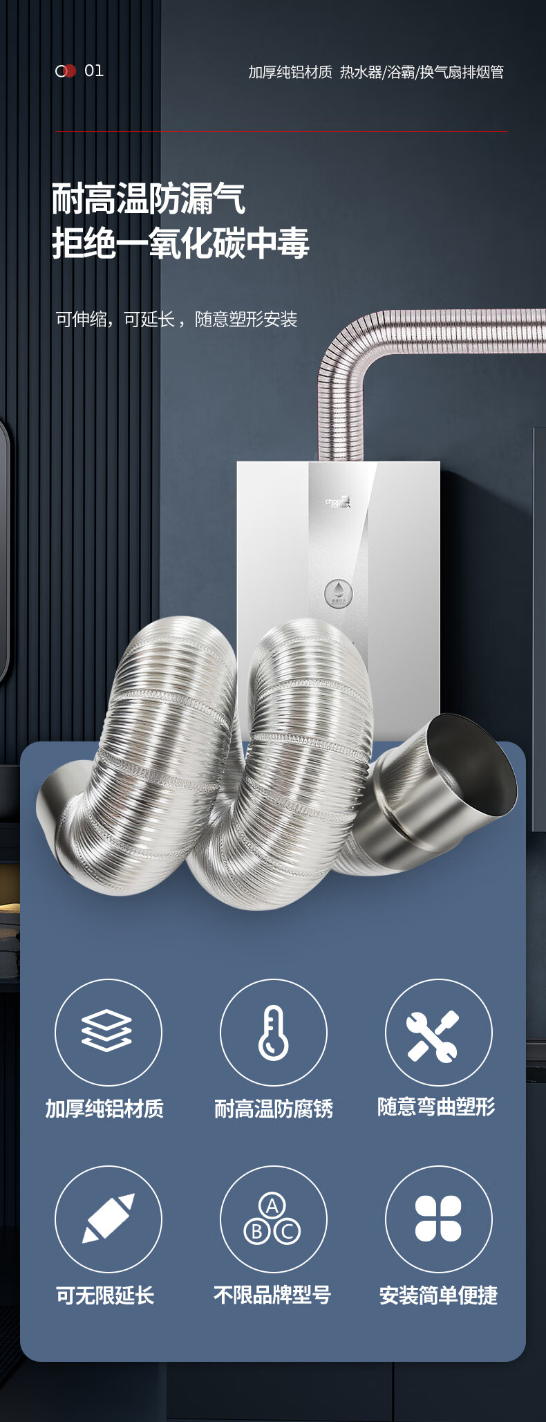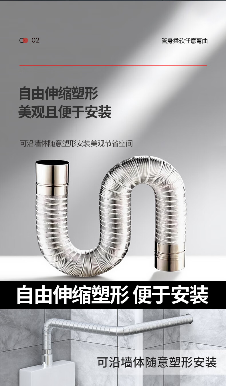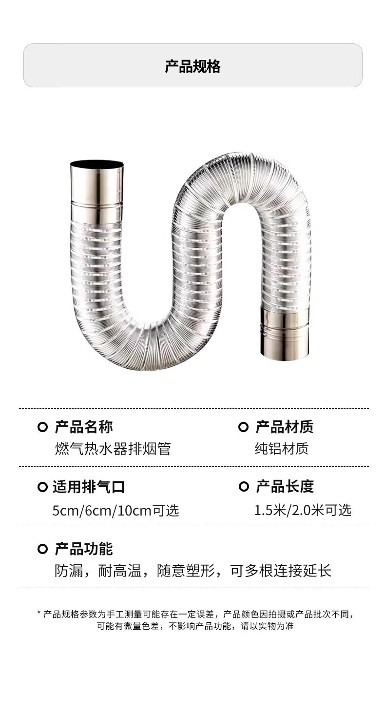 超人热水器排烟管延长直排强排式燃气热水器排气管卫生间厕所浴霸排风管加厚纯铝可伸缩弯曲不锈钢接口 100口径×2.0米【加厚纯铝】配不锈钢头