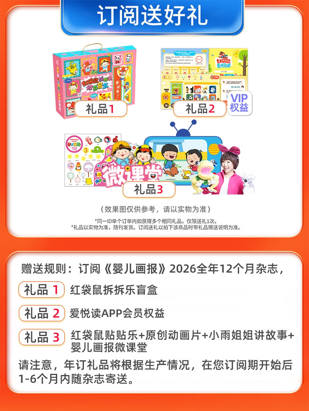 送好礼 婴儿画报杂志订阅 每月3册 0-2-3-4岁婴幼儿童精品绘本故事书 启蒙早教绘本读物好习惯养成 半年/全年订阅2026年/2025年1月-6月/7月-12月任选 杂志铺宝宝入园准备睡前故事书