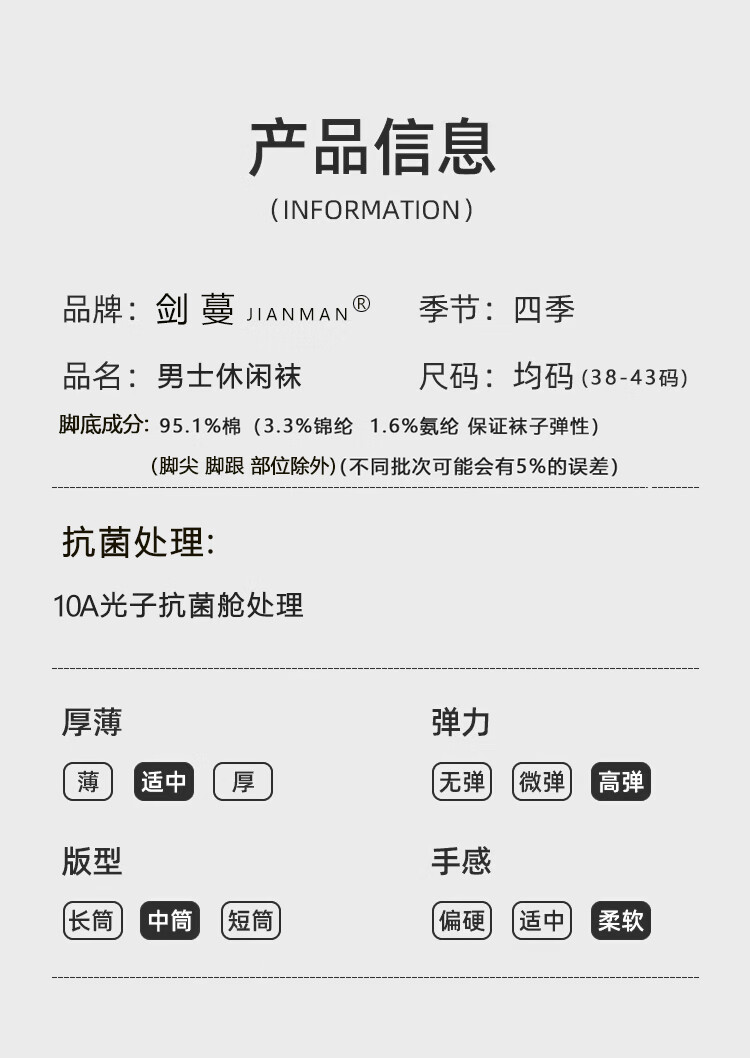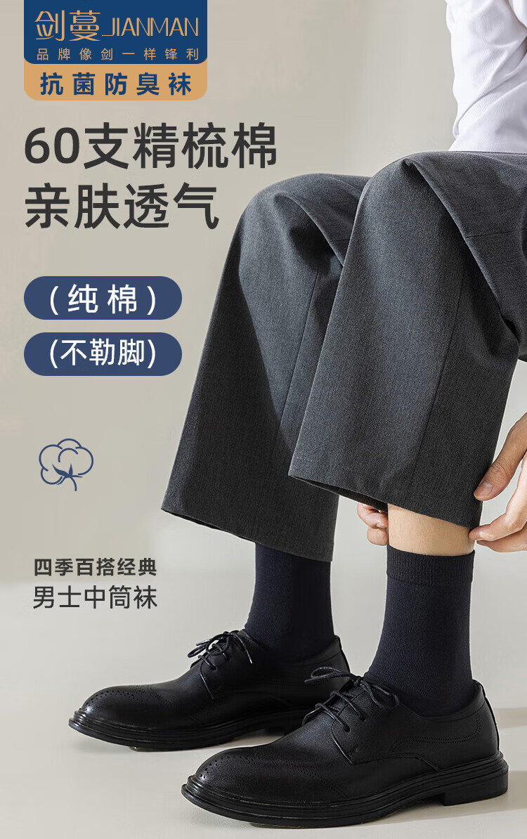 剑蔓纯棉10A级 抗菌袜防臭袜子 袜子男全棉 精梳棉 中筒正品四季 拍1发6黑色【包含赠送共发 6双 均码 38-43码
