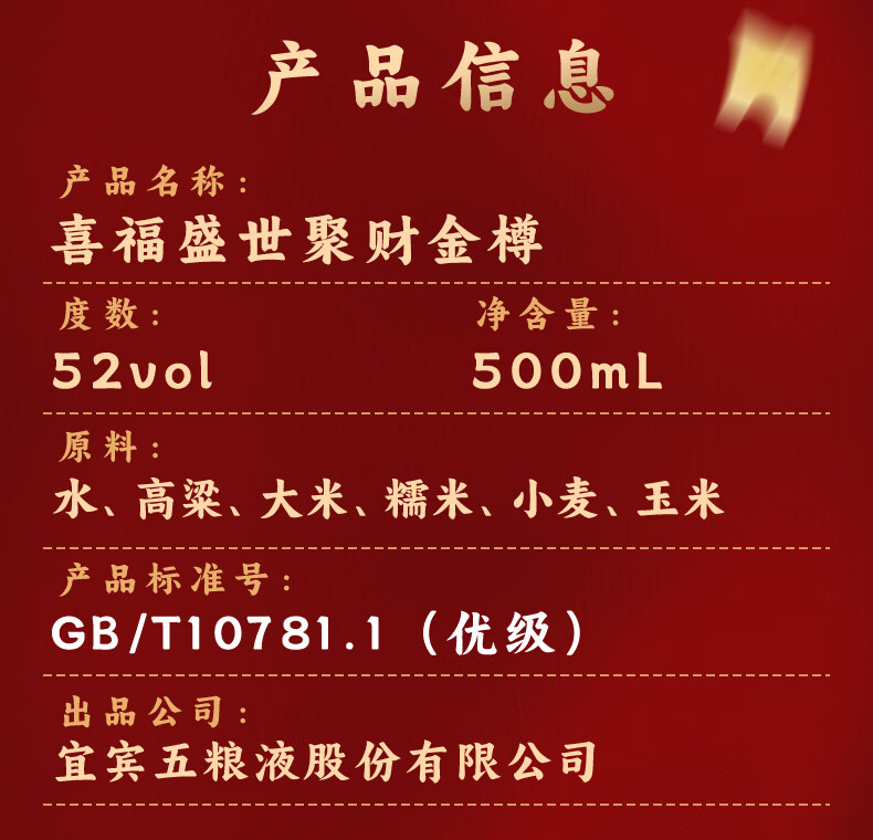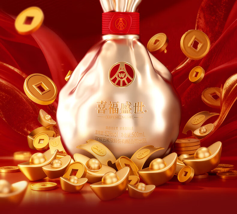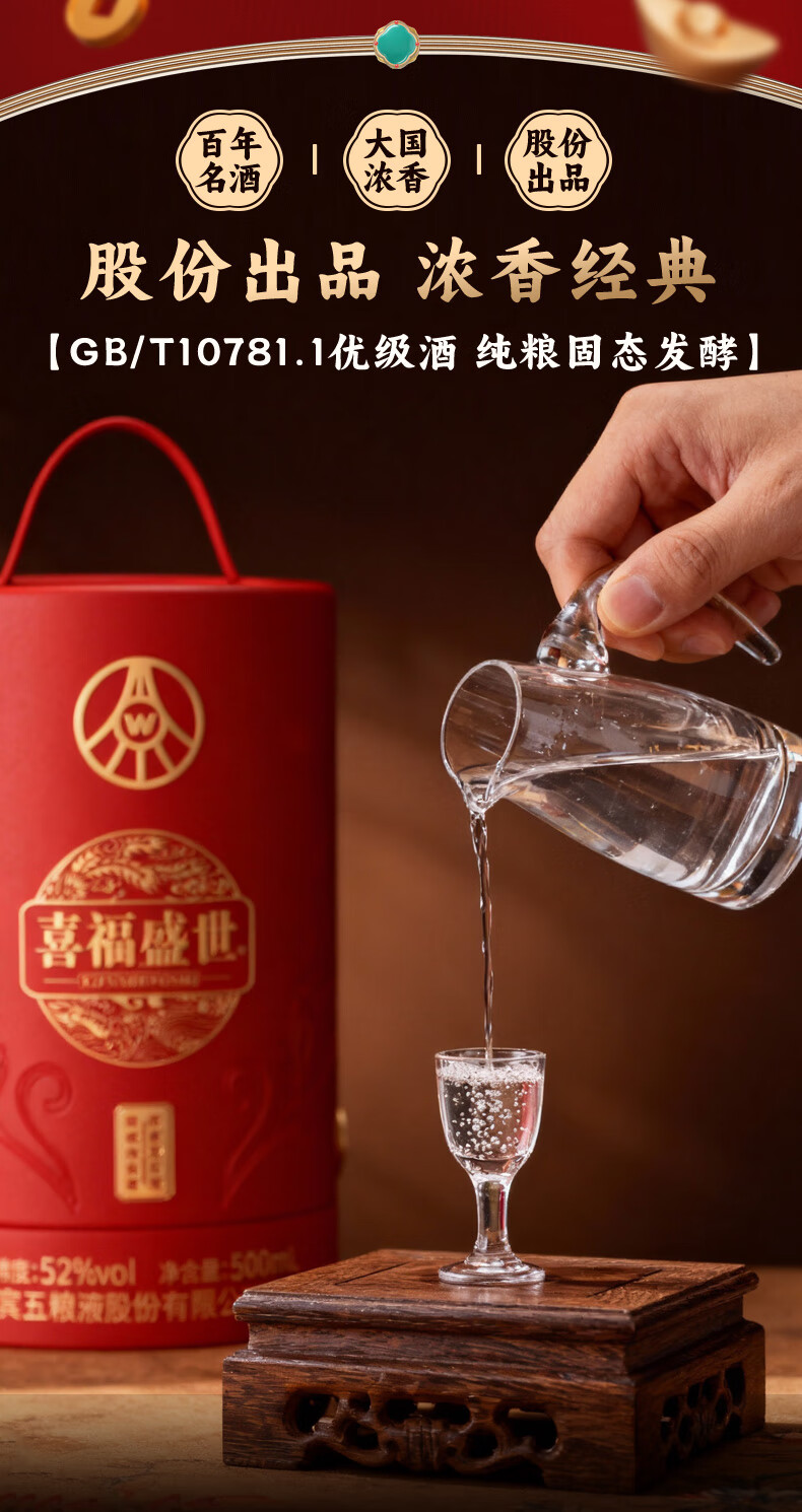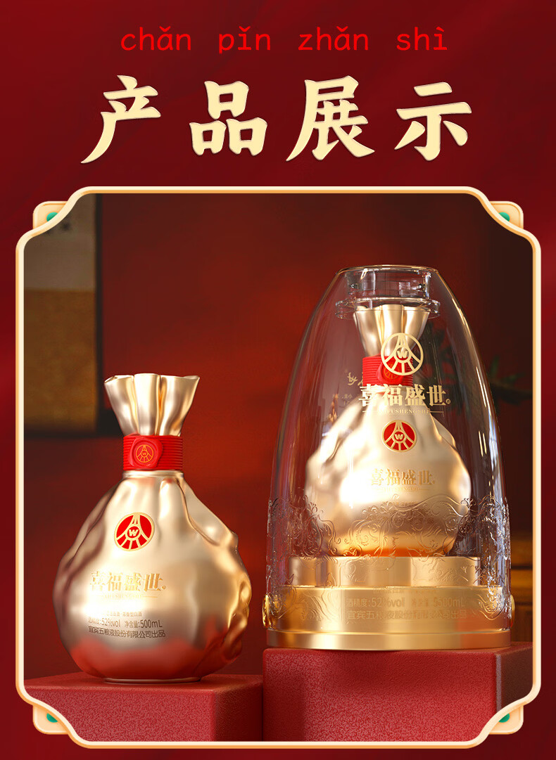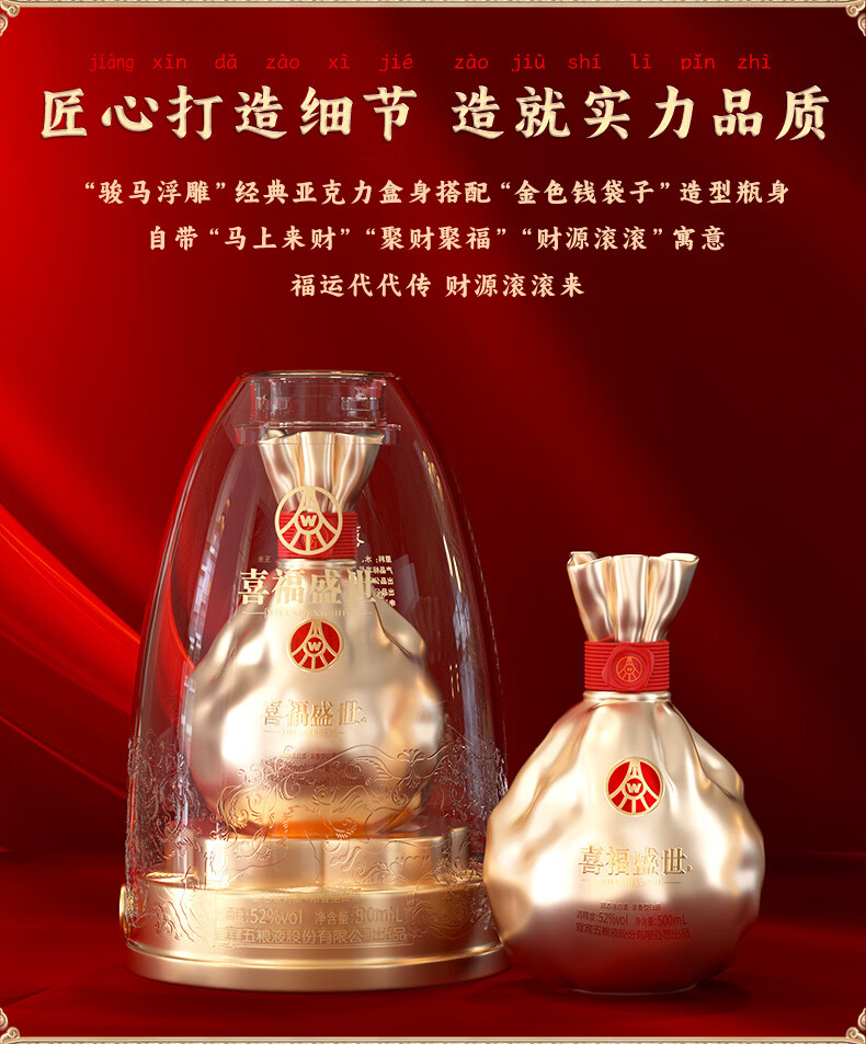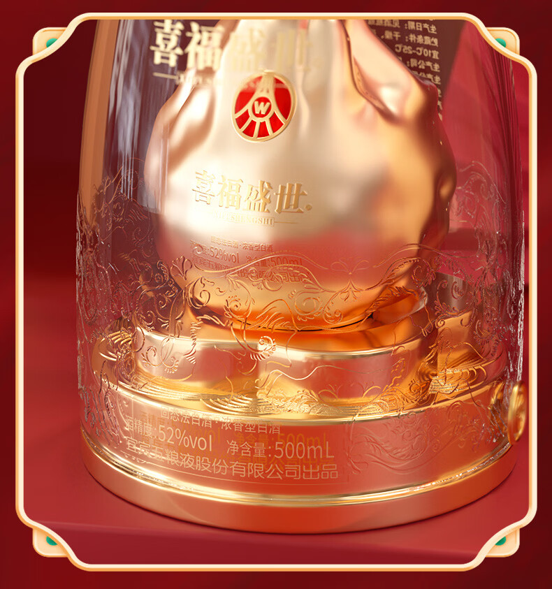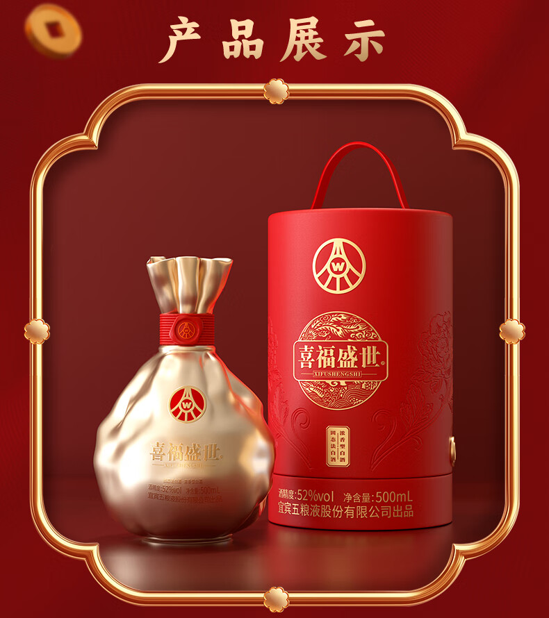 五粮浓香五粮液股份出品 官方授权 52度优级 浓香型白酒 喜福盛世 52度 500mL 2瓶 大聚鸿财双支装