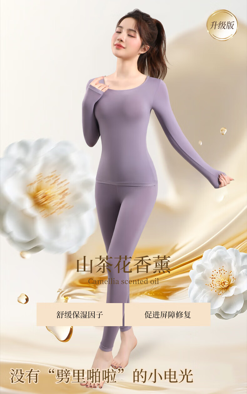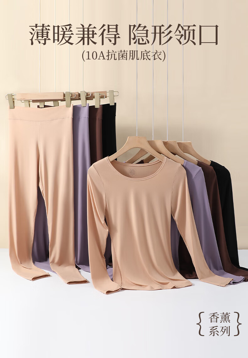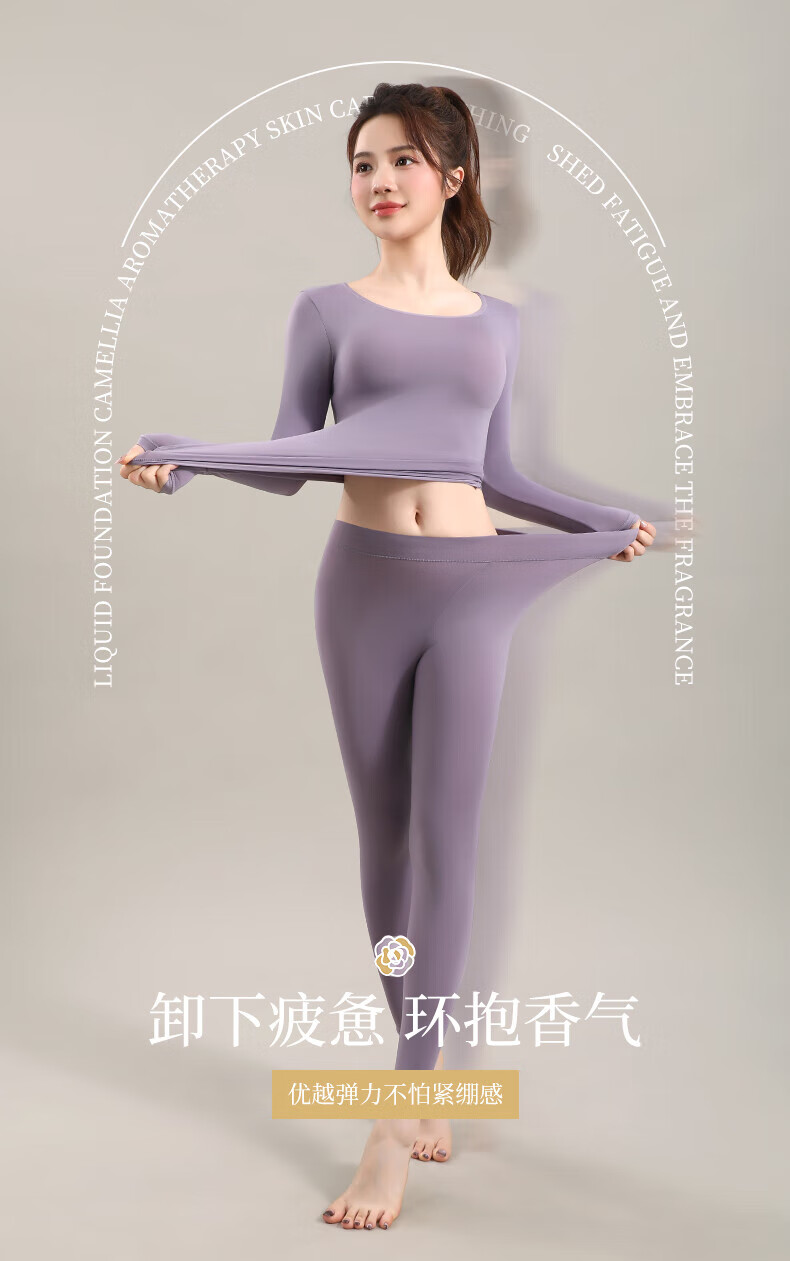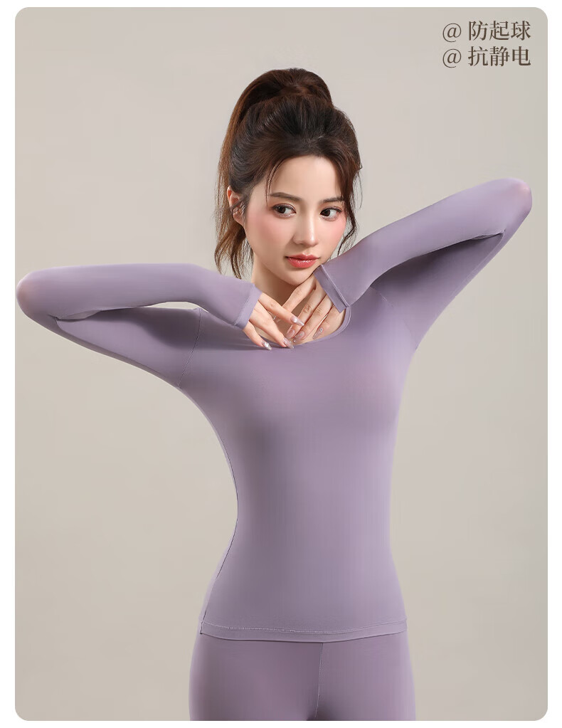 顶瓜瓜10A抗菌保暖套装女士美肤衣法式紧身长袖圆领秋冬薄款无痕内穿 丁香紫/上衣+裤子 XL