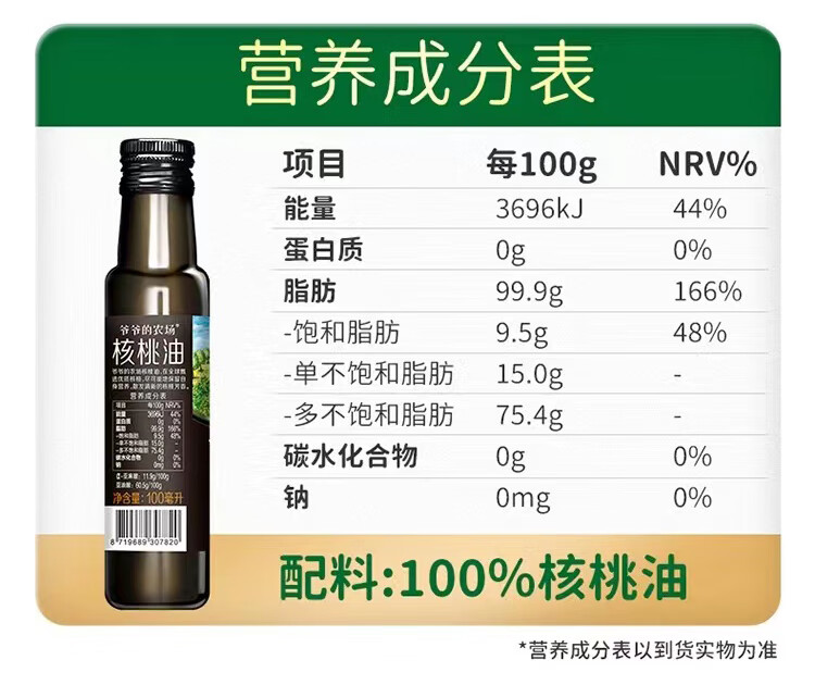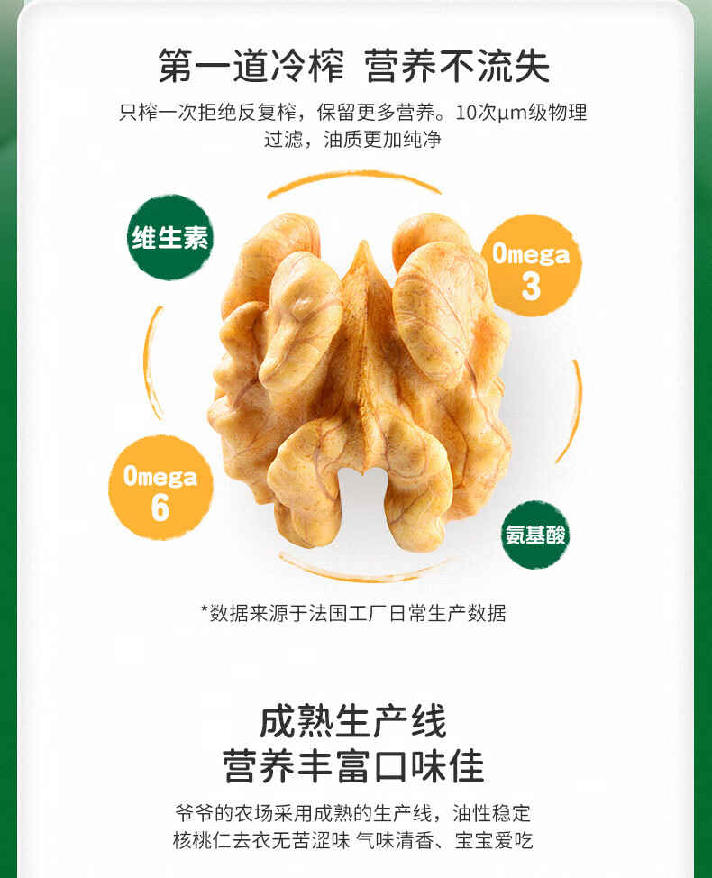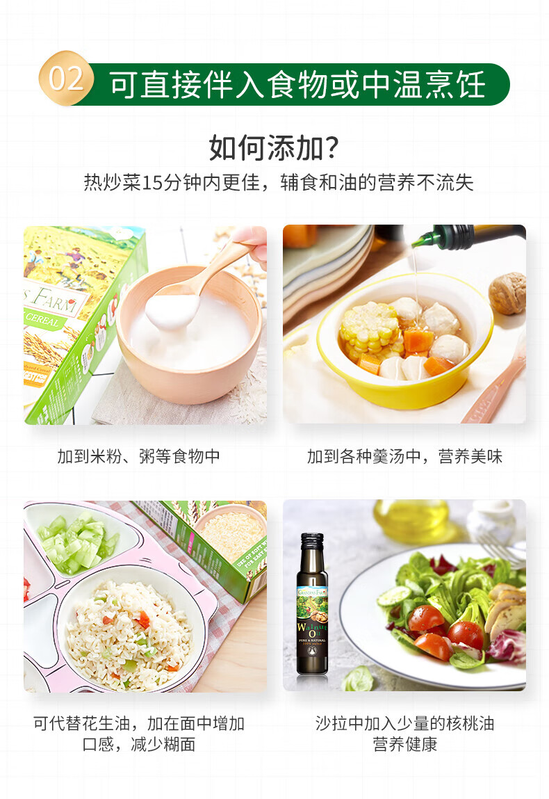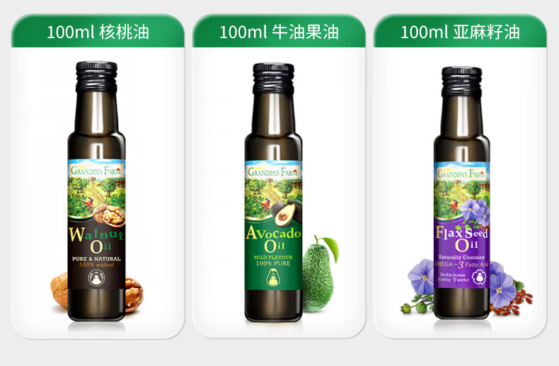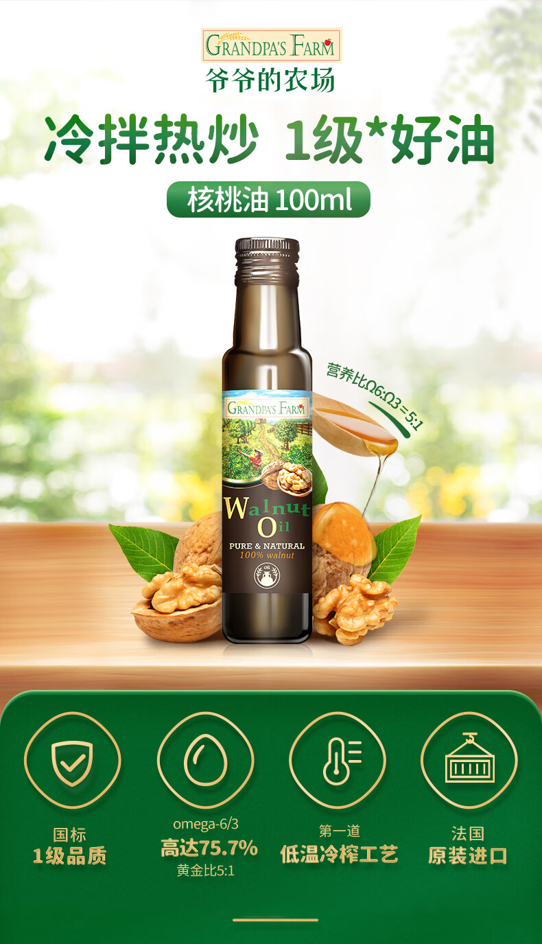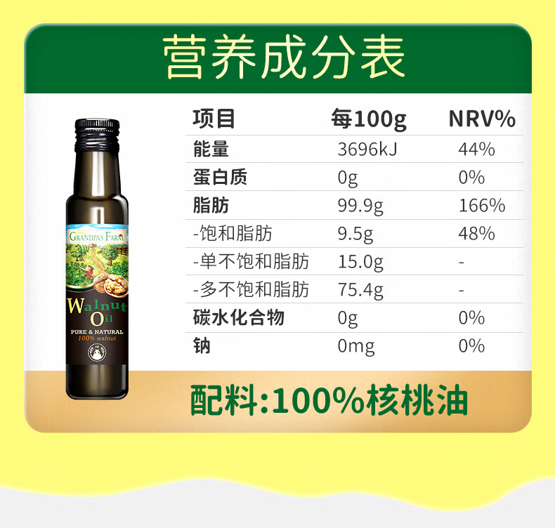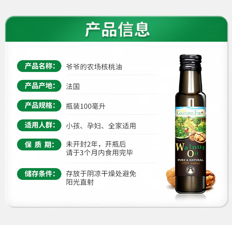 爷爷的农场核桃亚麻籽牛油果油辅食油 宝宝孕妇可添加辅食营养油 核桃油100ml