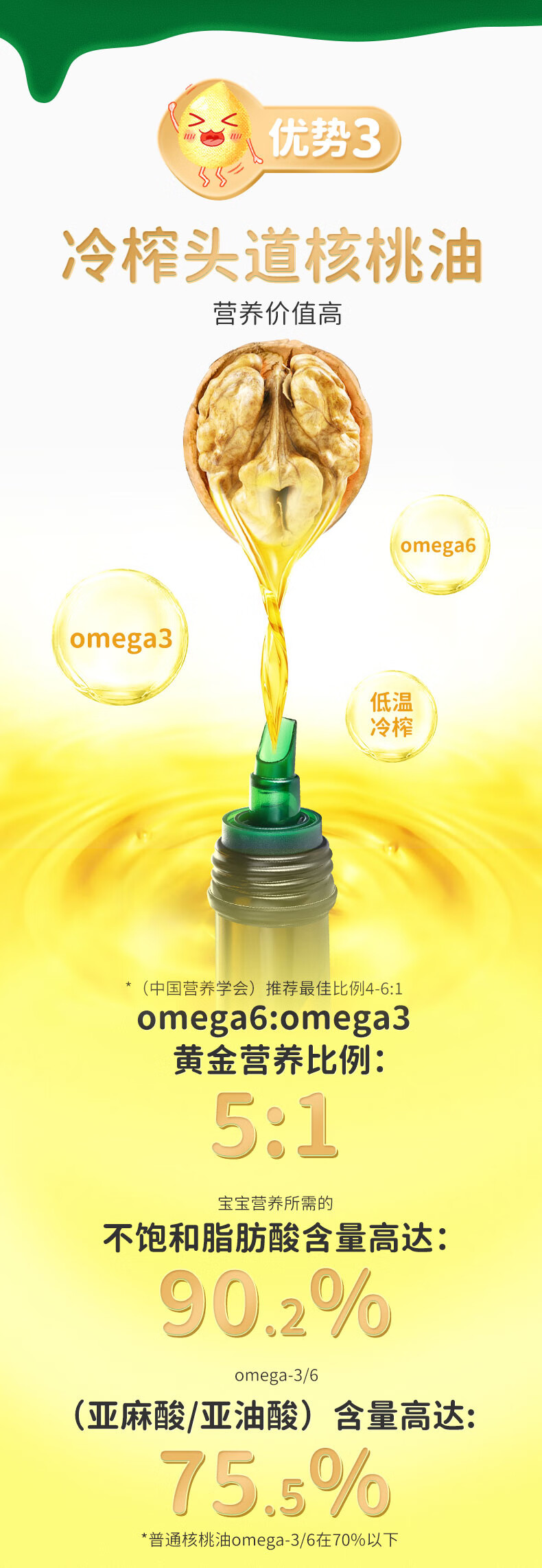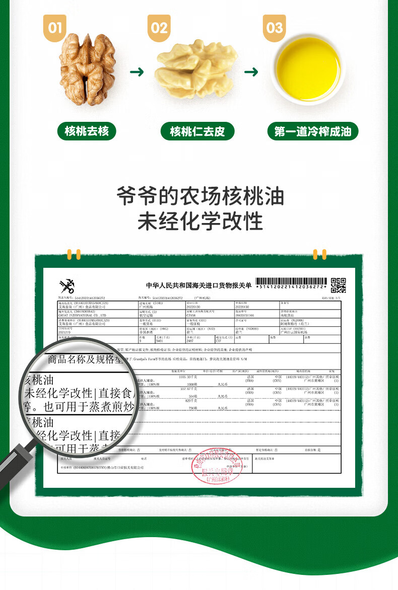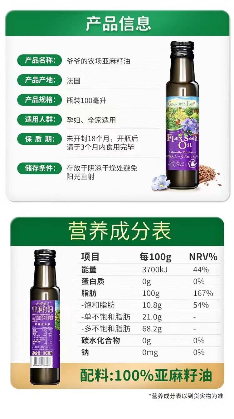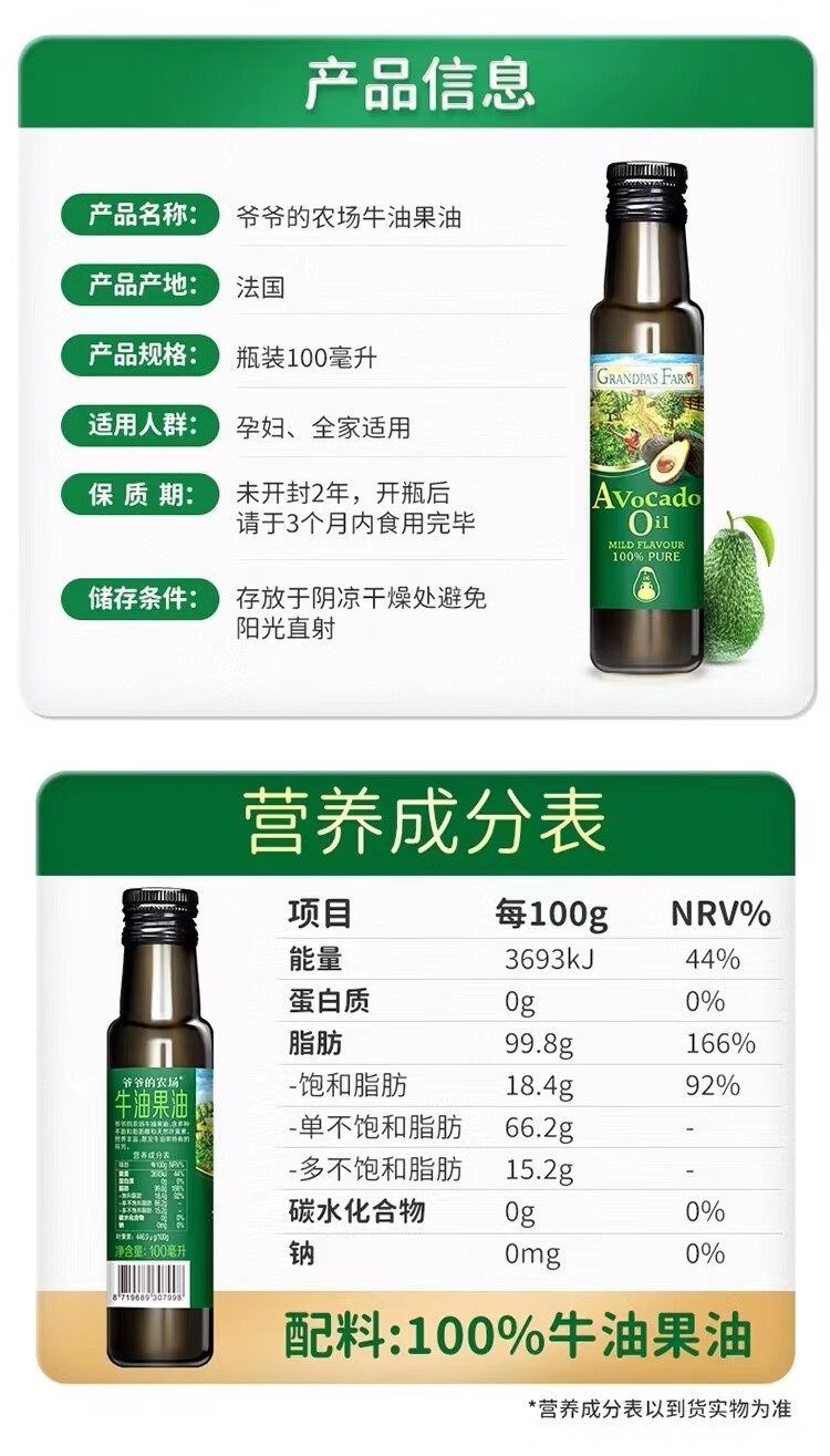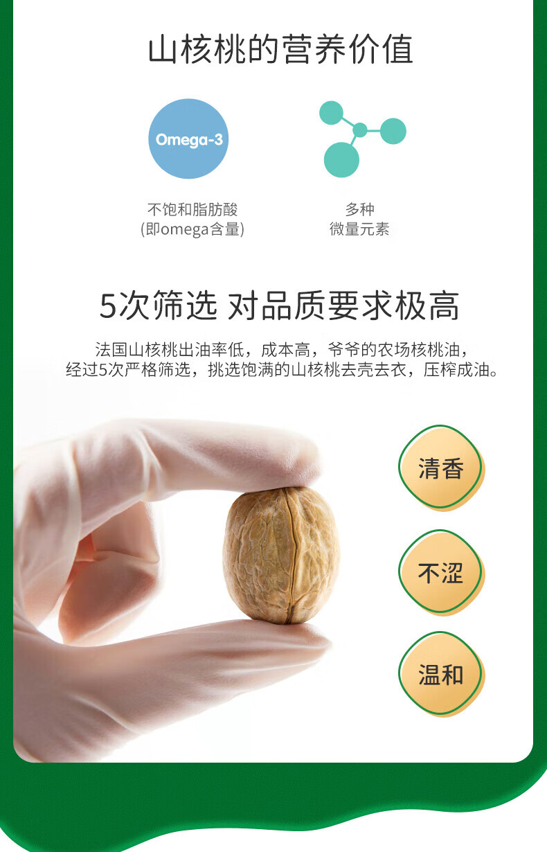 爷爷的农场核桃亚麻籽牛油果油辅食油 宝宝孕妇可添加辅食营养油 核桃油100ml