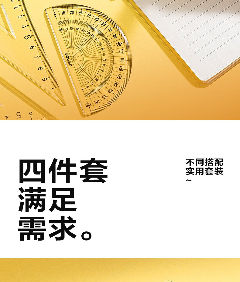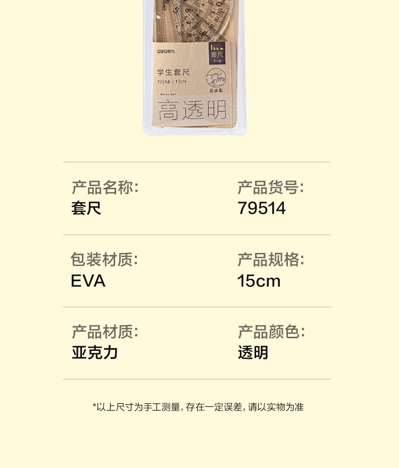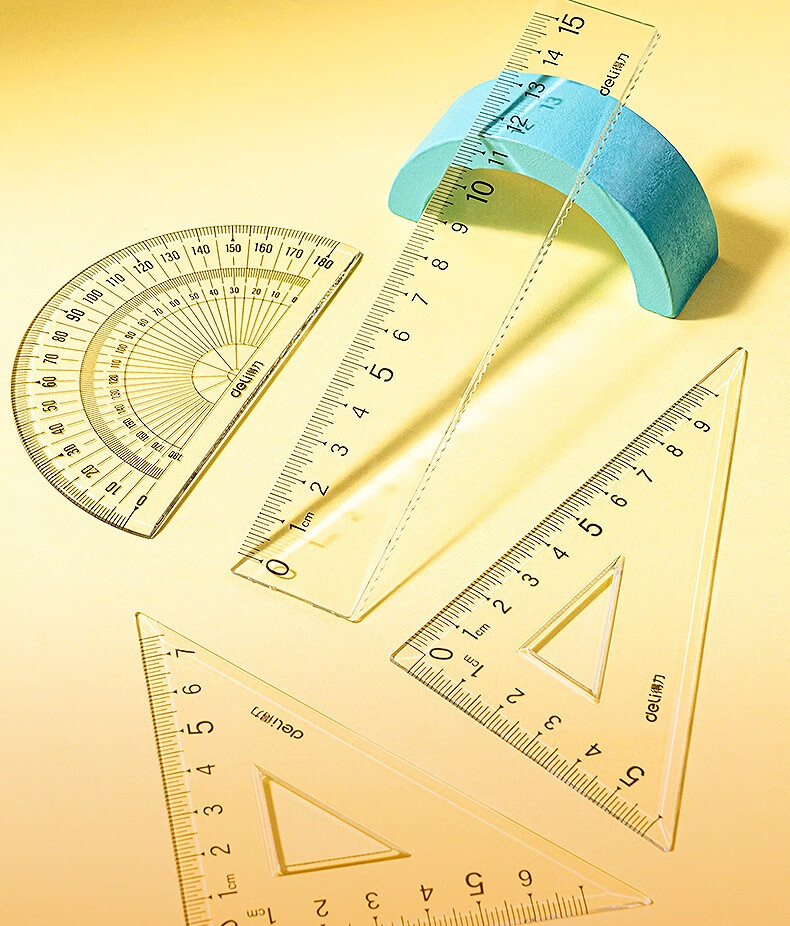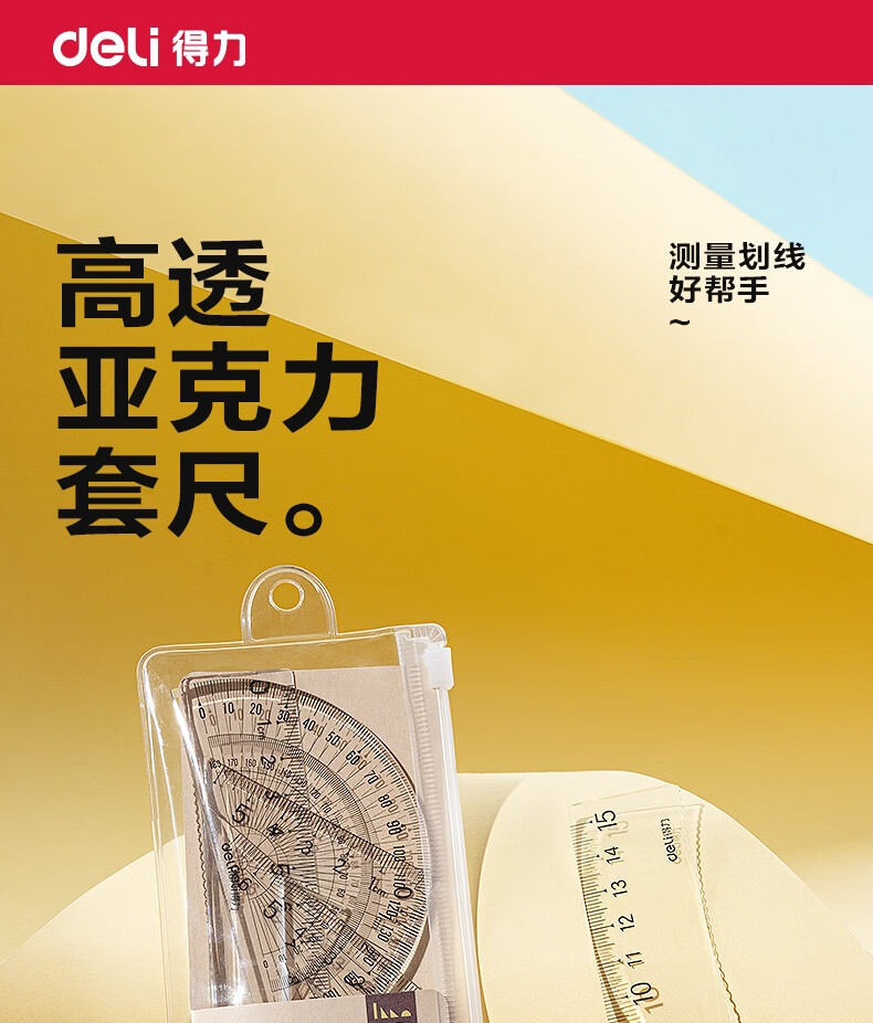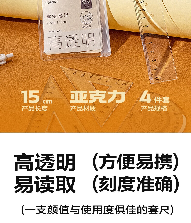 得力(deli)亚克力套尺4件套学生考研文具高考中考考试绘图套尺(直尺*1+三角尺*2+量角器*1)套装尺子