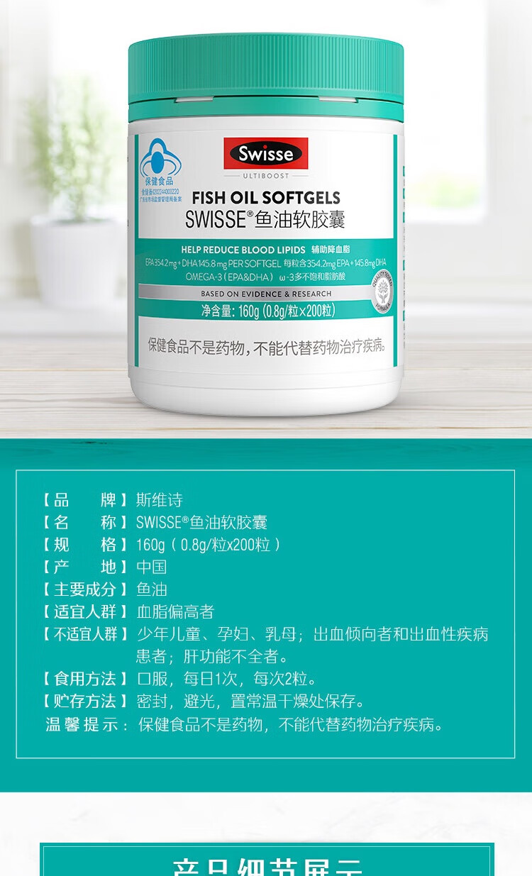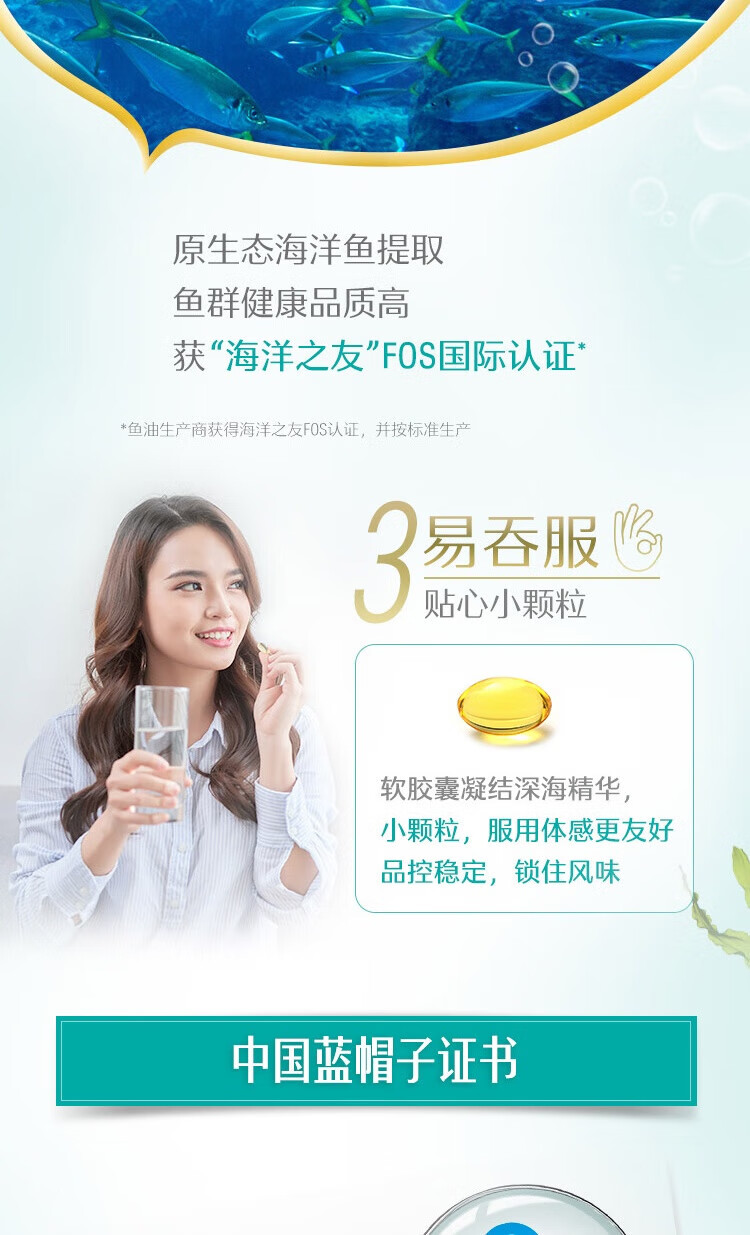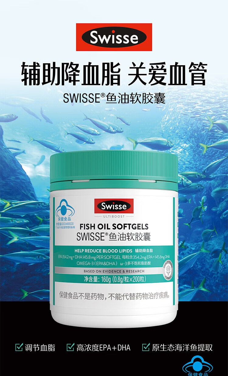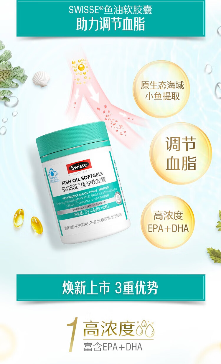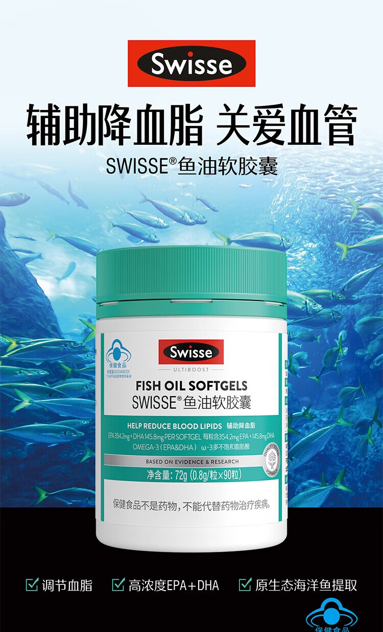 Swisse斯维诗 鱼油软胶囊 深海高浓度鱼油 含Omega3 EPA DHA 蓝帽认证 【辅助降血脂】0.8g/粒*90粒*1罐