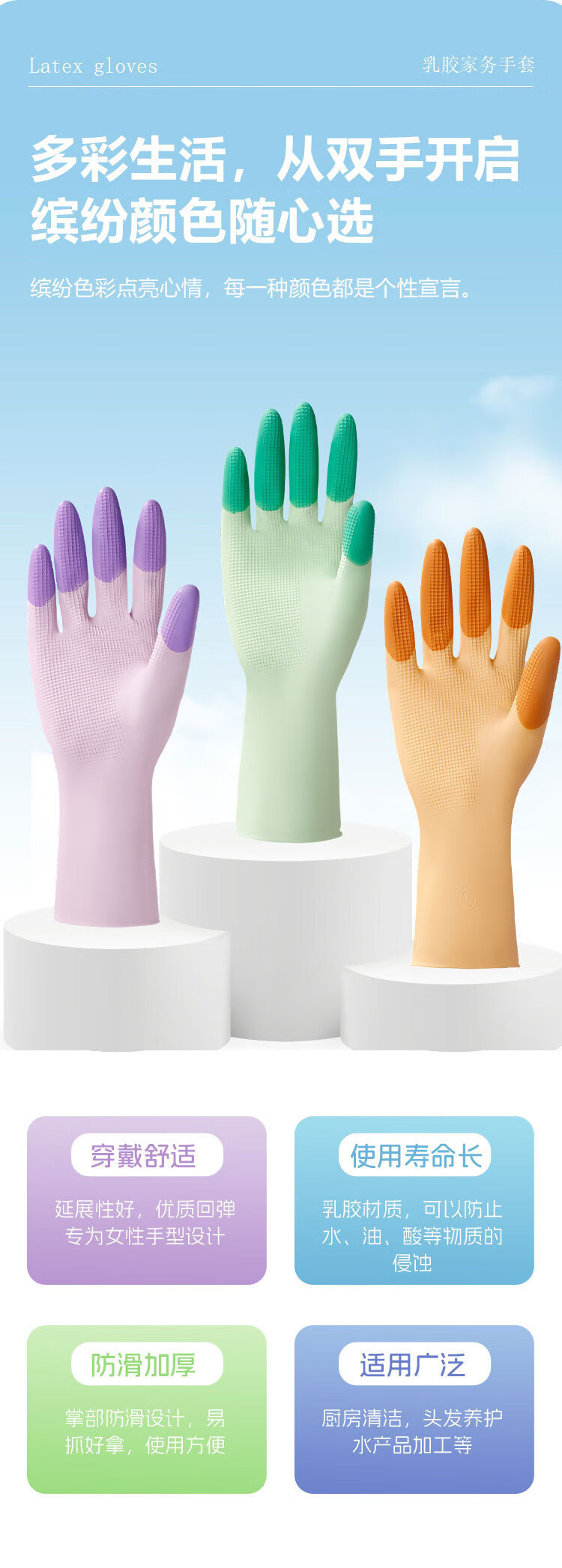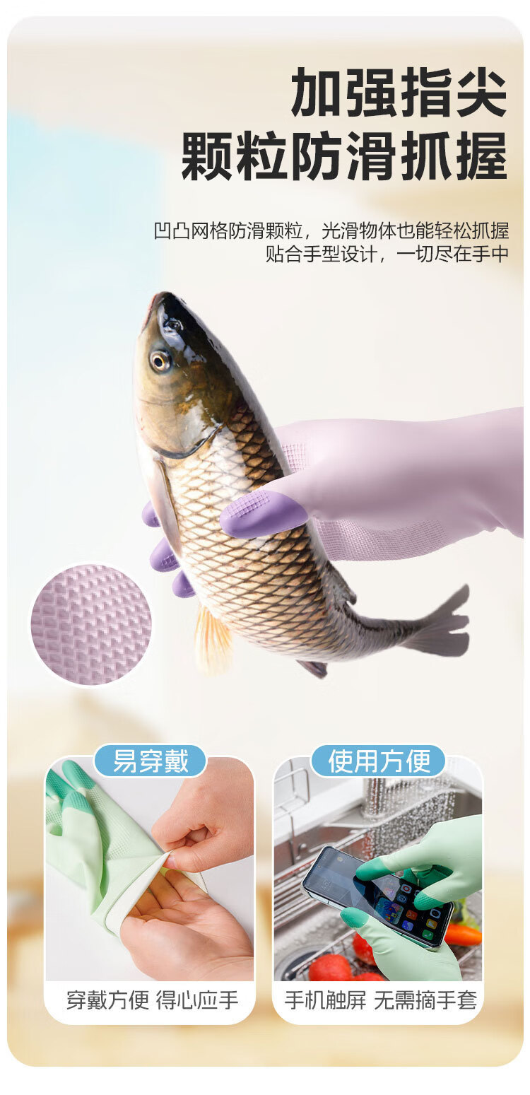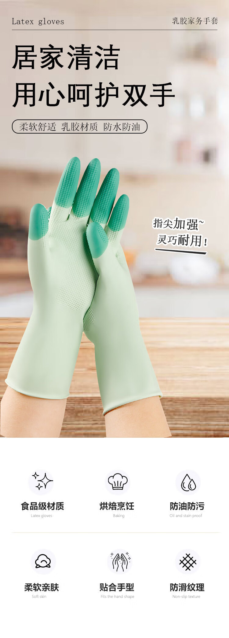 恬舒高弹力柔软乳胶洗碗手套乳胶橡胶洗衣服防水防油厨房居家清洁 缤彩绿 L