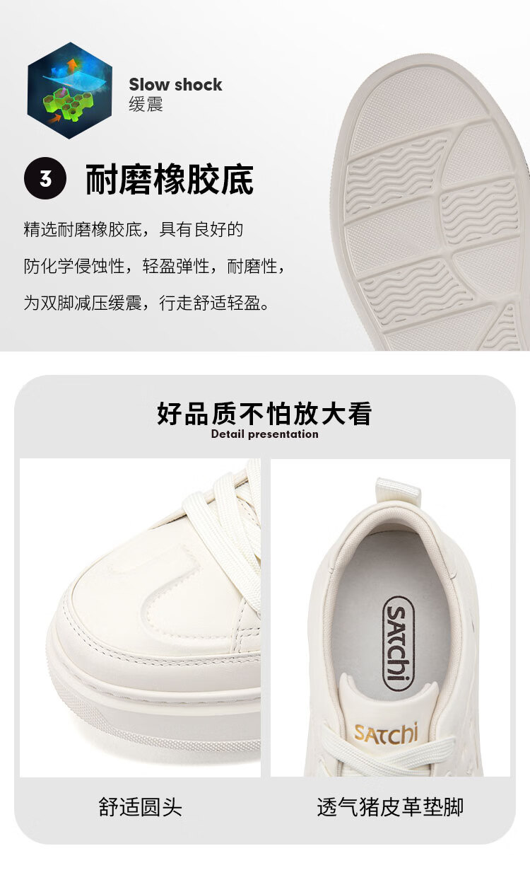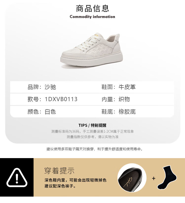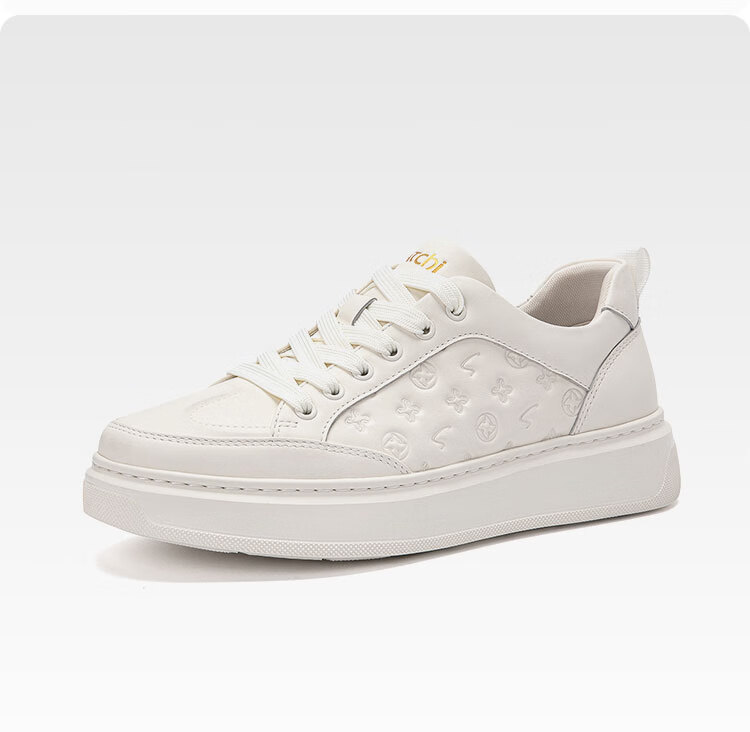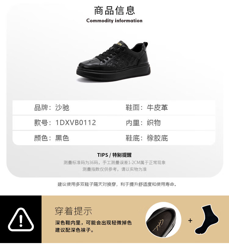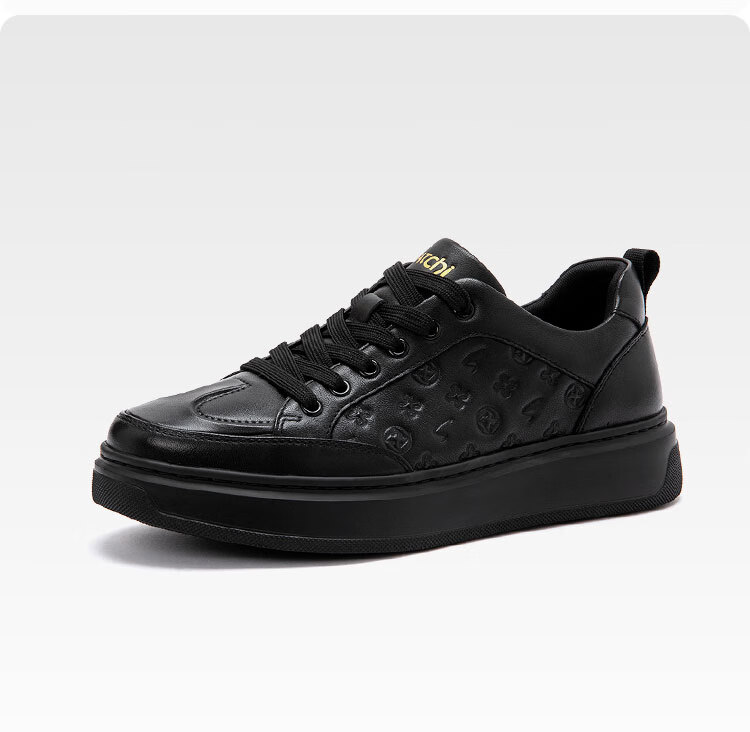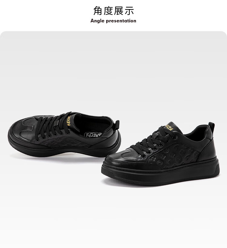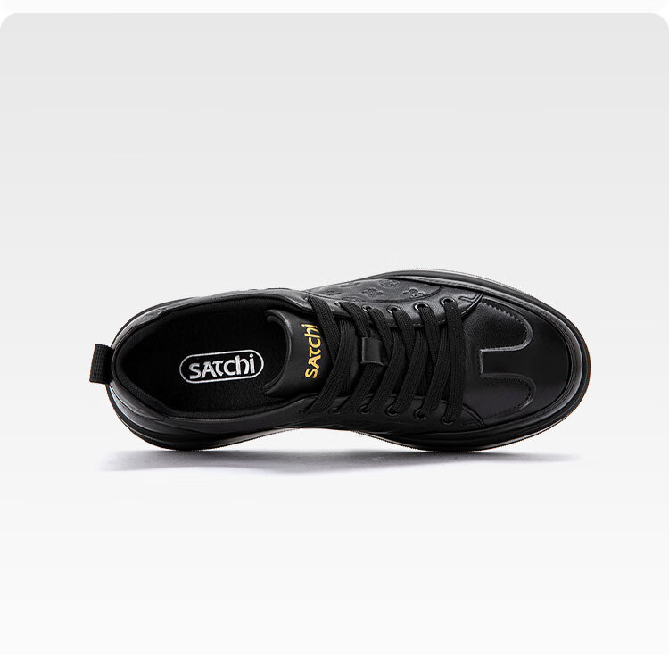 沙驰(SATCHI)男鞋【小牛皮】新款个性压花厚底潮流舒适百搭板鞋休闲鞋小白鞋 黑色(1DXVB0112) 38 欧码(选小一码)