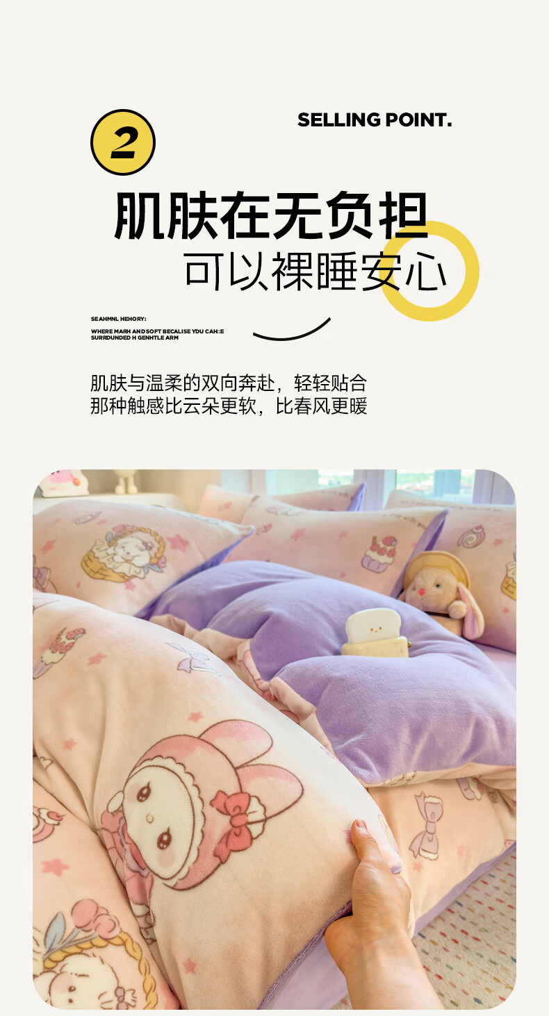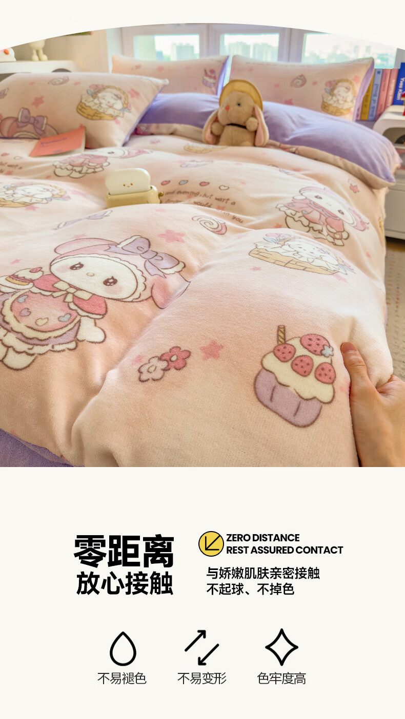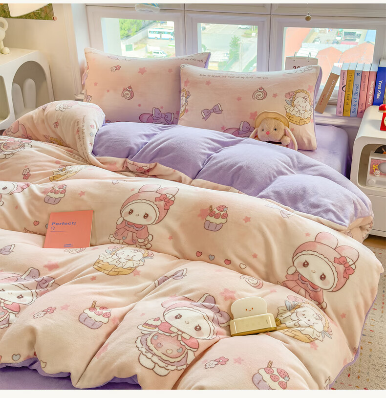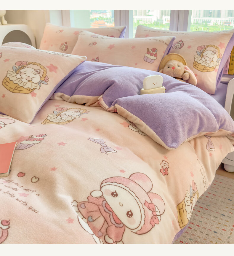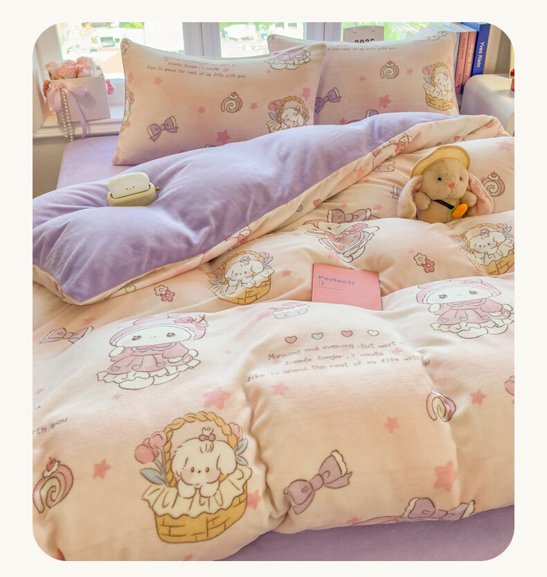 VJE秋冬加厚牛奶绒床上四件套可爱卡通加绒珊瑚绒床单被套三件套床品 萌兔小屋 四件套1.5m 床单款 (被套200*230cm)