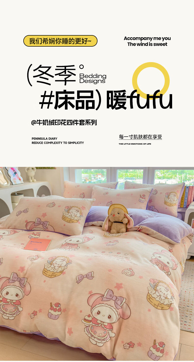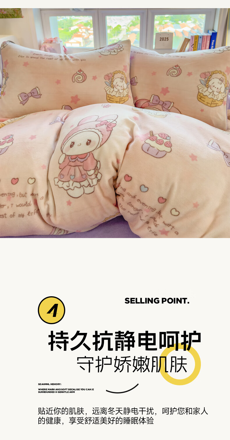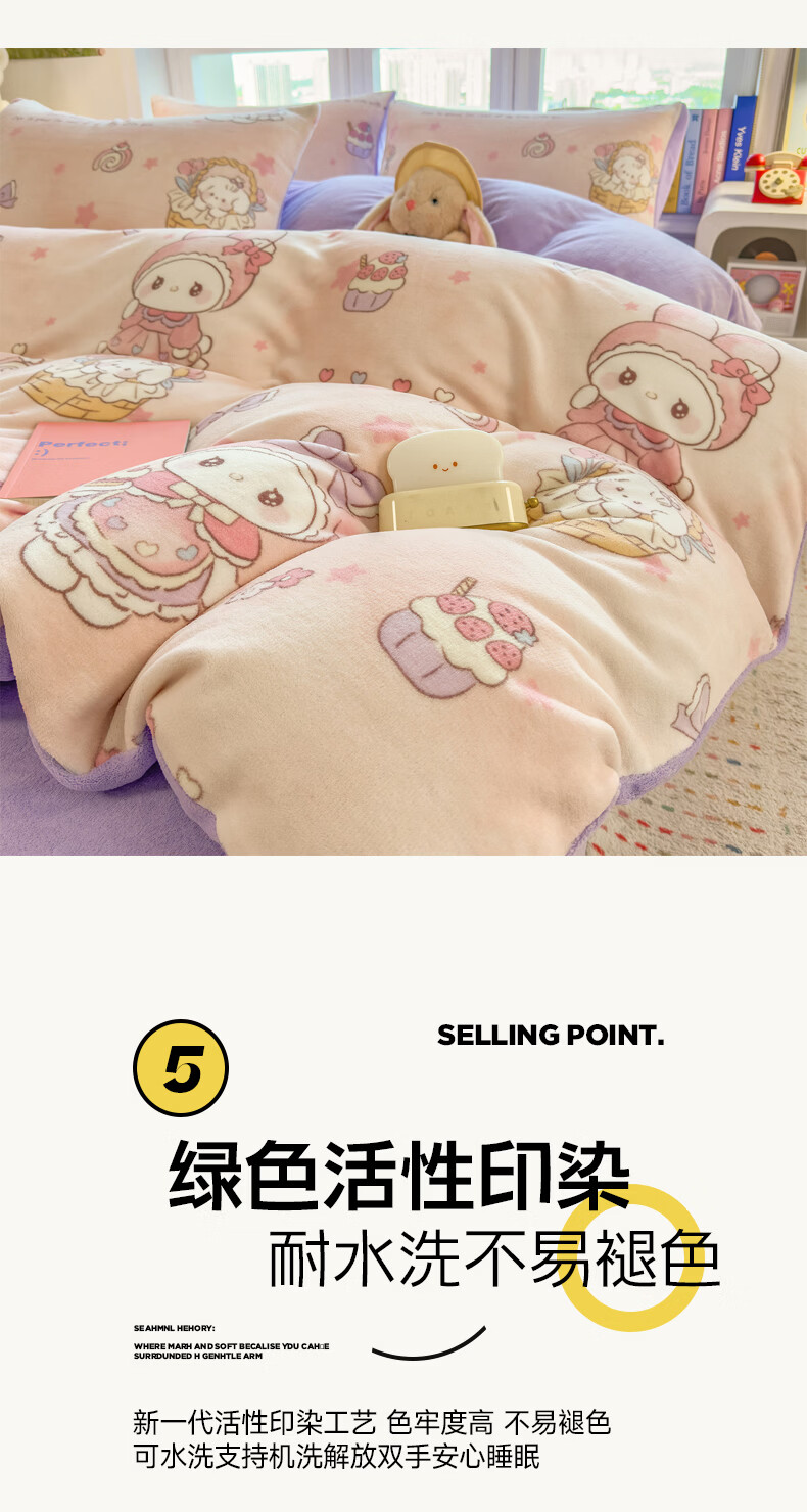 VJE秋冬加厚牛奶绒床上四件套可爱卡通加绒珊瑚绒床单被套三件套床品 萌兔小屋 四件套1.5m 床单款 (被套200*230cm)