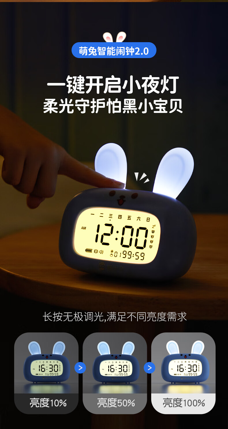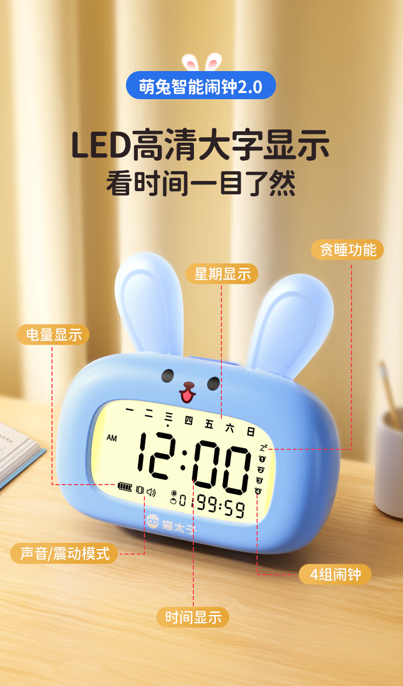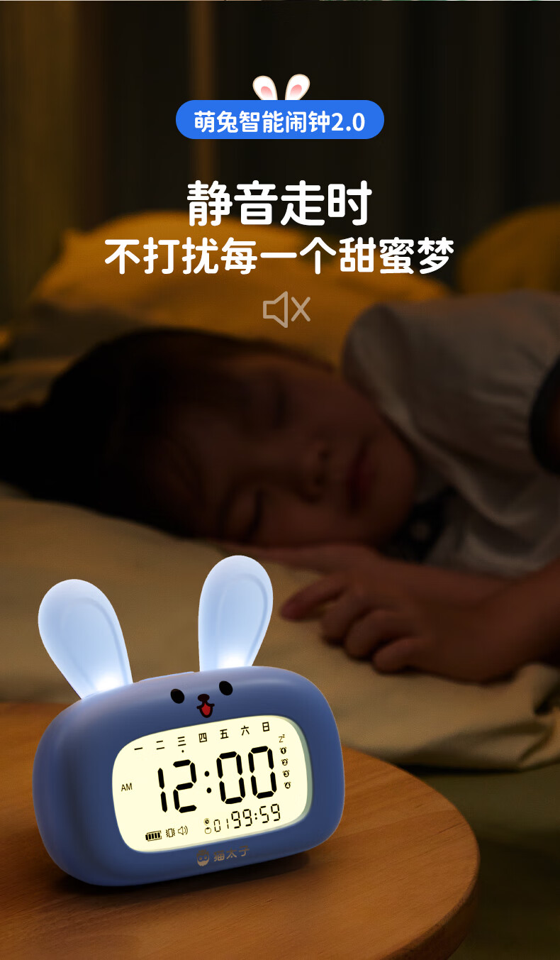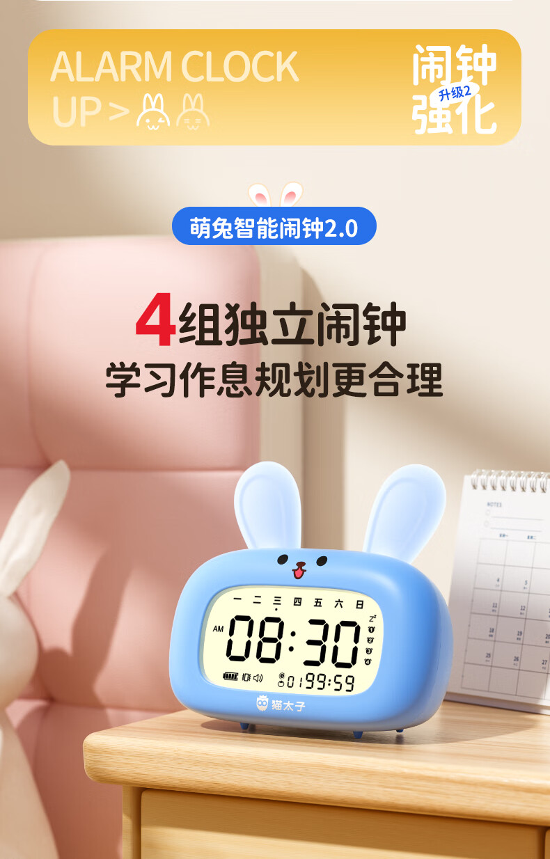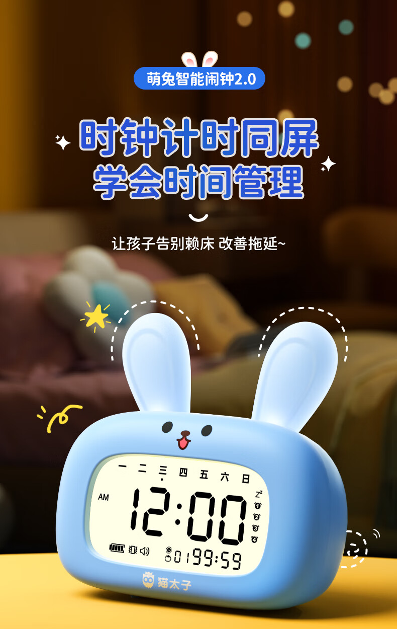 猫太子智能闹钟学生专用起床神器2025新款男女孩多功能卡通时钟儿童学习正倒计时器小夜灯时间管理器 兔子-天蓝色