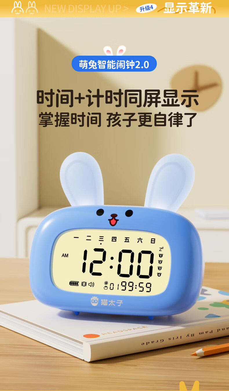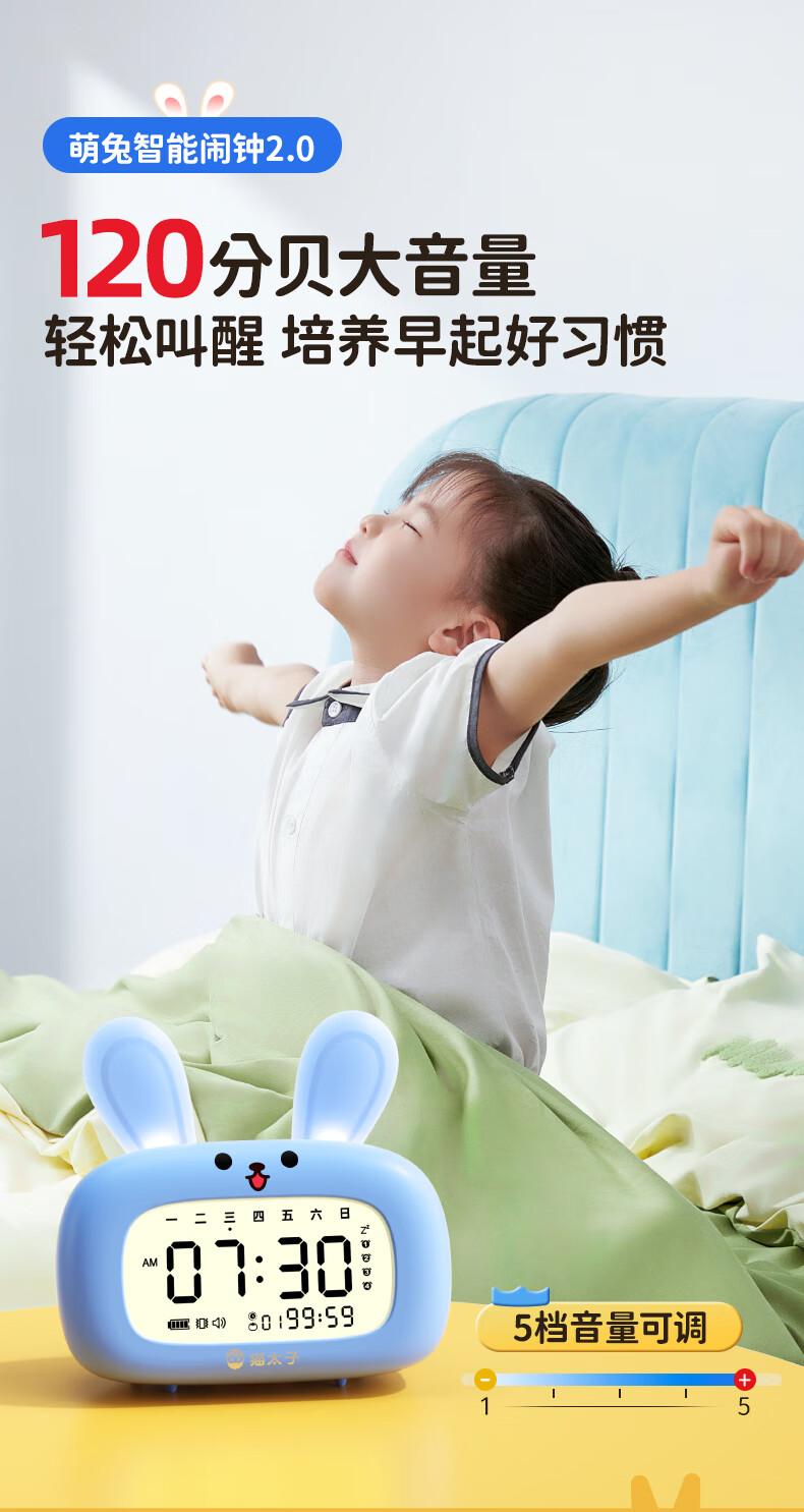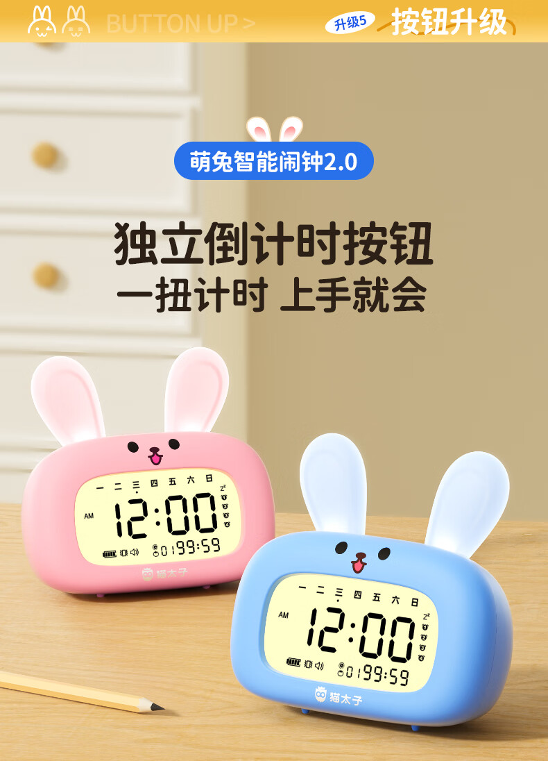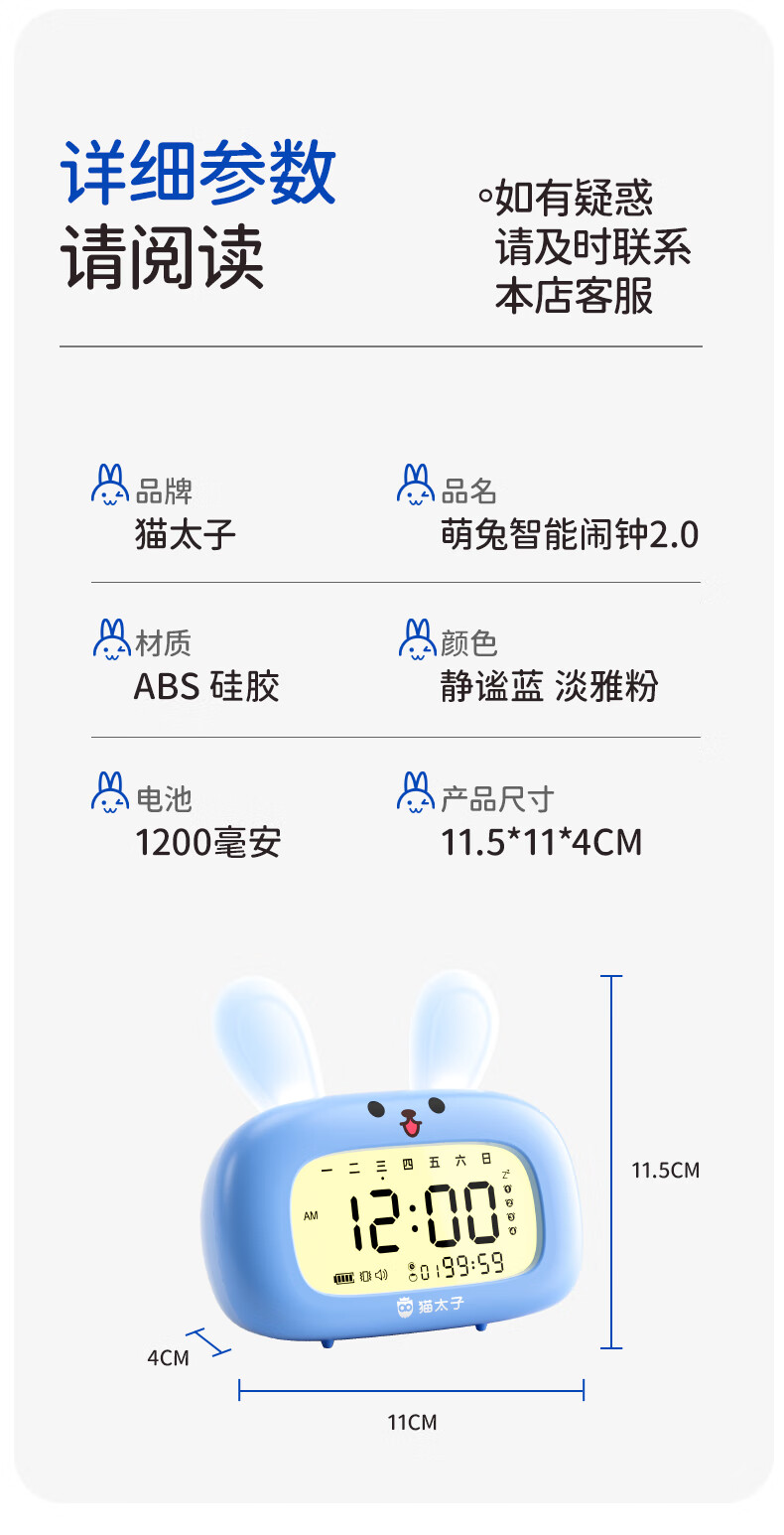 猫太子智能闹钟学生专用起床神器2025新款男女孩多功能卡通时钟儿童学习正倒计时器小夜灯时间管理器 兔子-天蓝色