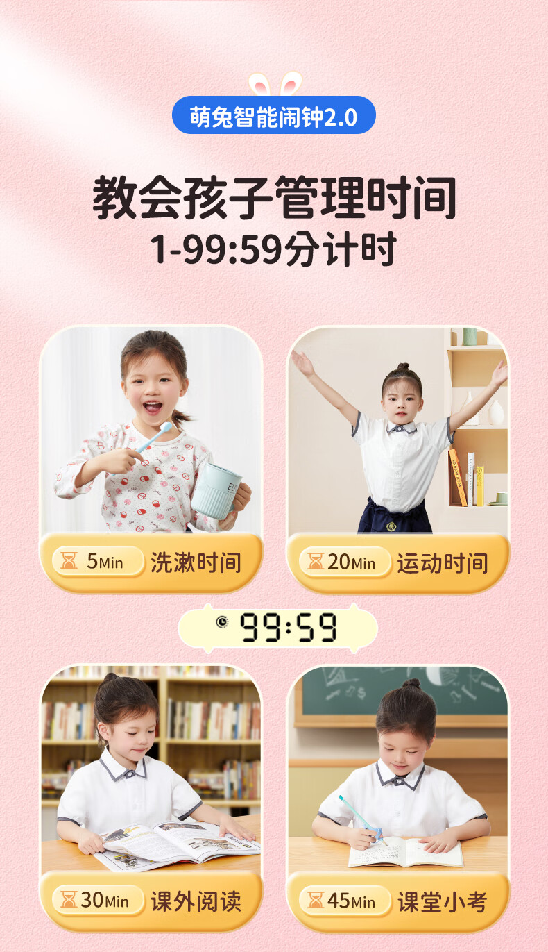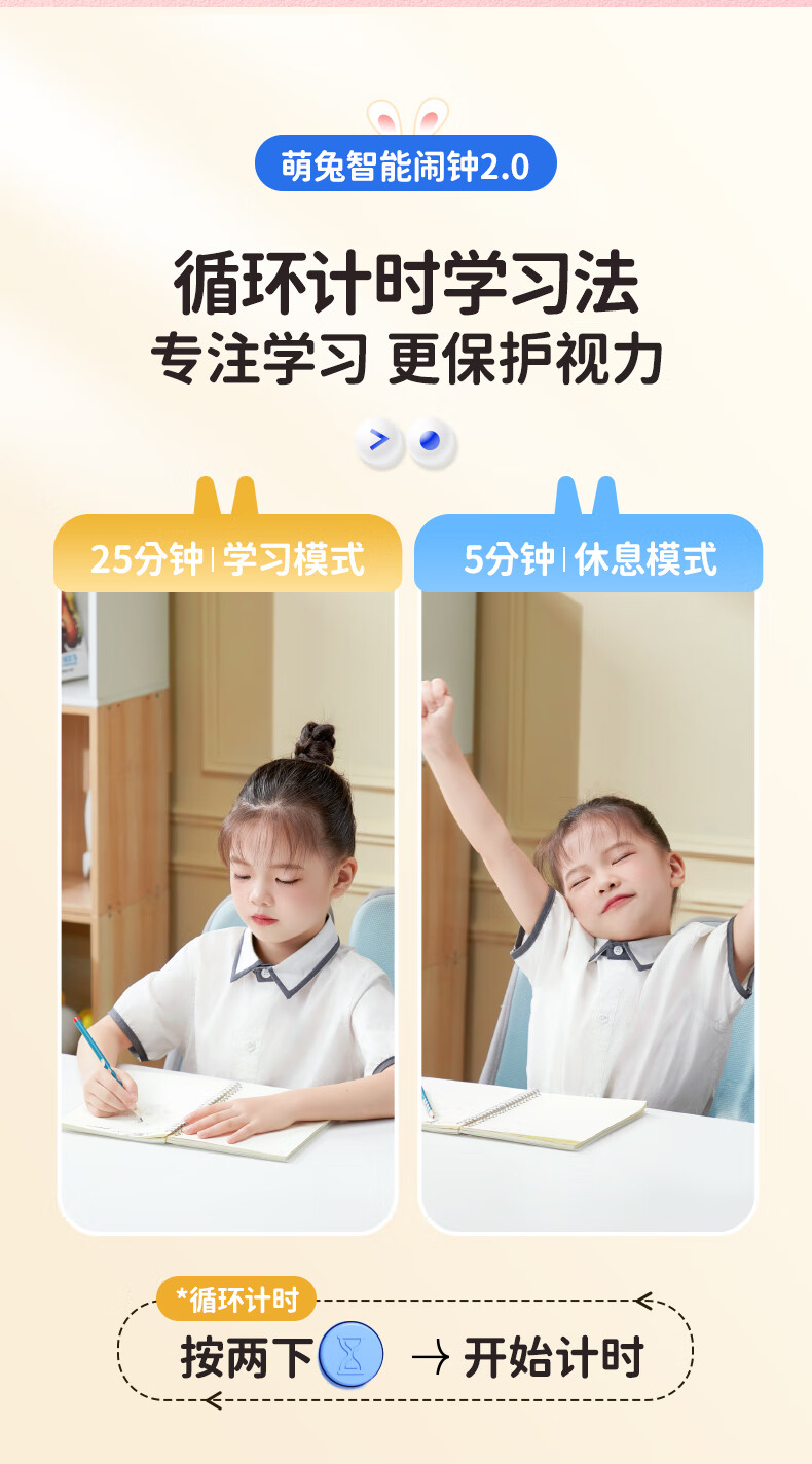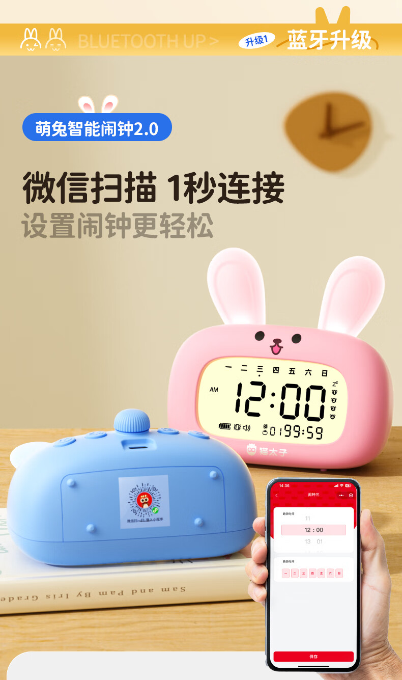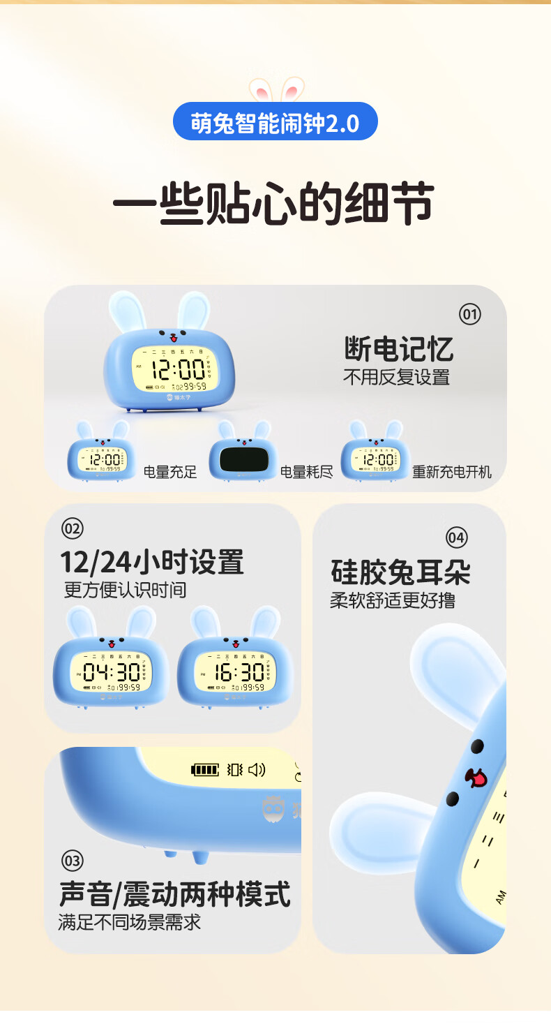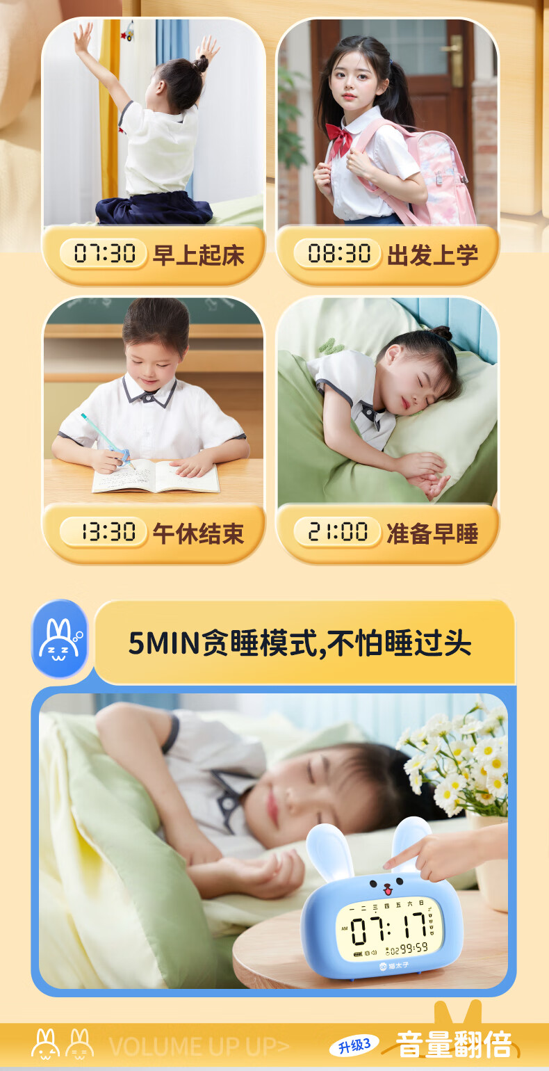猫太子智能闹钟学生专用起床神器2025新款男女孩多功能卡通时钟儿童学习正倒计时器小夜灯时间管理器 兔子-天蓝色