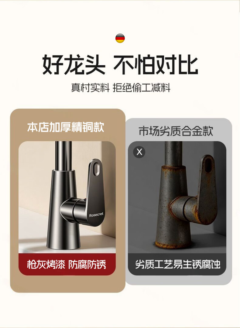 Rosecret【德国】全铜主体洗脸盆水龙头冷热水二合一厕所面盆万向旋转龙头 加厚台上盆双温龙头【枪灰色】 增压防溅丨配80cm冷热进水管*2