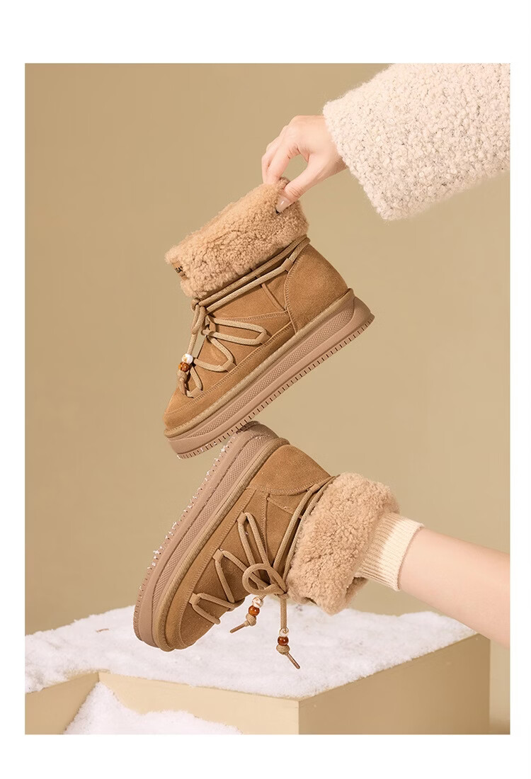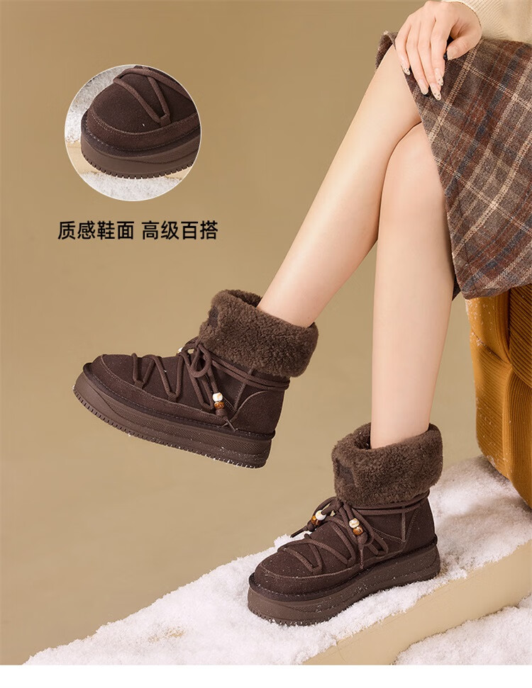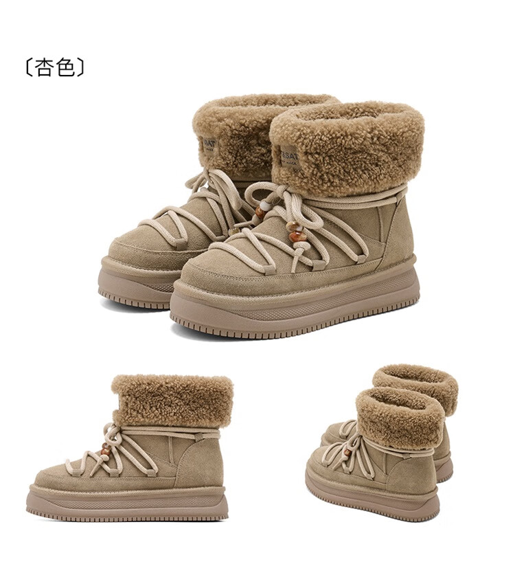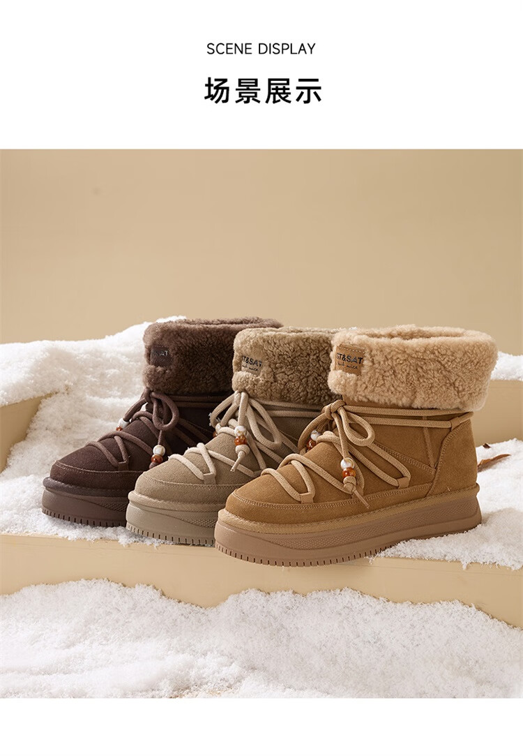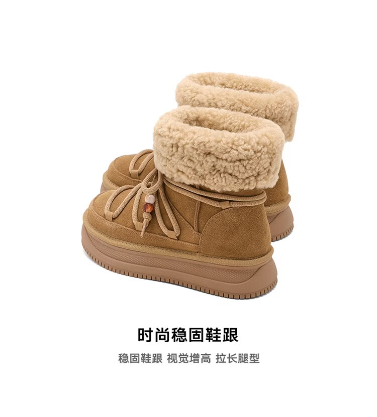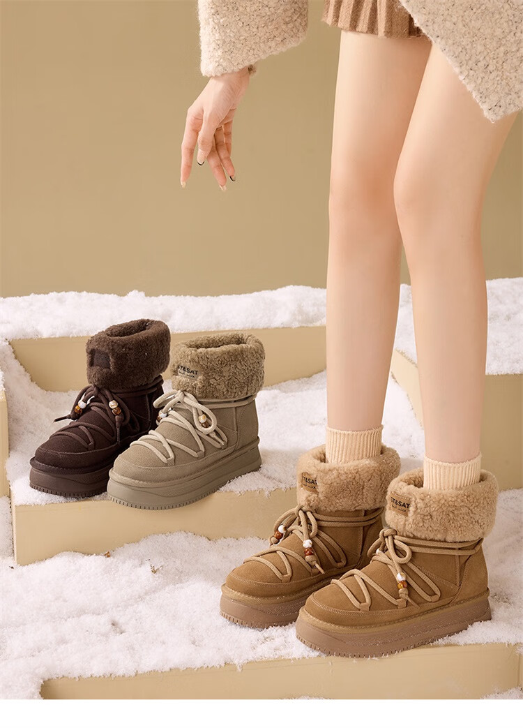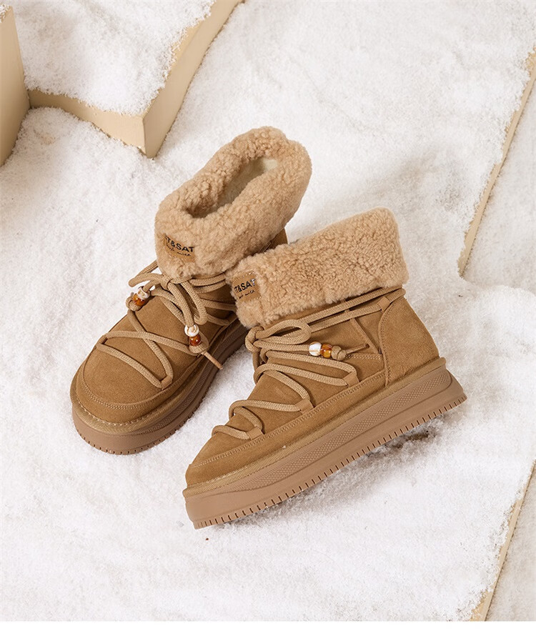 星期六厚底雪地靴女2025秋冬新款加绒加厚短靴增高面包鞋东北棉鞋 驼色 【牛剖层皮革+羊毛】 38