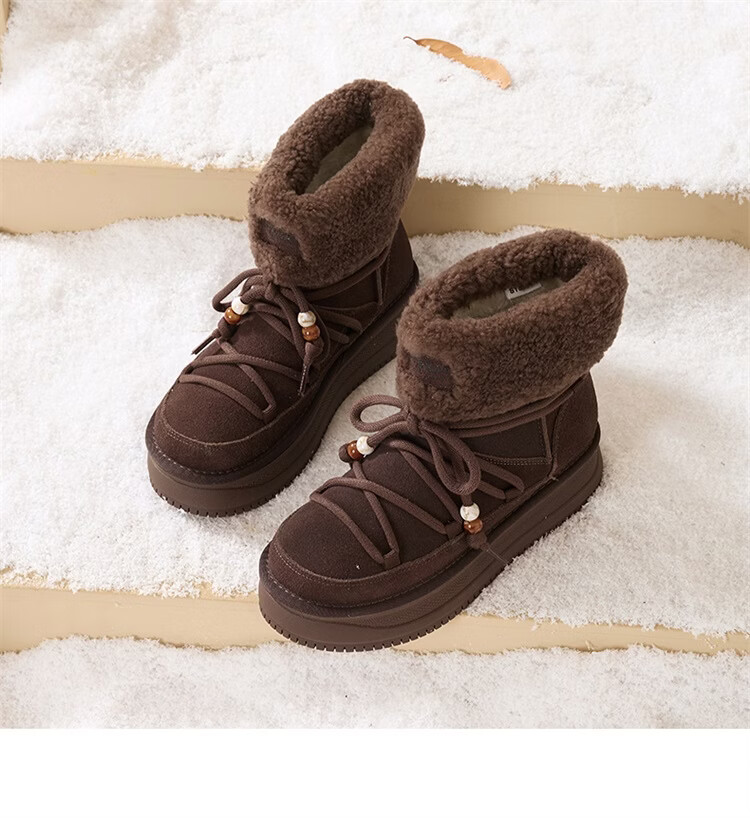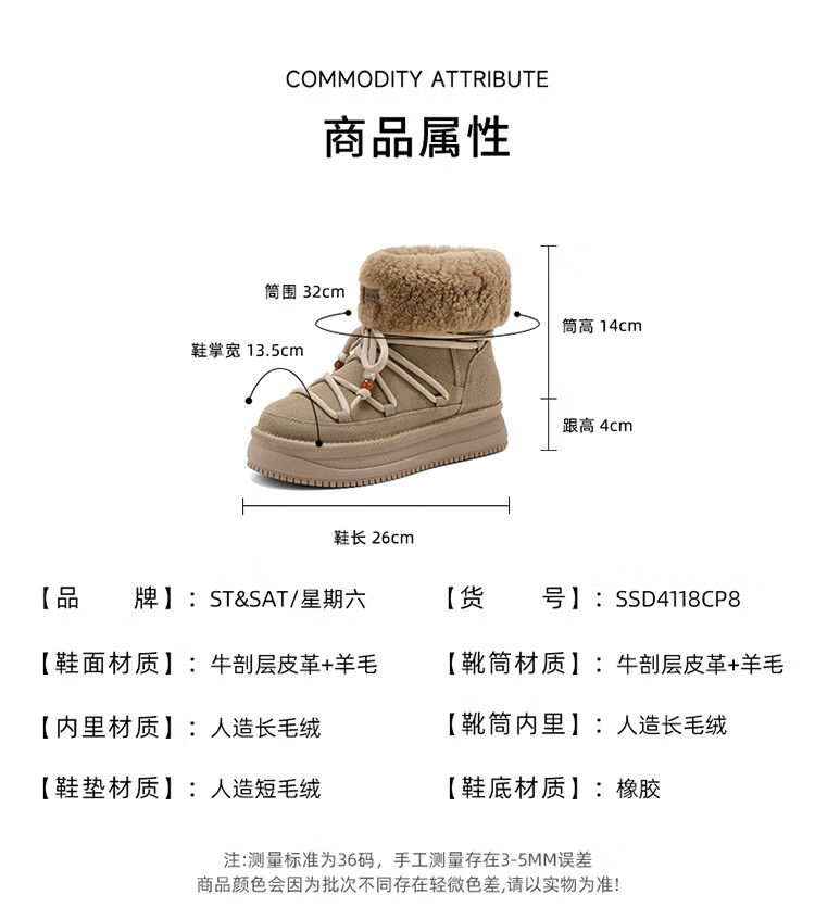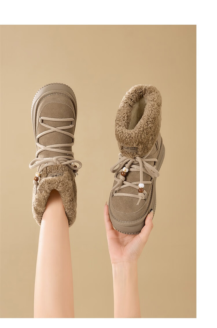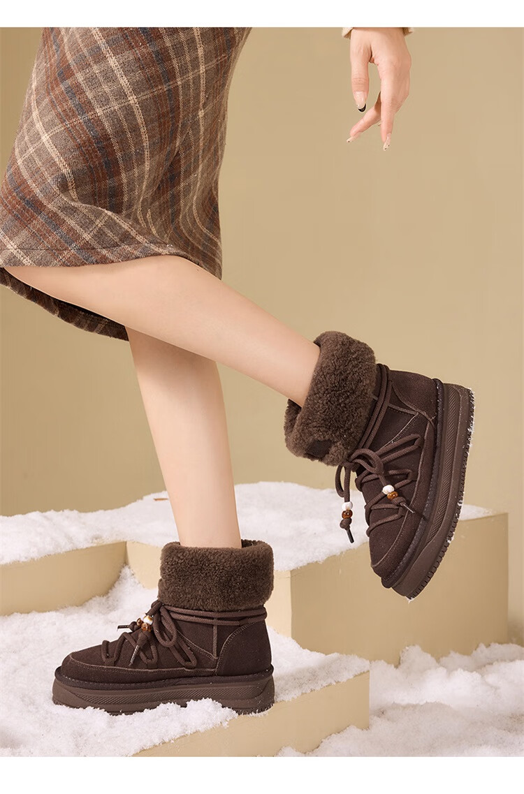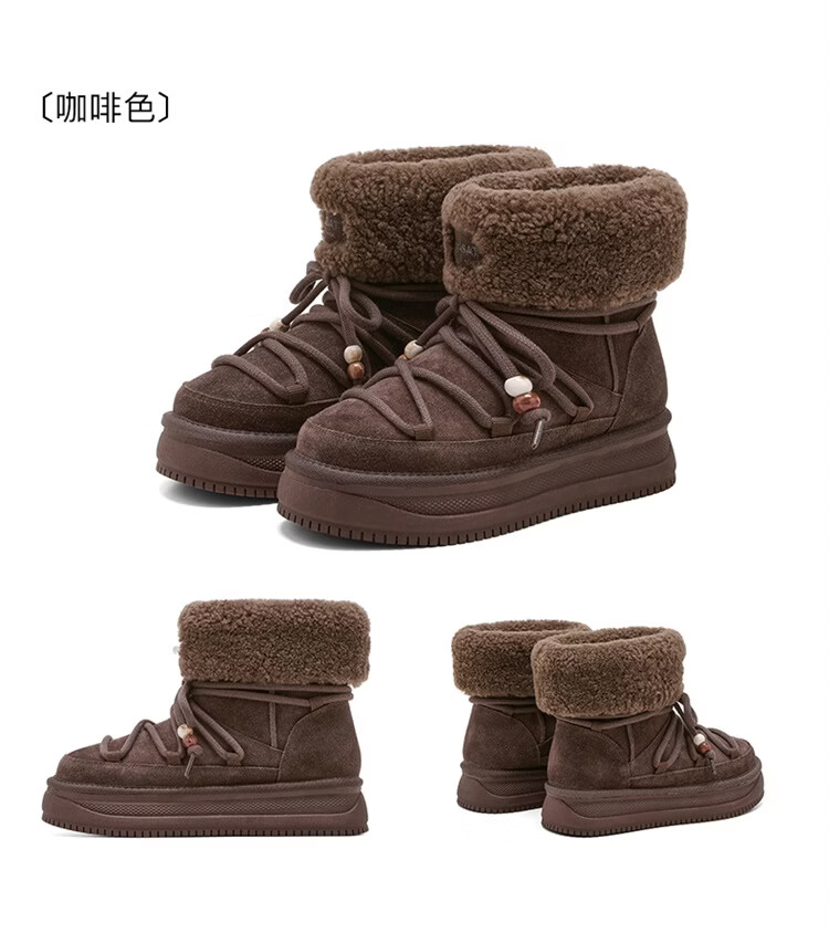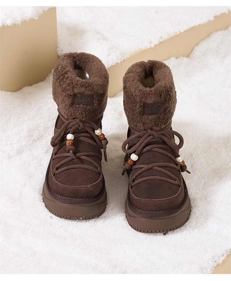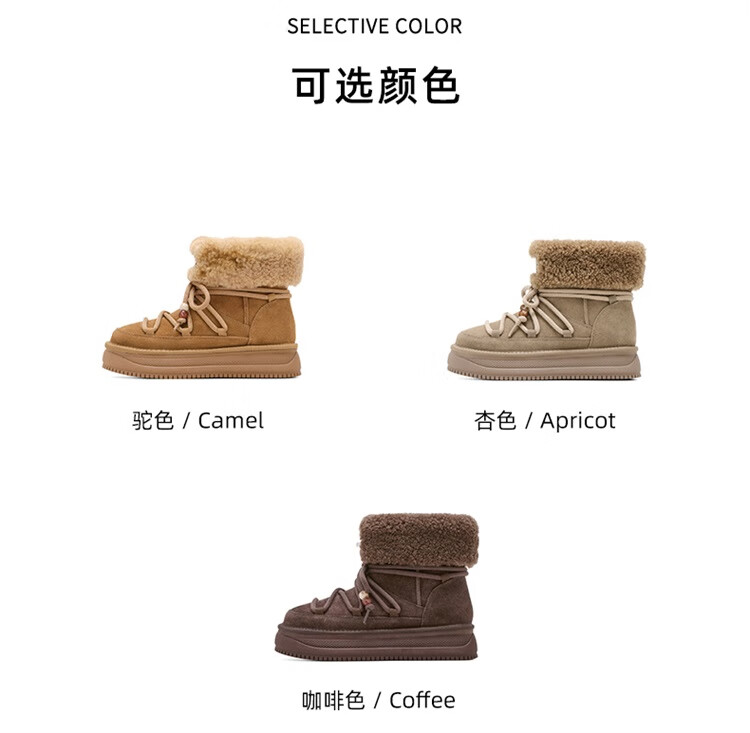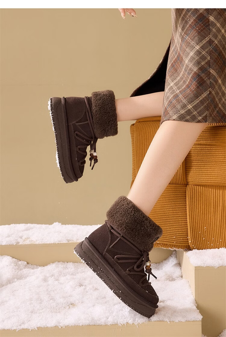 星期六厚底雪地靴女2025秋冬新款加绒加厚短靴增高面包鞋东北棉鞋 驼色 【牛剖层皮革+羊毛】 38