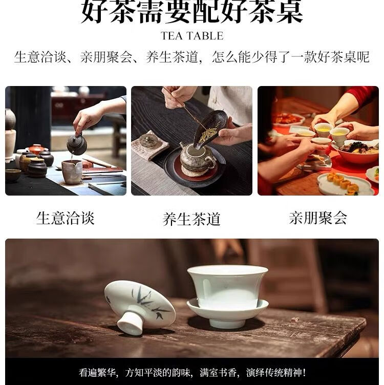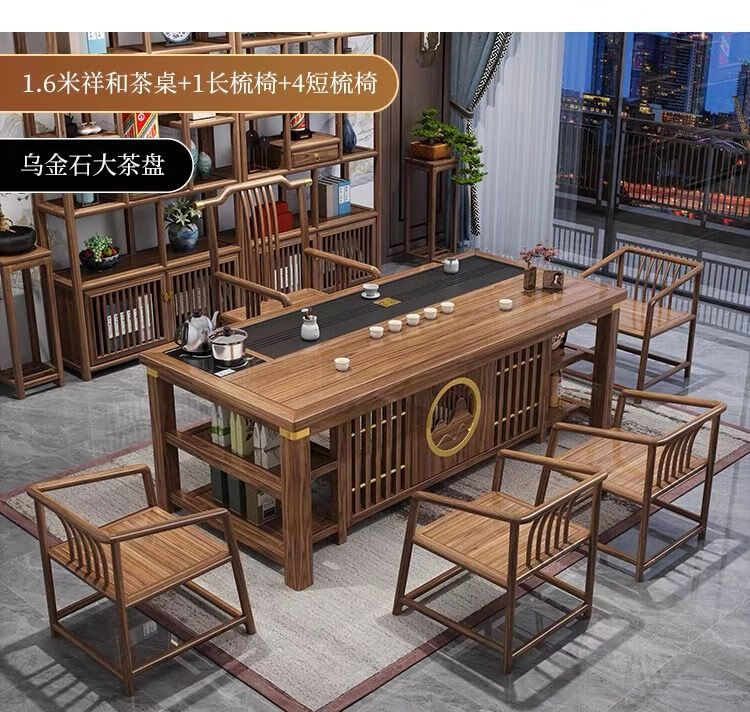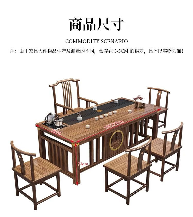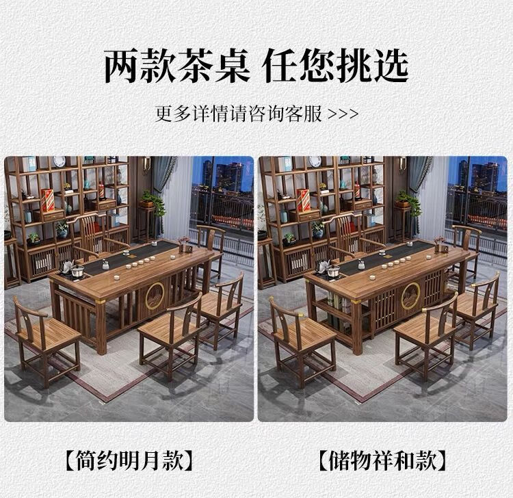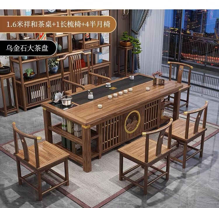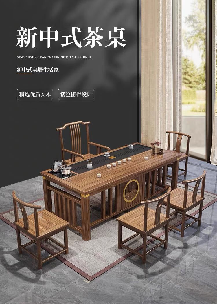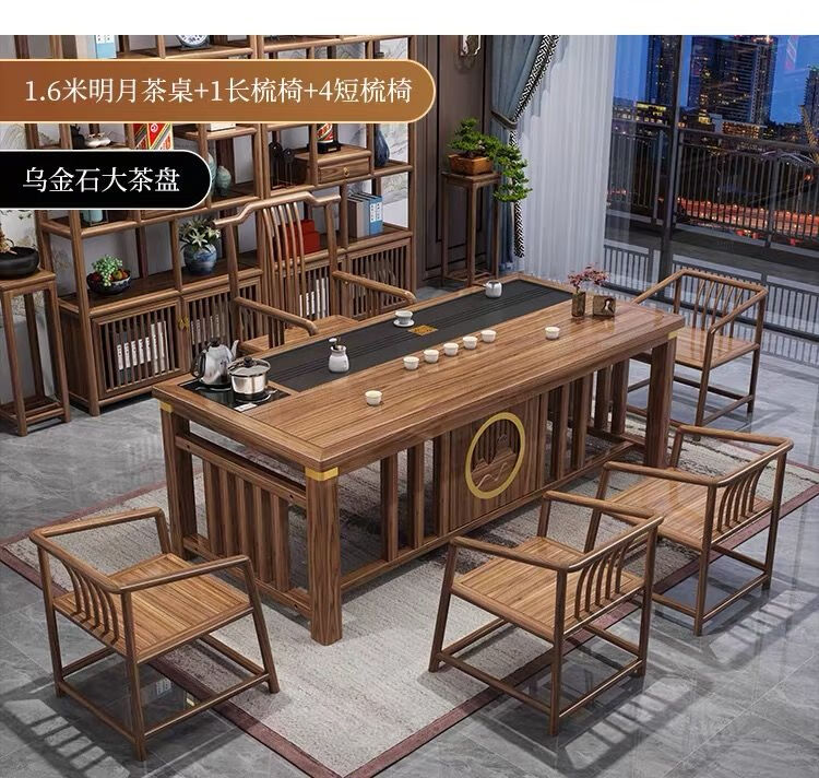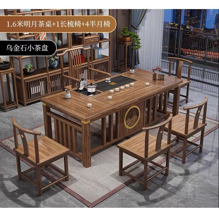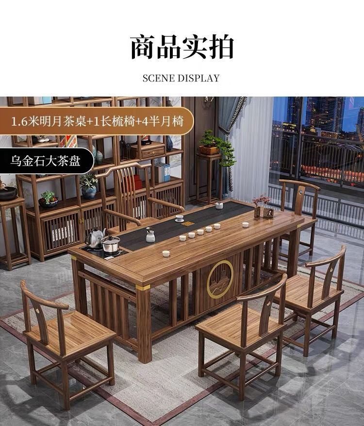 倘然之家实木茶桌椅组合新中式实木功夫茶几一体家用喝茶小户型阳台泡茶台 胡桃色1米明月+3月牙椅【小石盘】