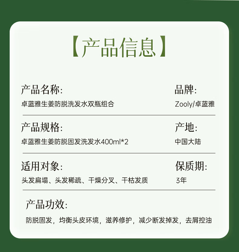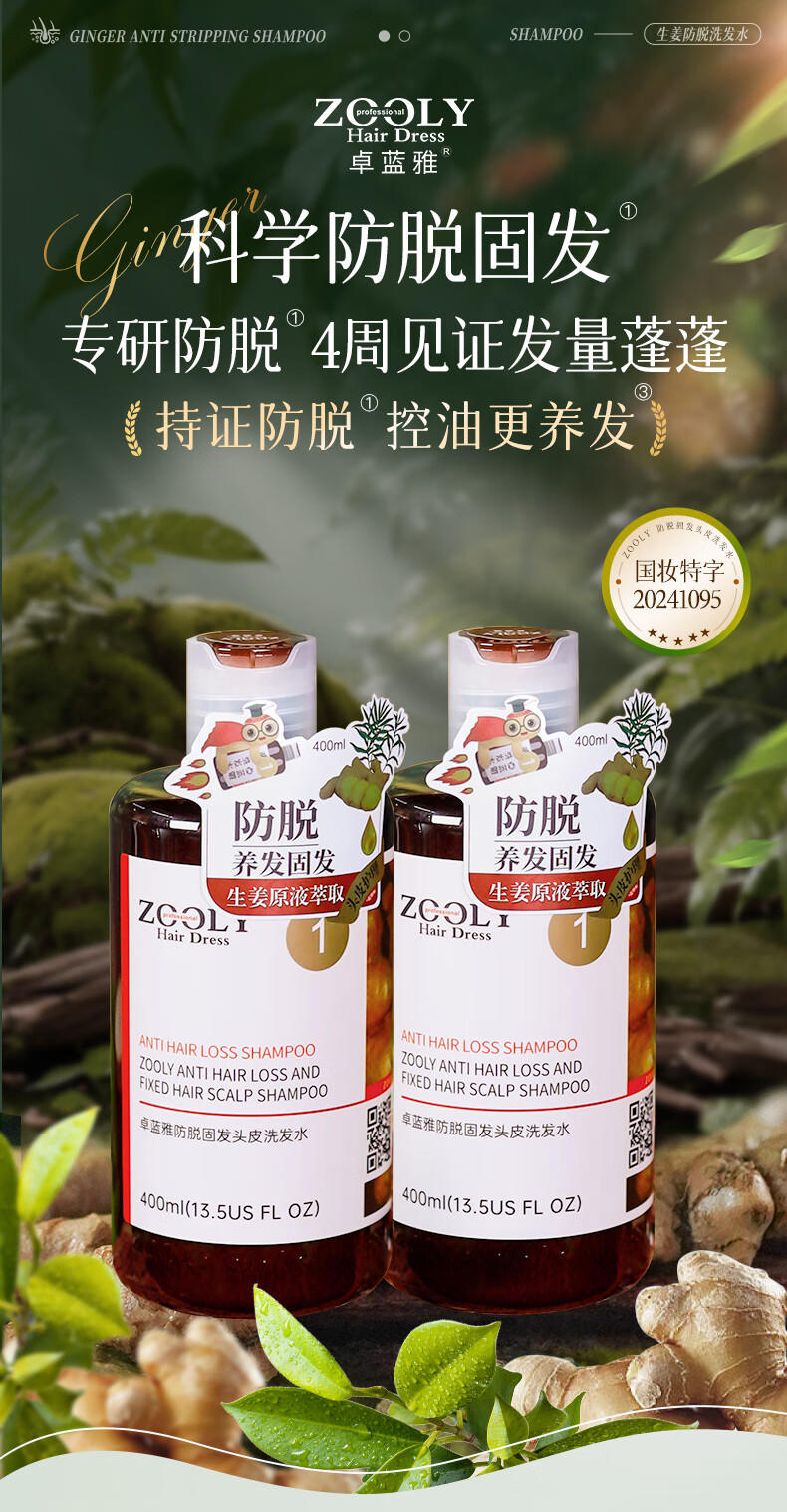 卓蓝雅(ZOOLY)生姜防脱固发洗发露控油清洁洗发水男女士通用 生姜防脱固发洗发水400ml*2