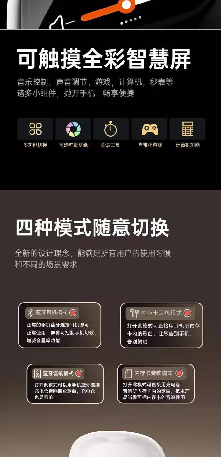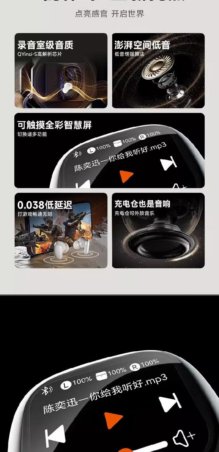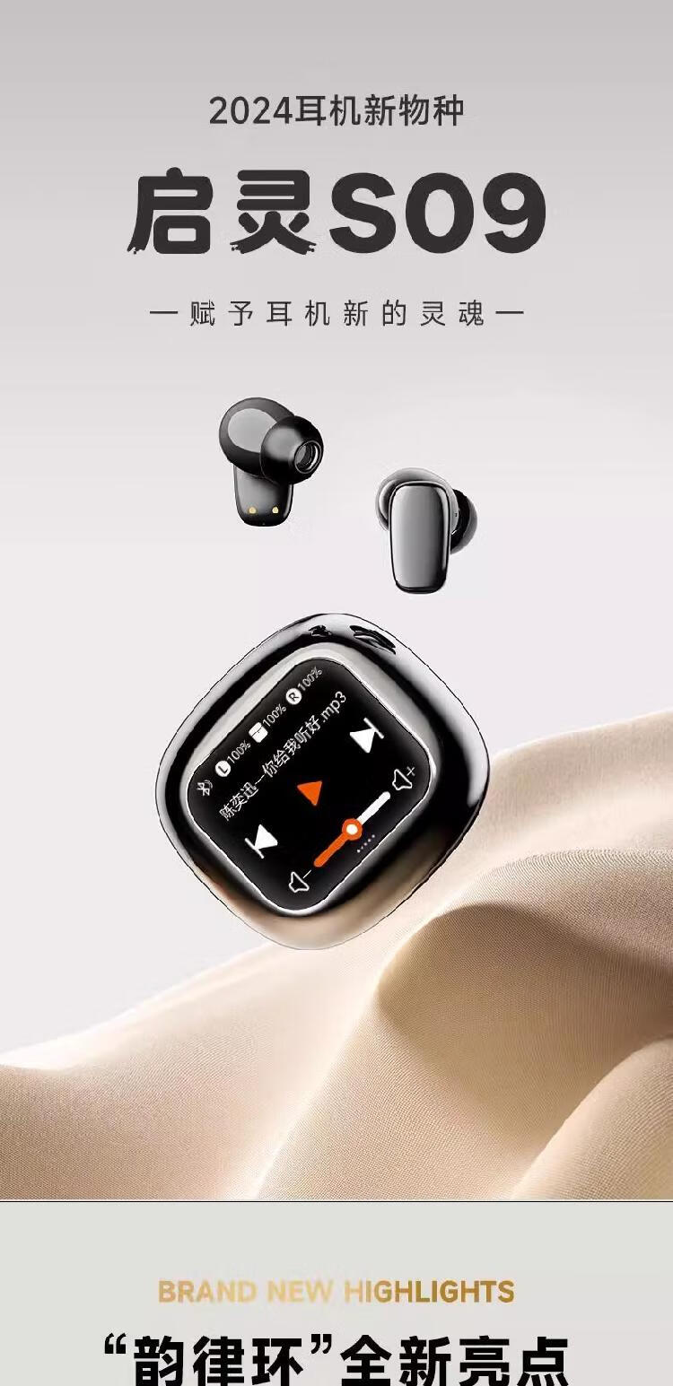 琴音(QY)启灵S09蓝牙耳机带屏幕降噪超长续航无线运动游戏音乐触屏插卡入 黑色【四种模式切换|多功能智慧屏幕】
