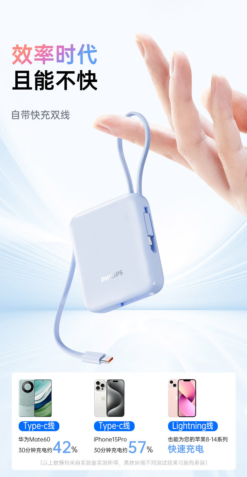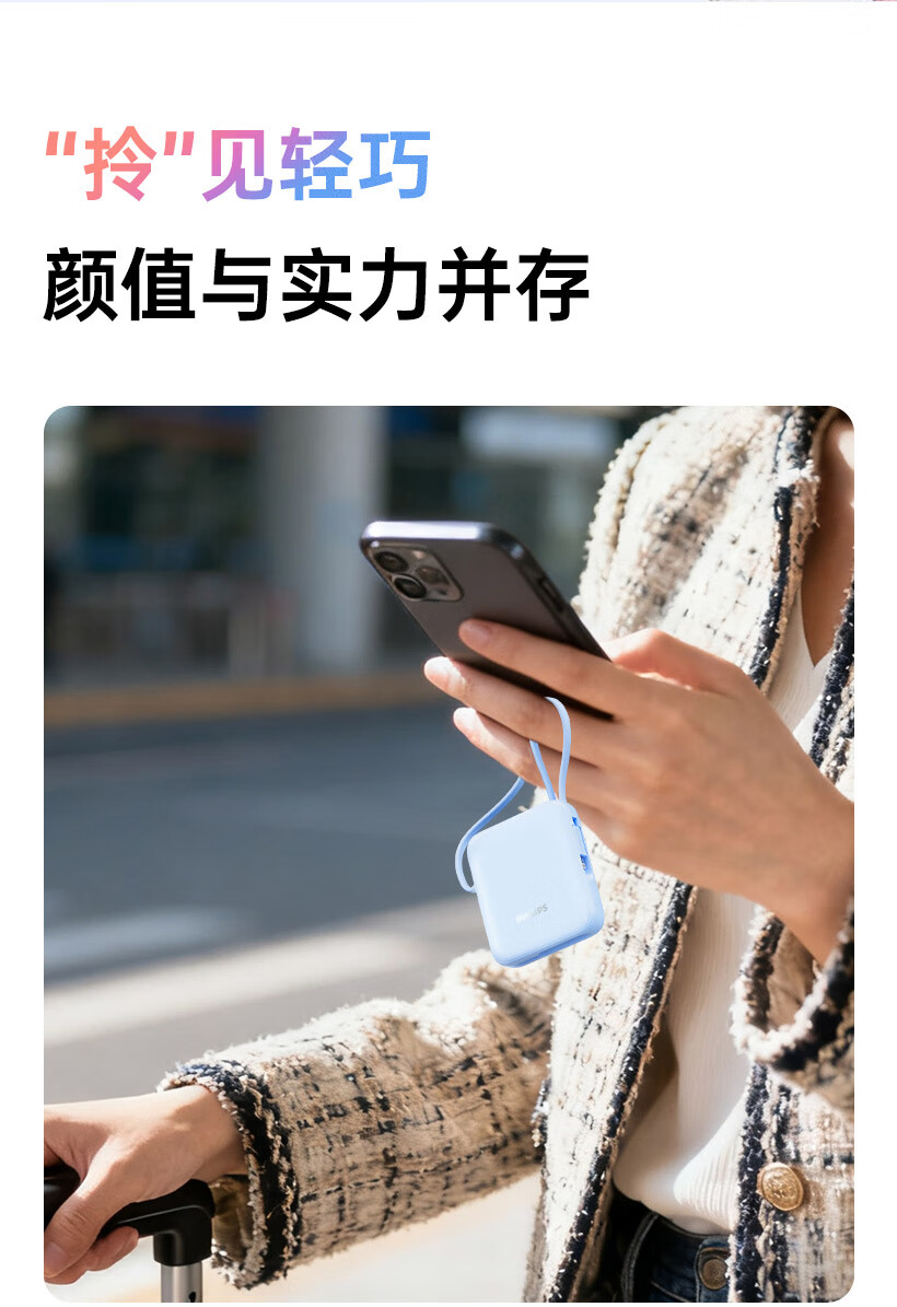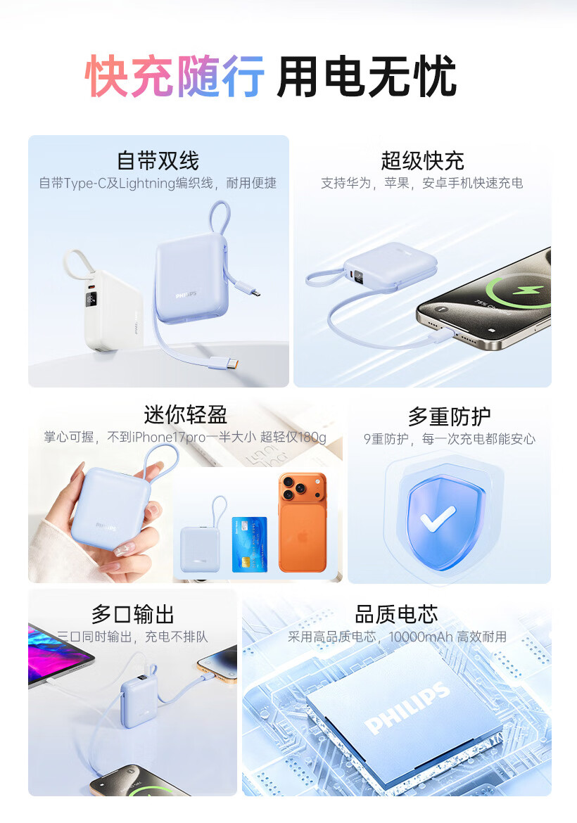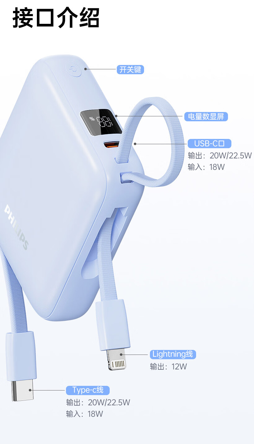 飞利浦3C认证可上飞机充电宝自带线22.5W超级快充迷你小巧便携10000毫安时移动电源适用苹果16 17华为