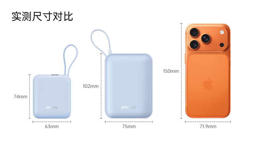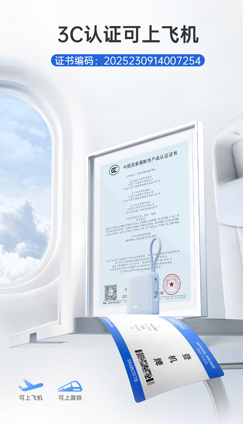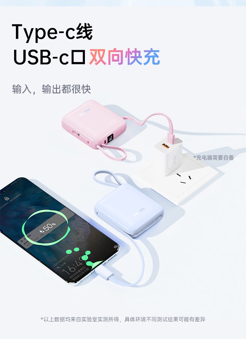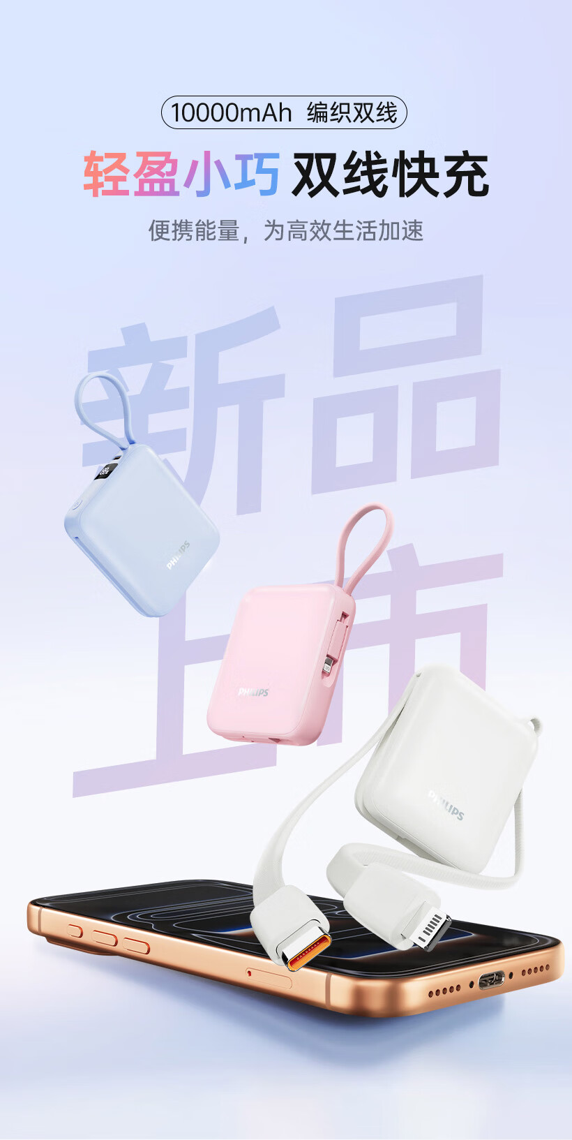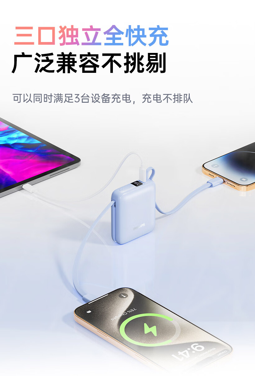 飞利浦3C认证可上飞机充电宝自带线22.5W超级快充迷你小巧便携10000毫安时移动电源适用苹果16 17华为