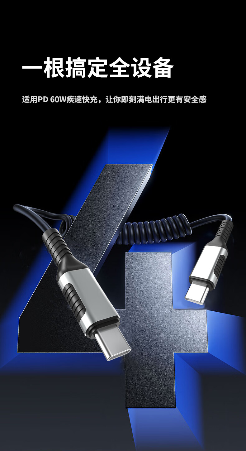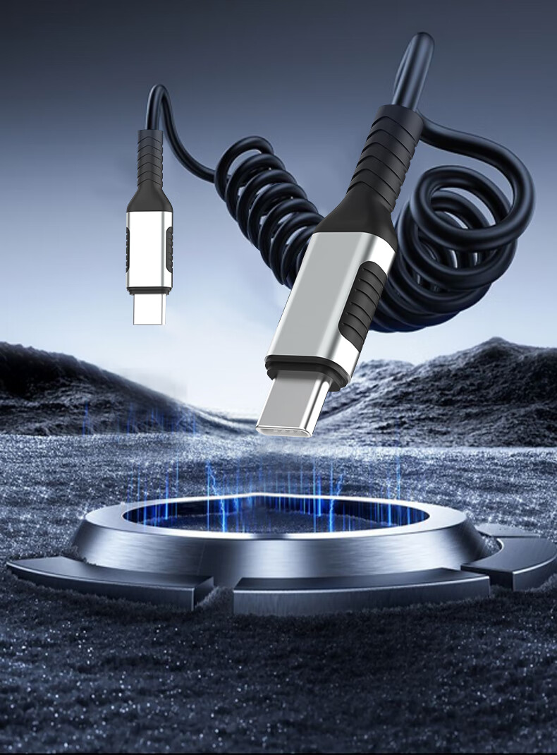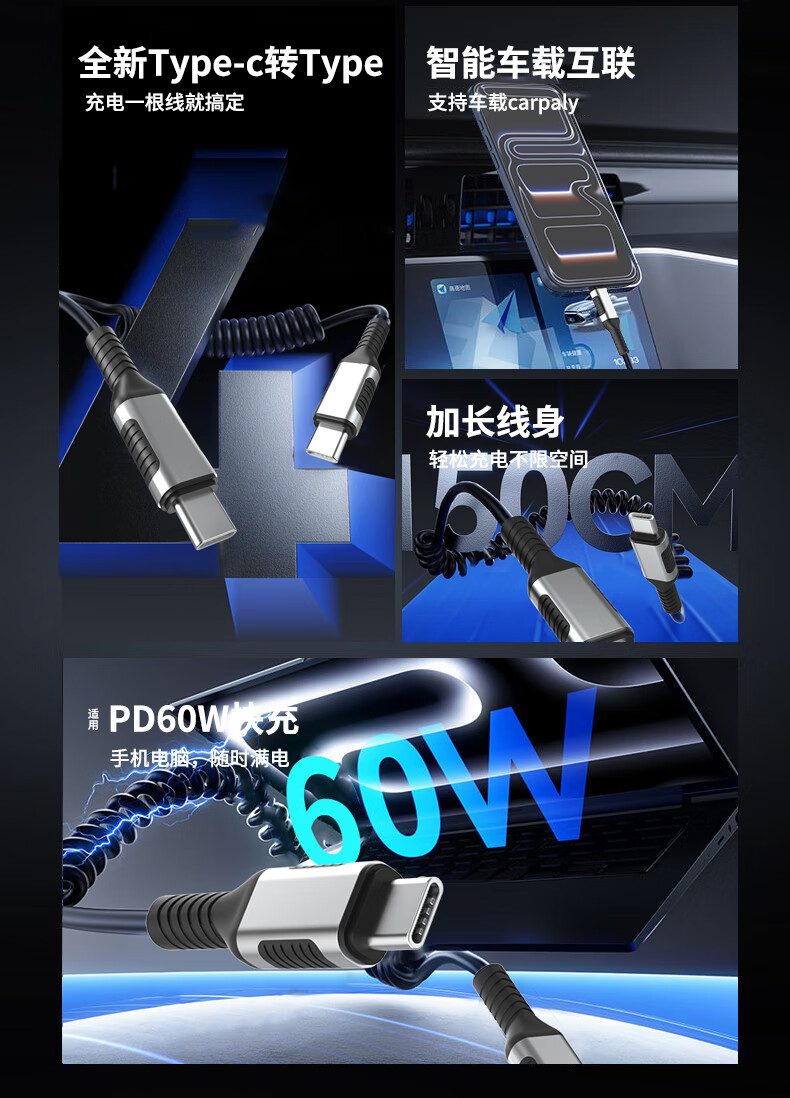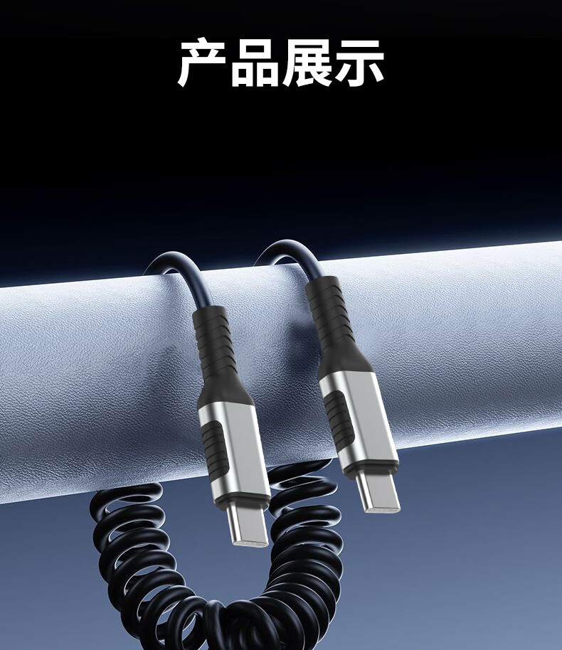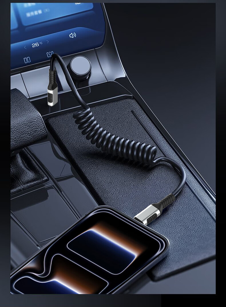Smorss车载弹簧线双头Type-C数据线PD60W快充电线ctoc车载适用华为超级快充苹果16/15Pro平板