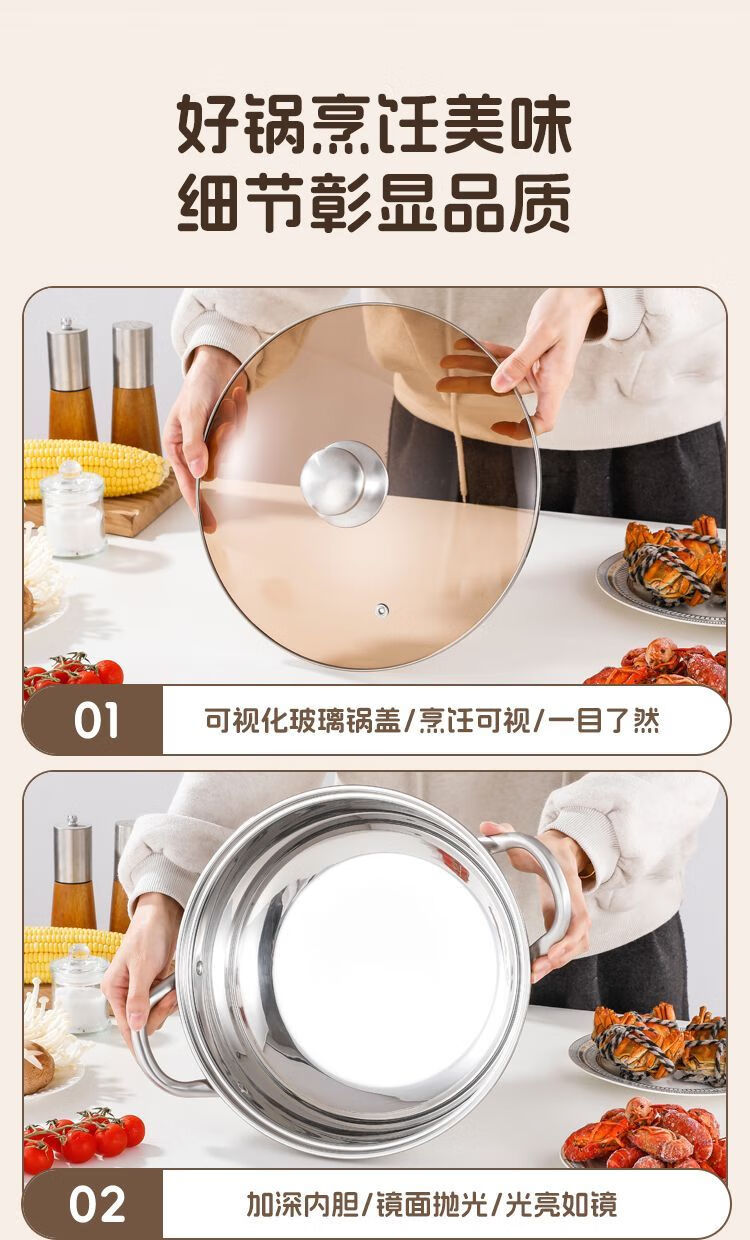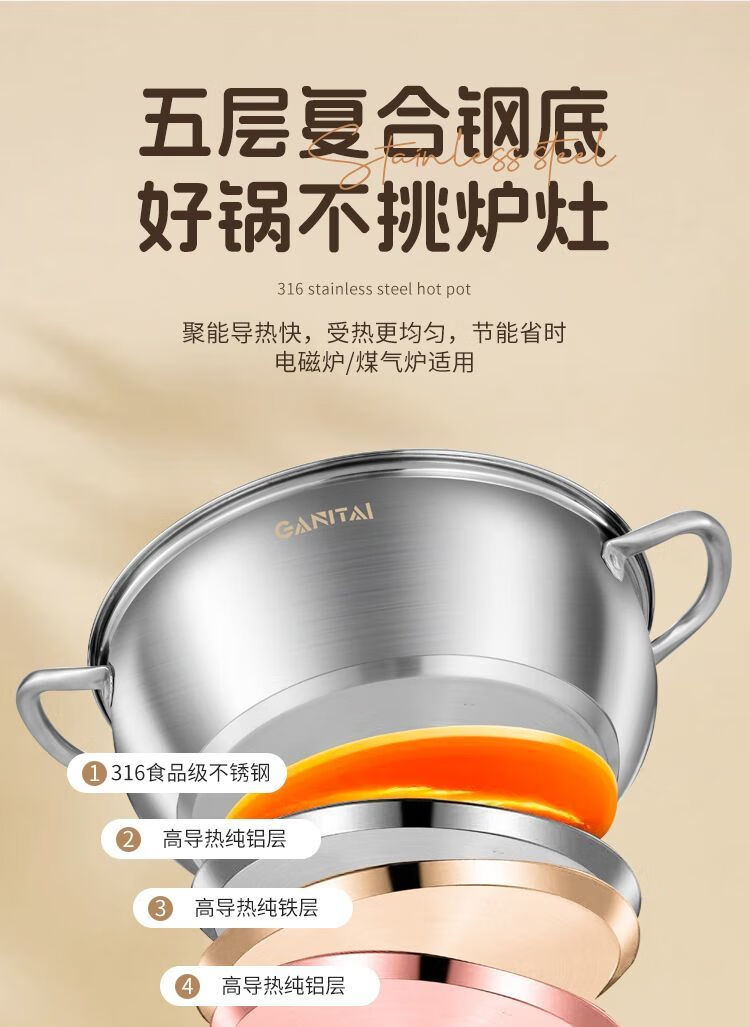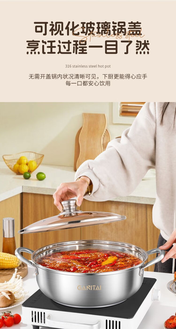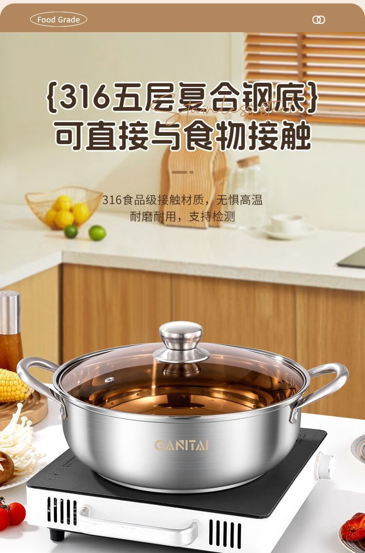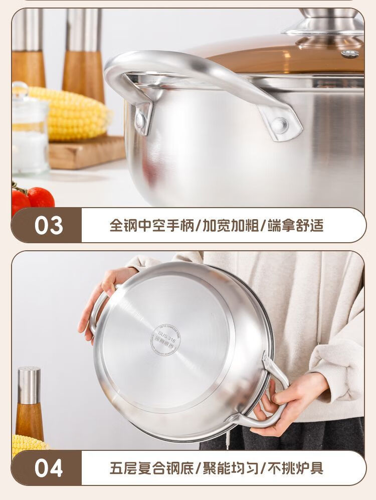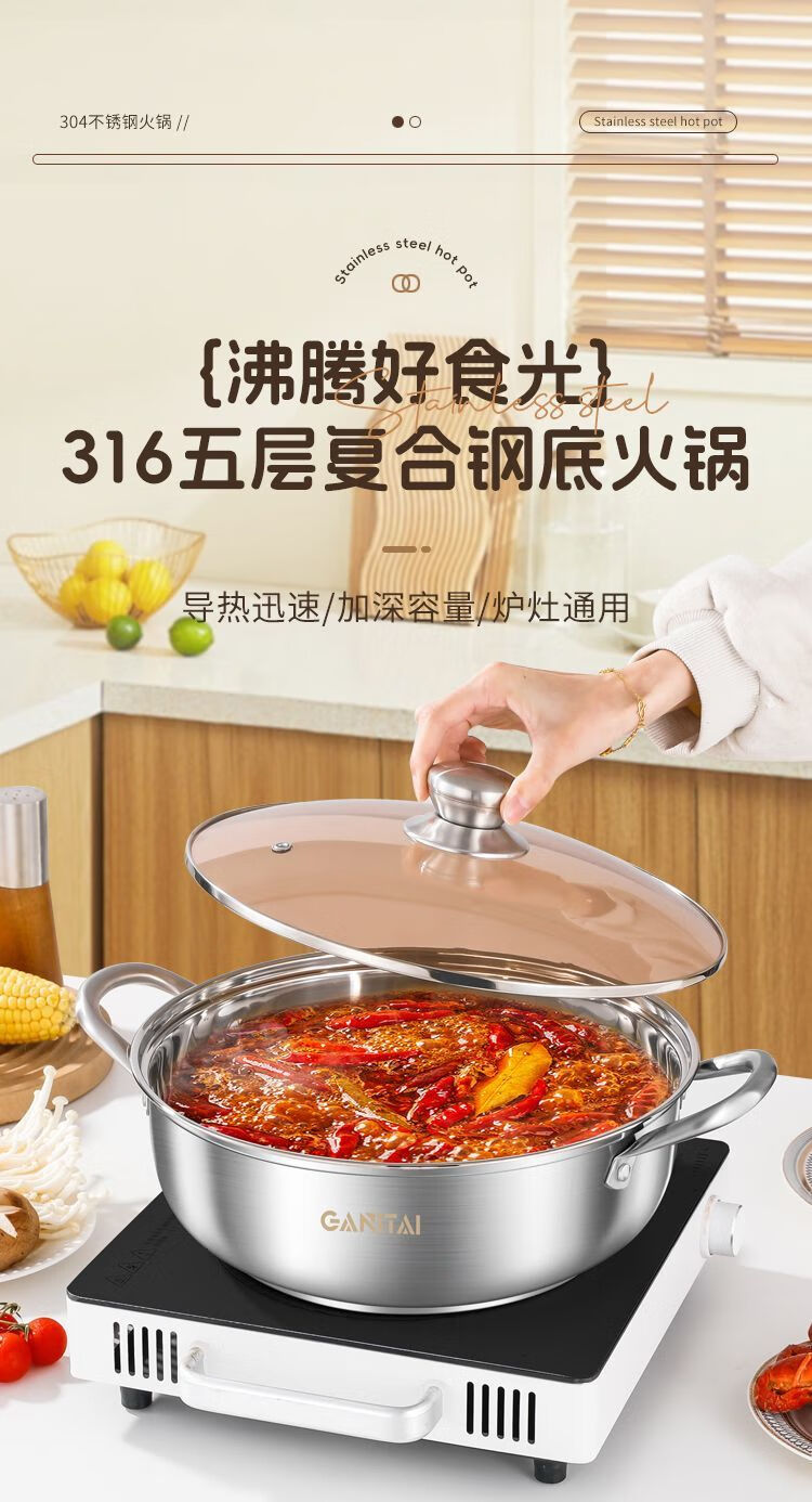 简漾316不锈钢火锅锅特厚加大加深汤锅家用大容量火锅燃气电磁炉通用 316五层复合钢底【平底0涂层】带盖 1英寸 旗舰版-28cm