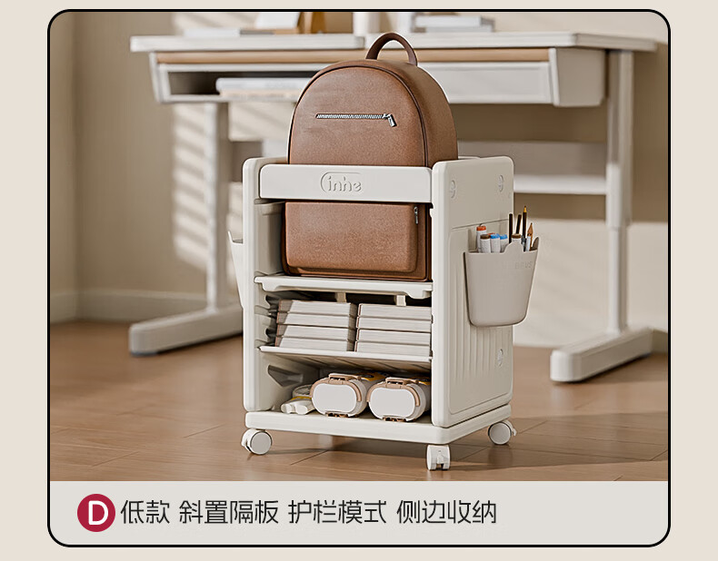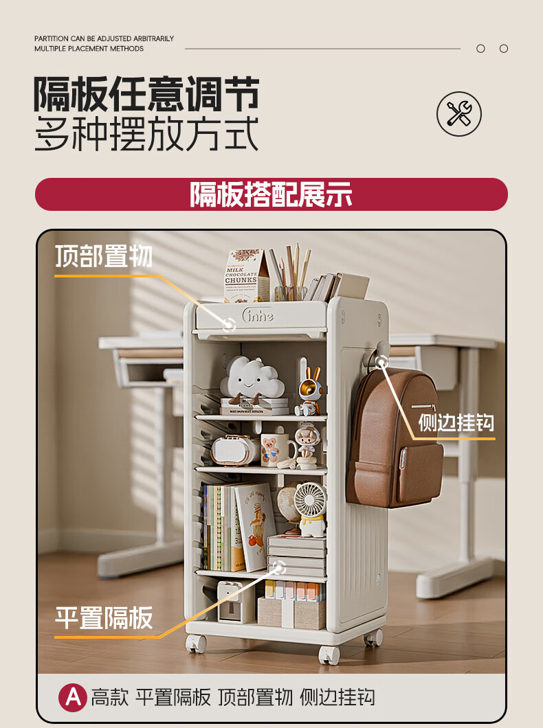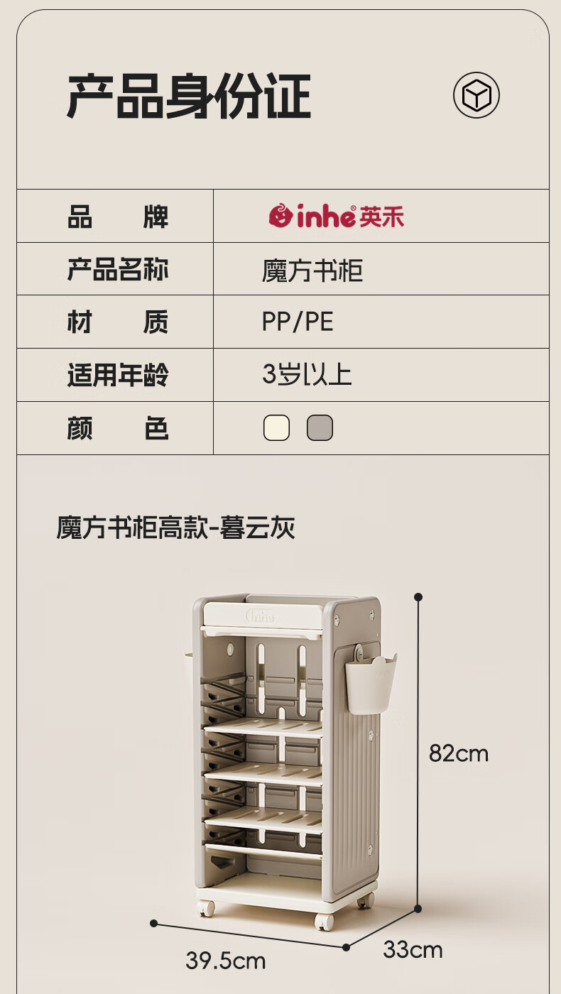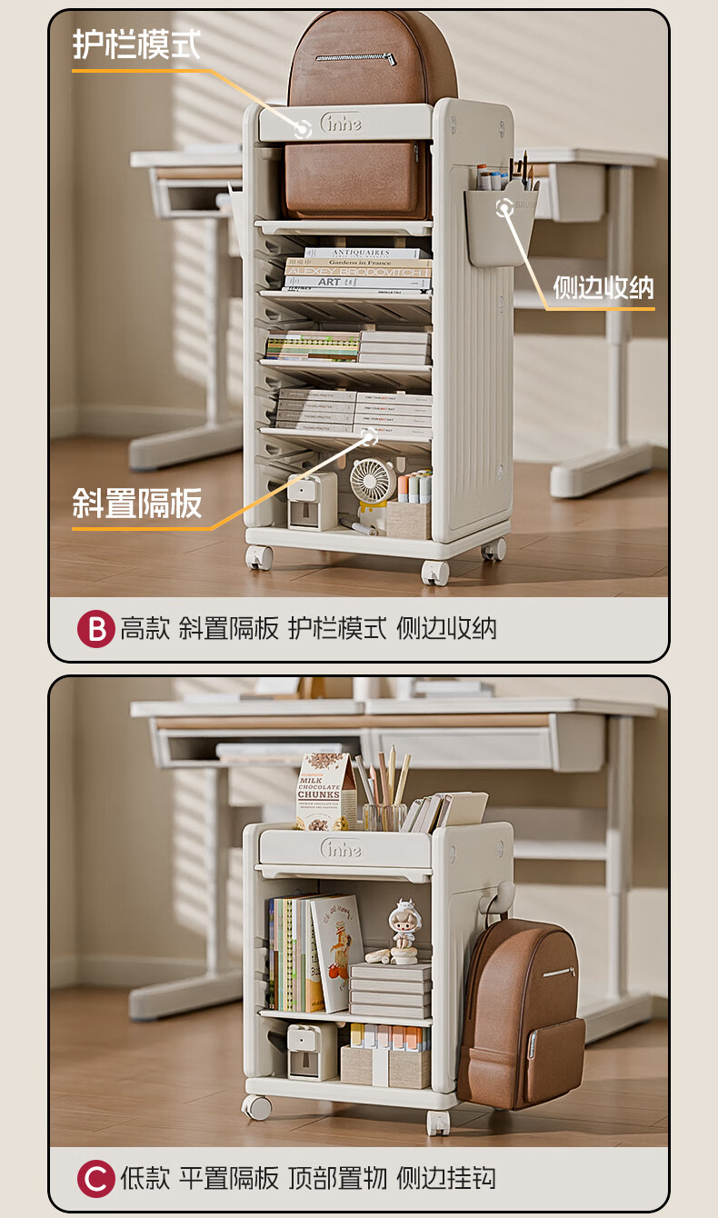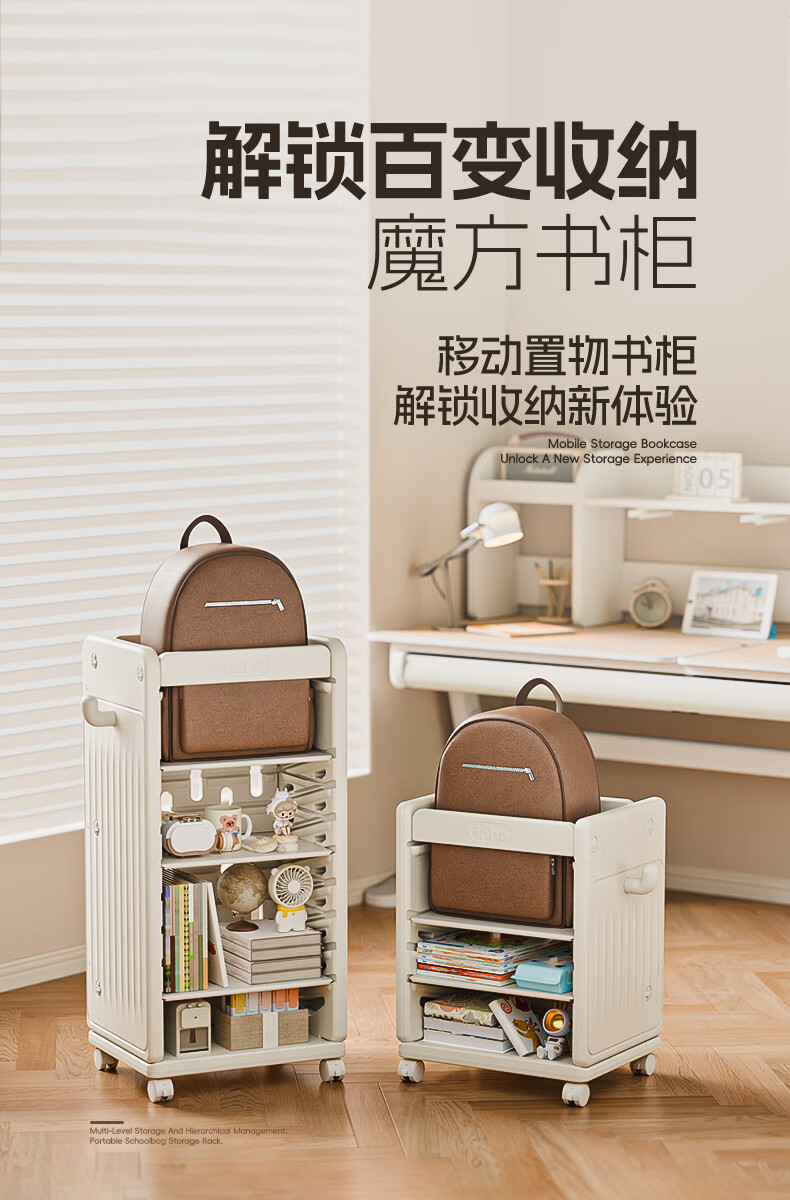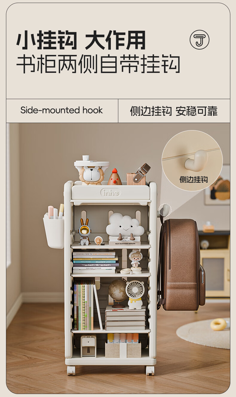 英禾儿童书架落地书包柜储物可移动小推车学习书本收纳神器简易书房 暮云灰-高款【横斜卡槽专利-顶板可移动】赠挂钩+挂盒
