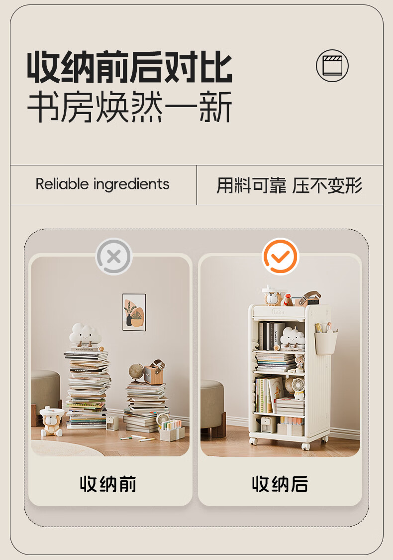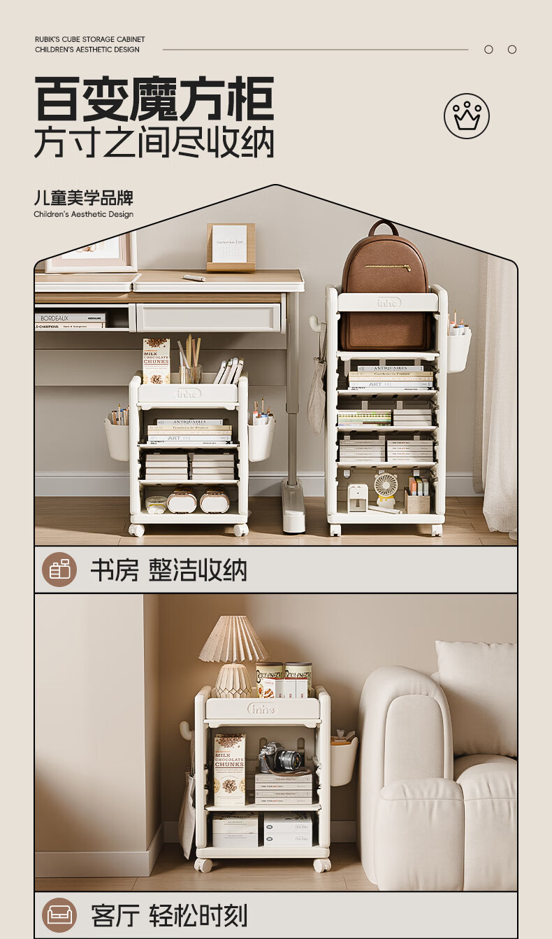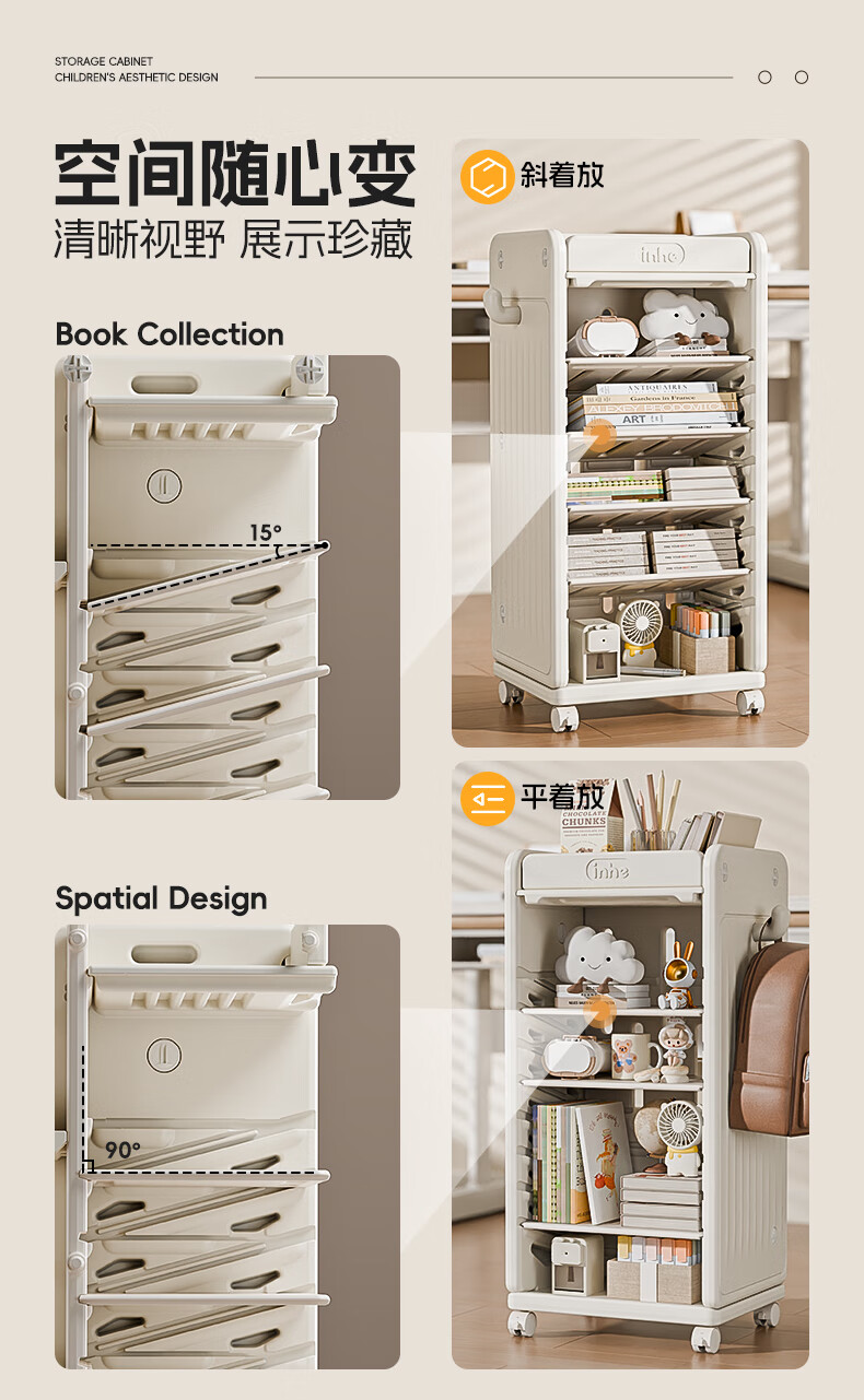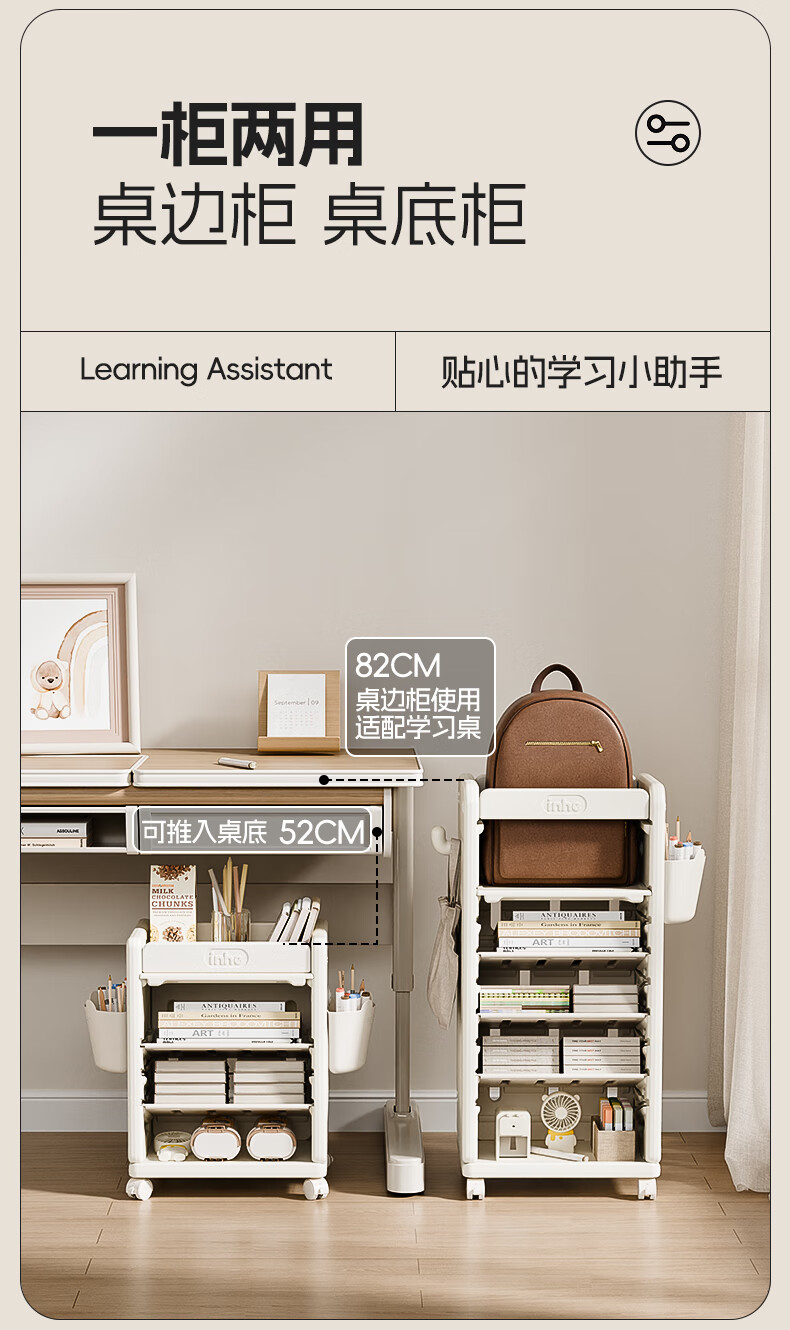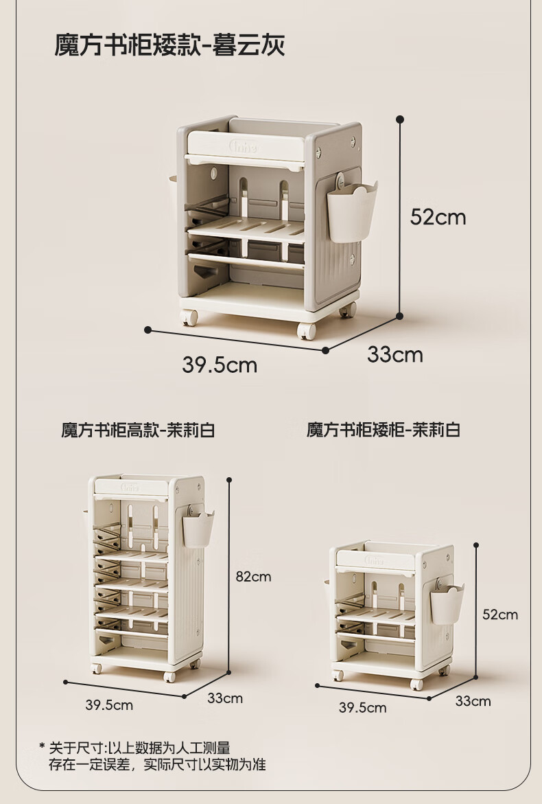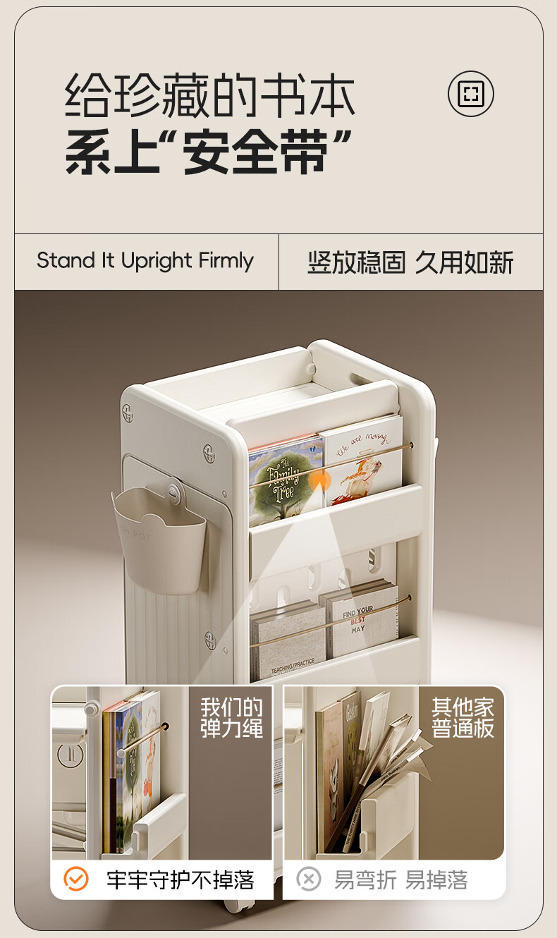 英禾儿童书架落地书包柜储物可移动小推车学习书本收纳神器简易书房 暮云灰-高款【横斜卡槽专利-顶板可移动】赠挂钩+挂盒