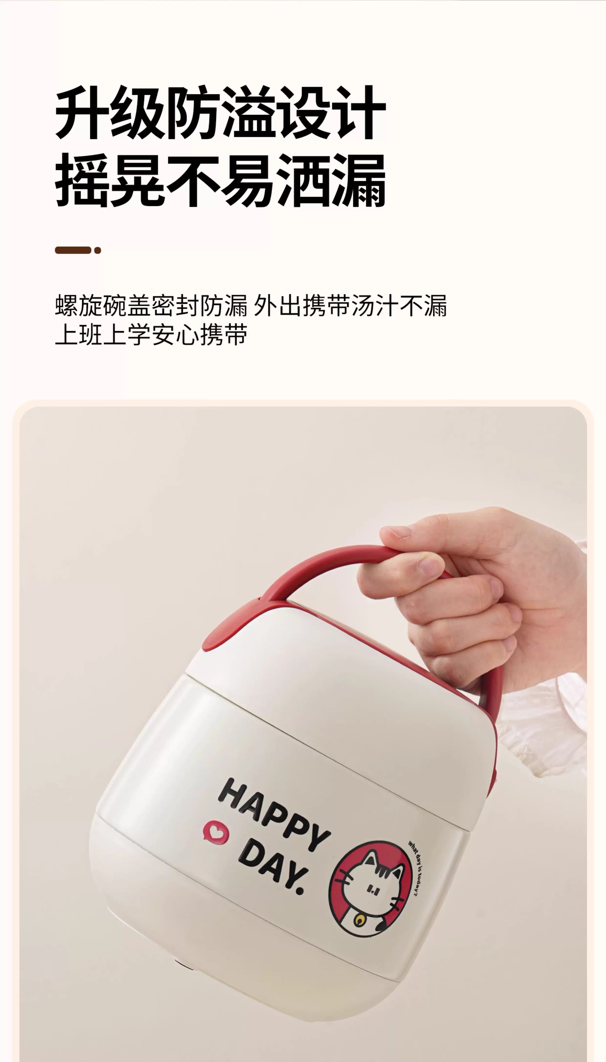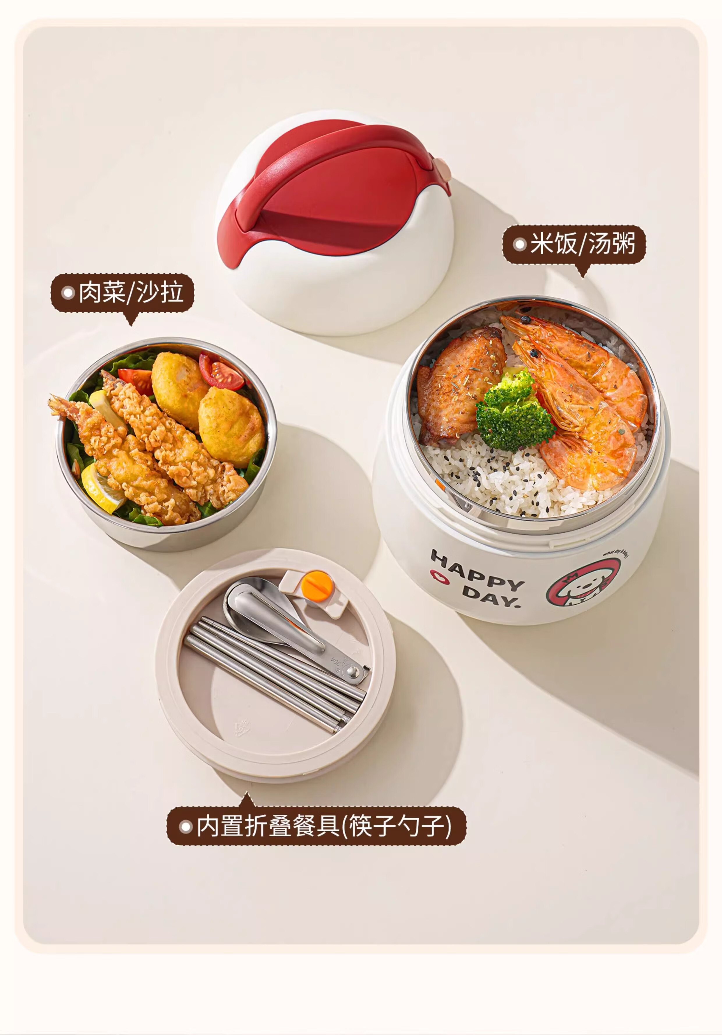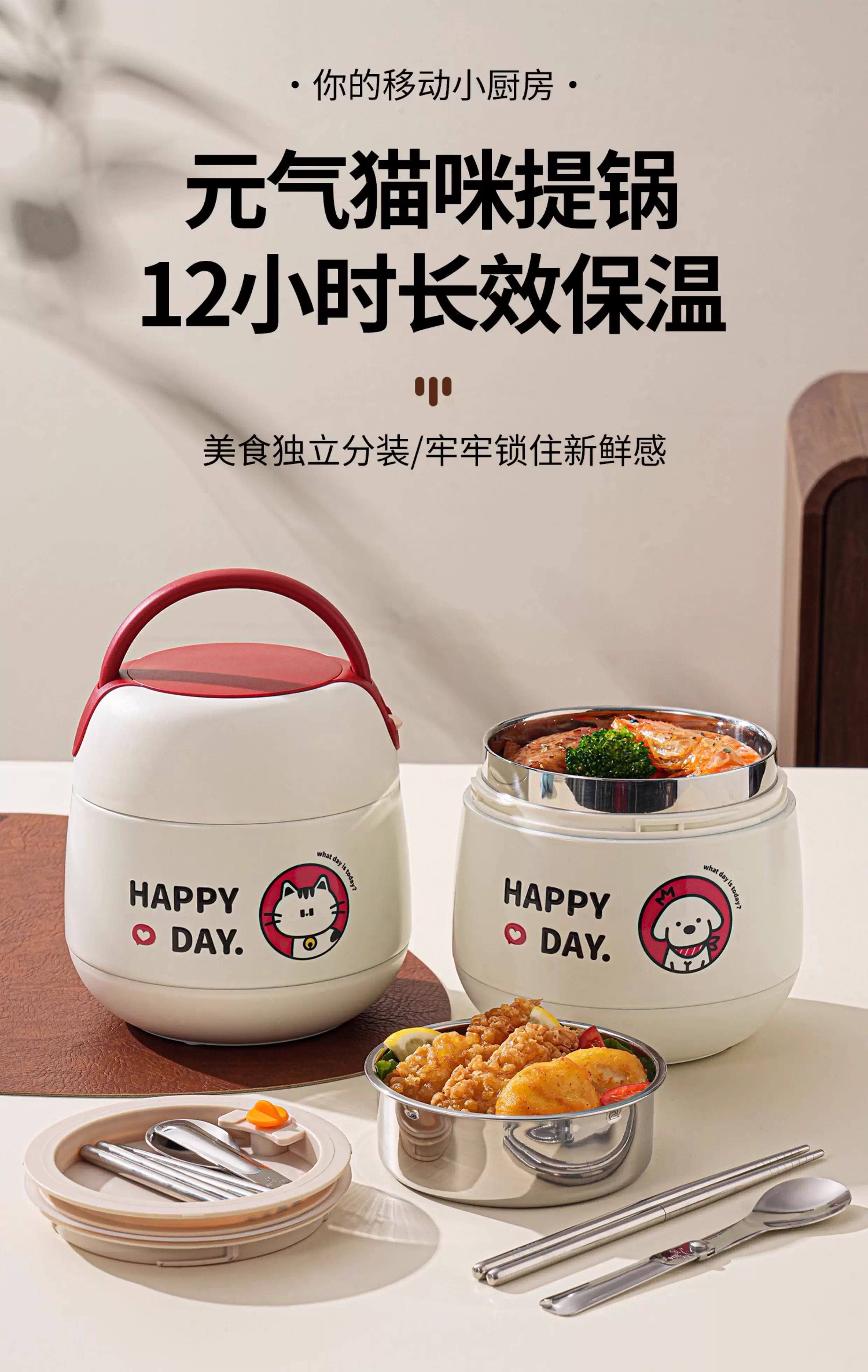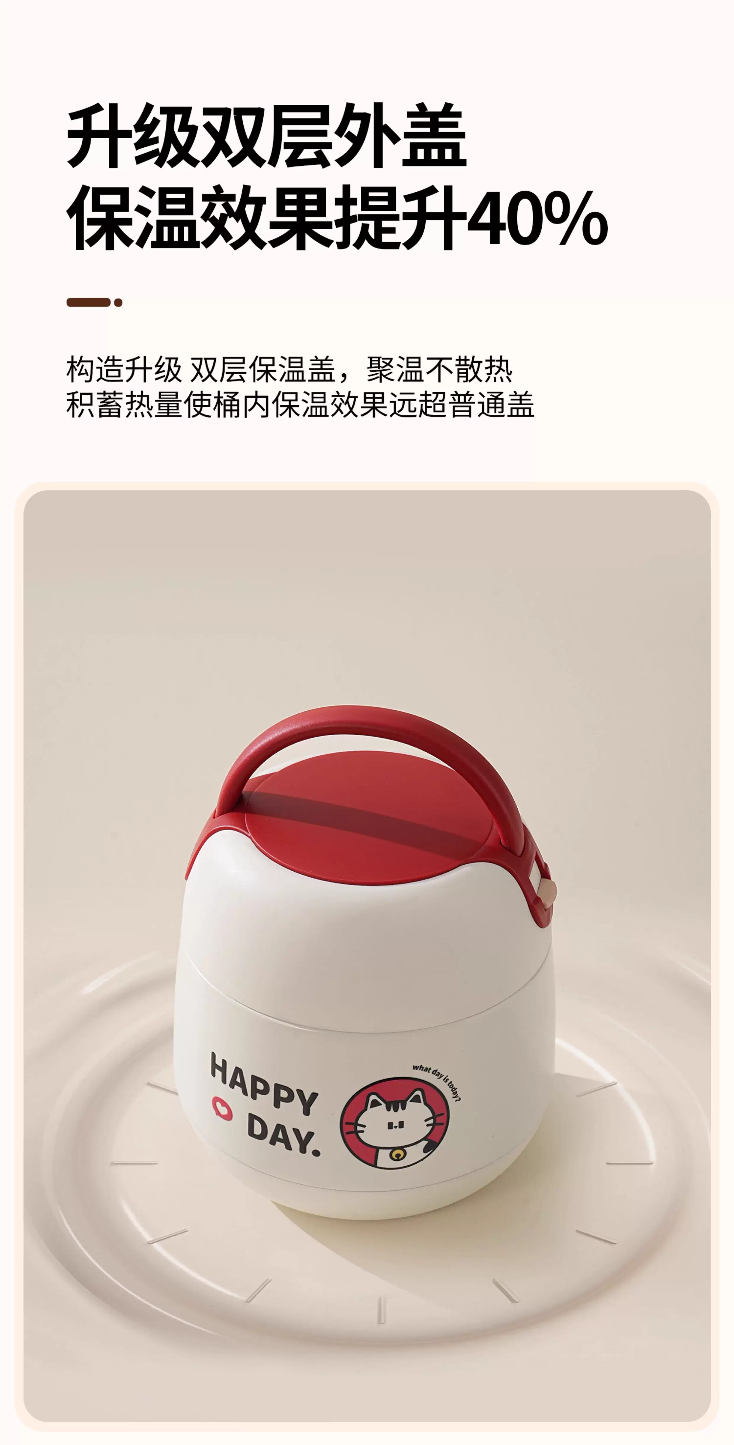 AILUKI日本保温桶饭盒24小时长效保温上班族小学生专用便当带饭提桶神器 白红-小猫1200ml【送折叠筷勺】