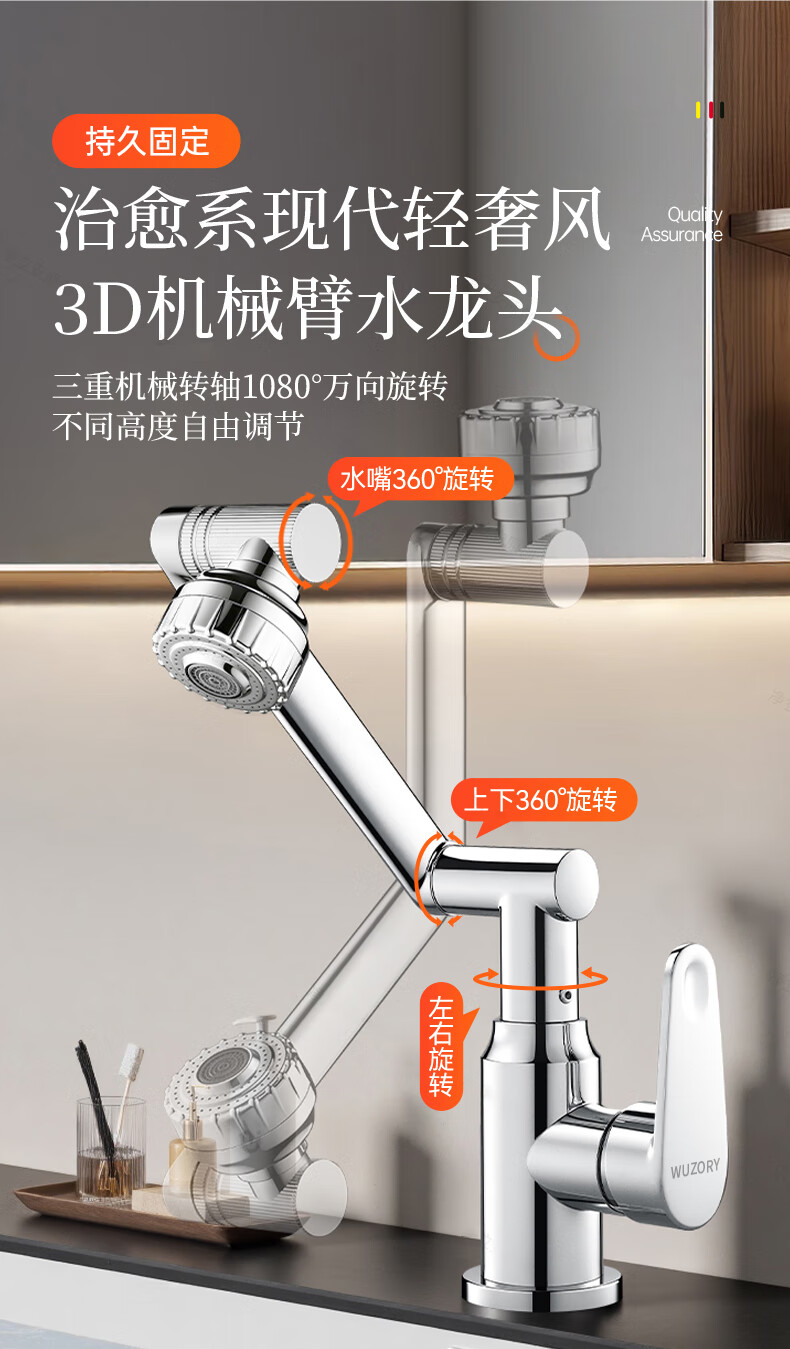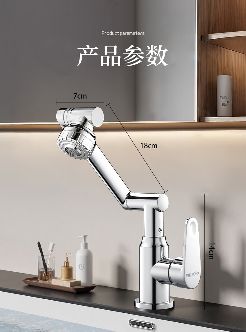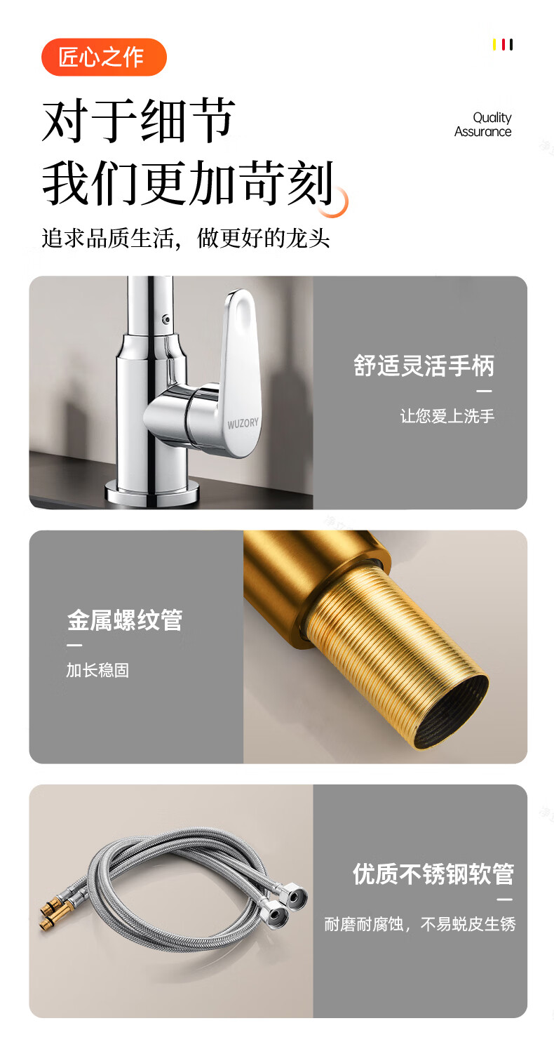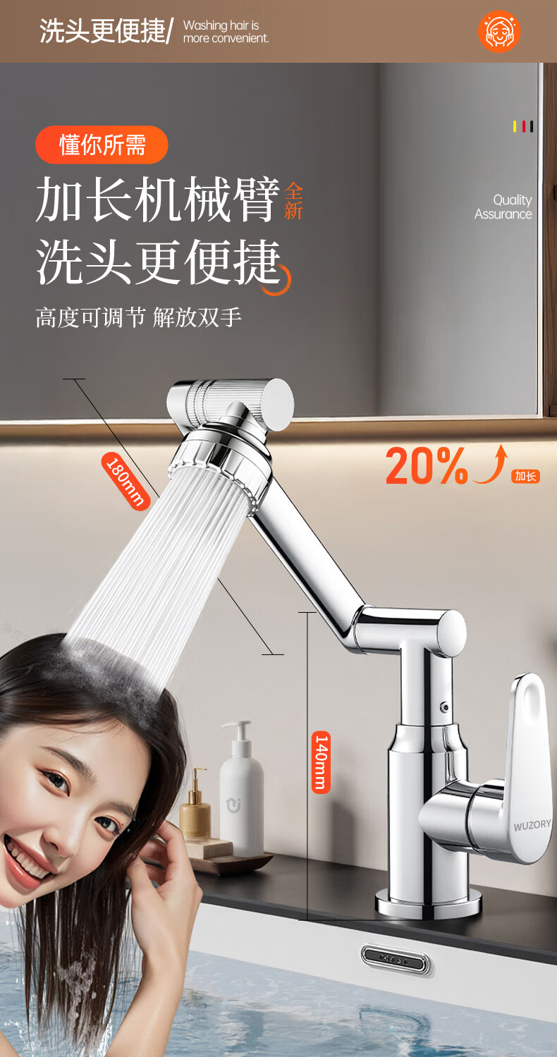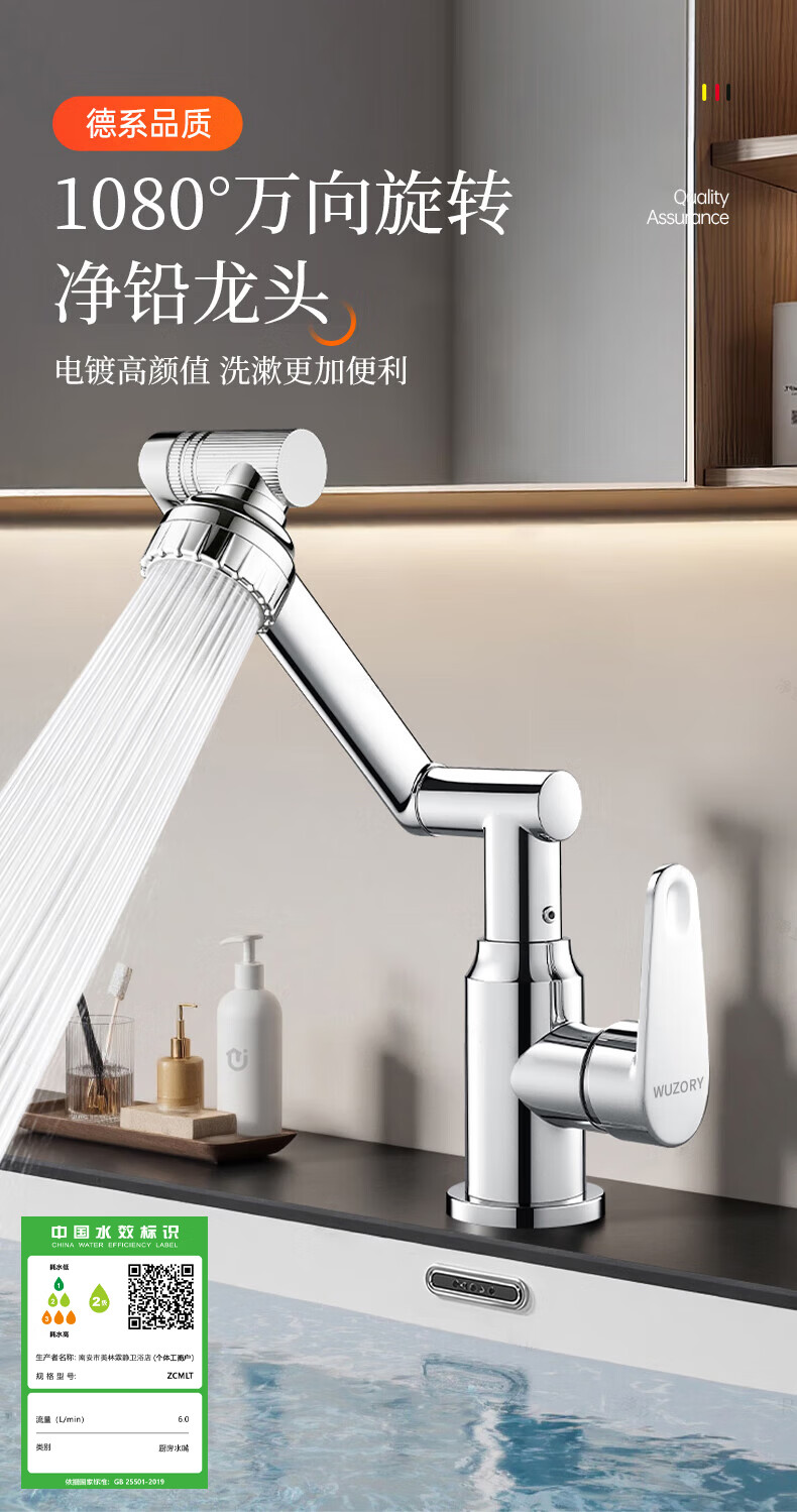 WUZORY【德国】水龙头洗手盆面盆冷热水二合一卫生间洗脸机械臂水龙头 【亮银】机械臂面盆水龙头 两档增压防溅丨配80CM防爆管*2