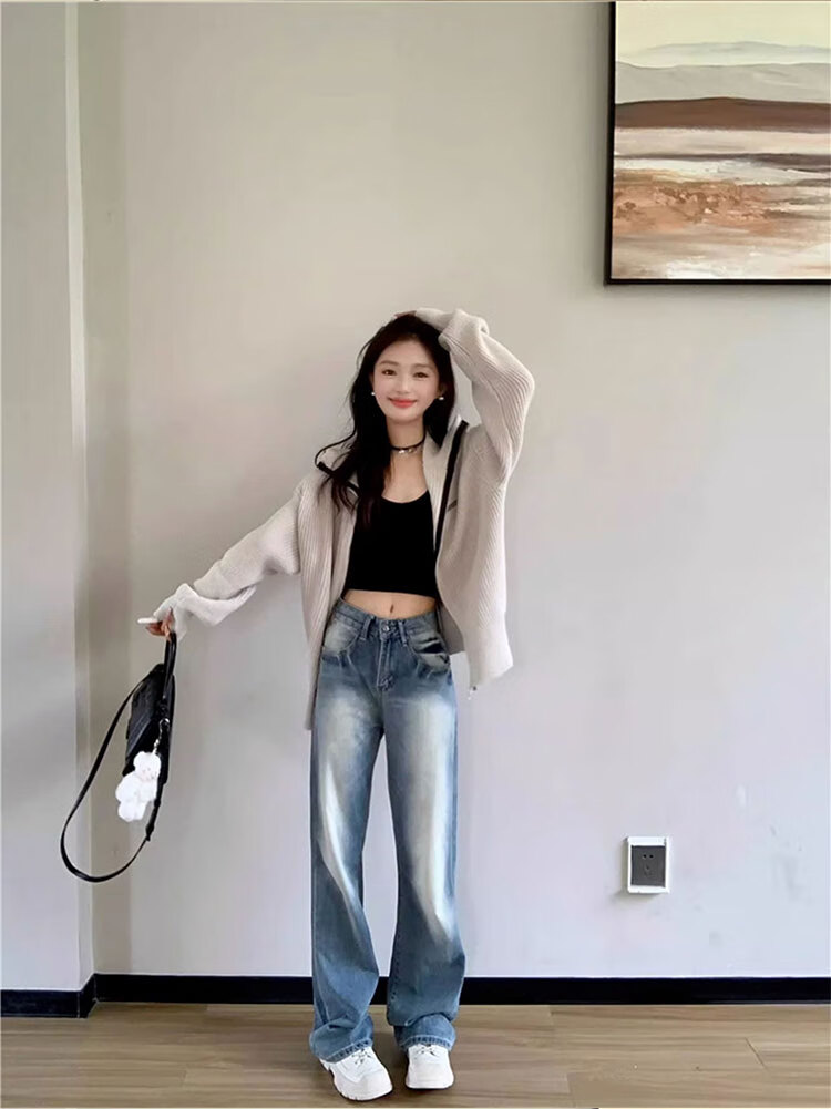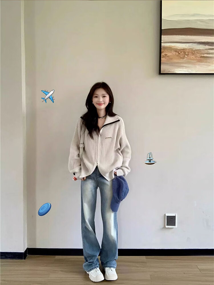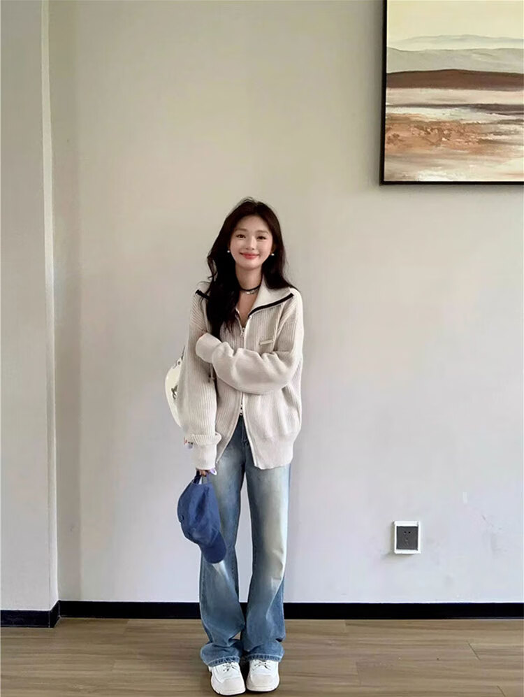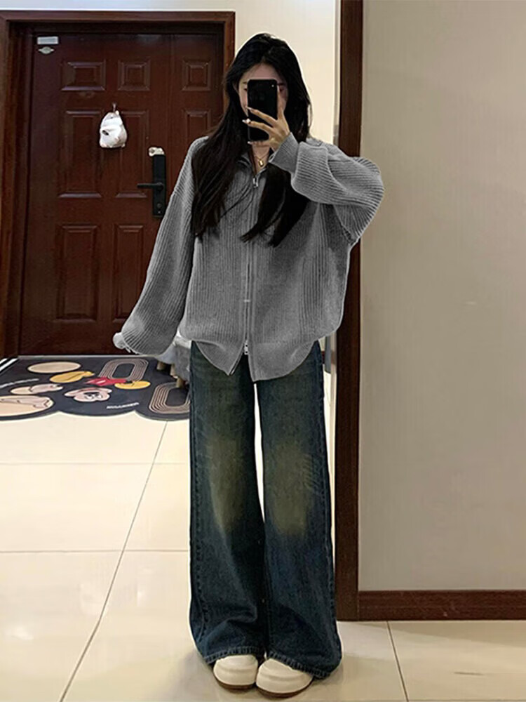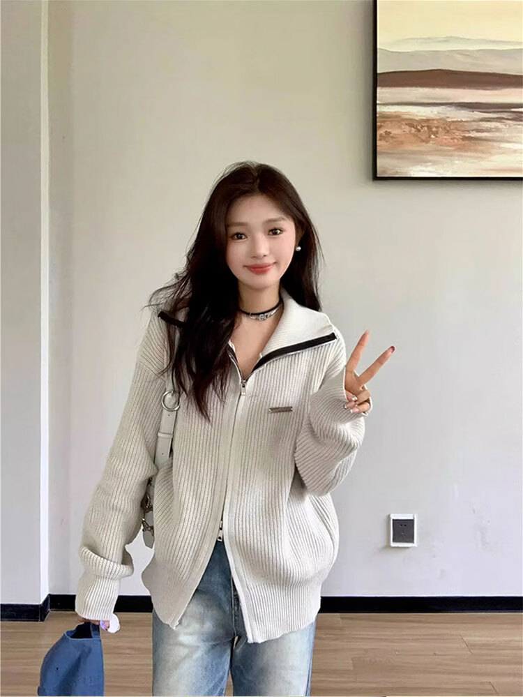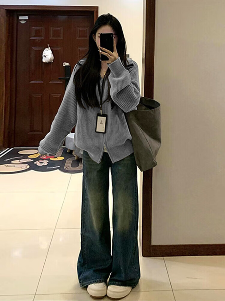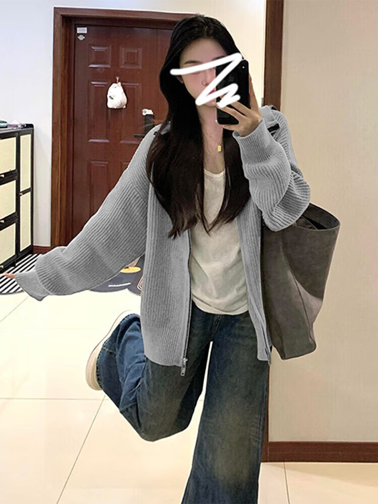 相伊恋人针织衫女秋冬2025新款开衫外套可外穿宽松显瘦拉链毛衣小香风上衣 米灰色【韩系复古抗起球】 均码 【适合80-140斤】